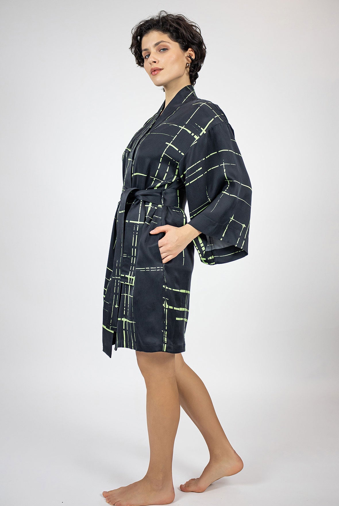 Silk Dreamscape Robe is a true embodiment of luxury and comfort. Made from washable 100% Mulberry Silk, this robe is exceptionally soft, providing a distinctive sensation of gentleness when touched. Designed with a relaxed straight cut, a front wrap-style, a belted waist, a shorter length, and an overall comfortable fit. Robe perfectly blends quality, style, and coziness.