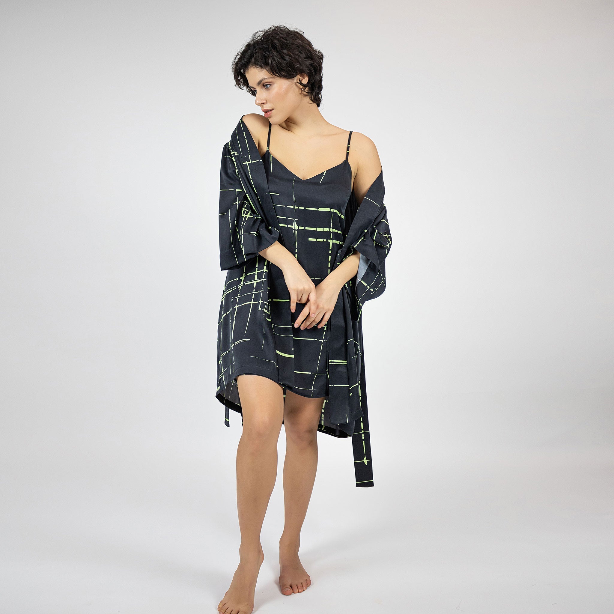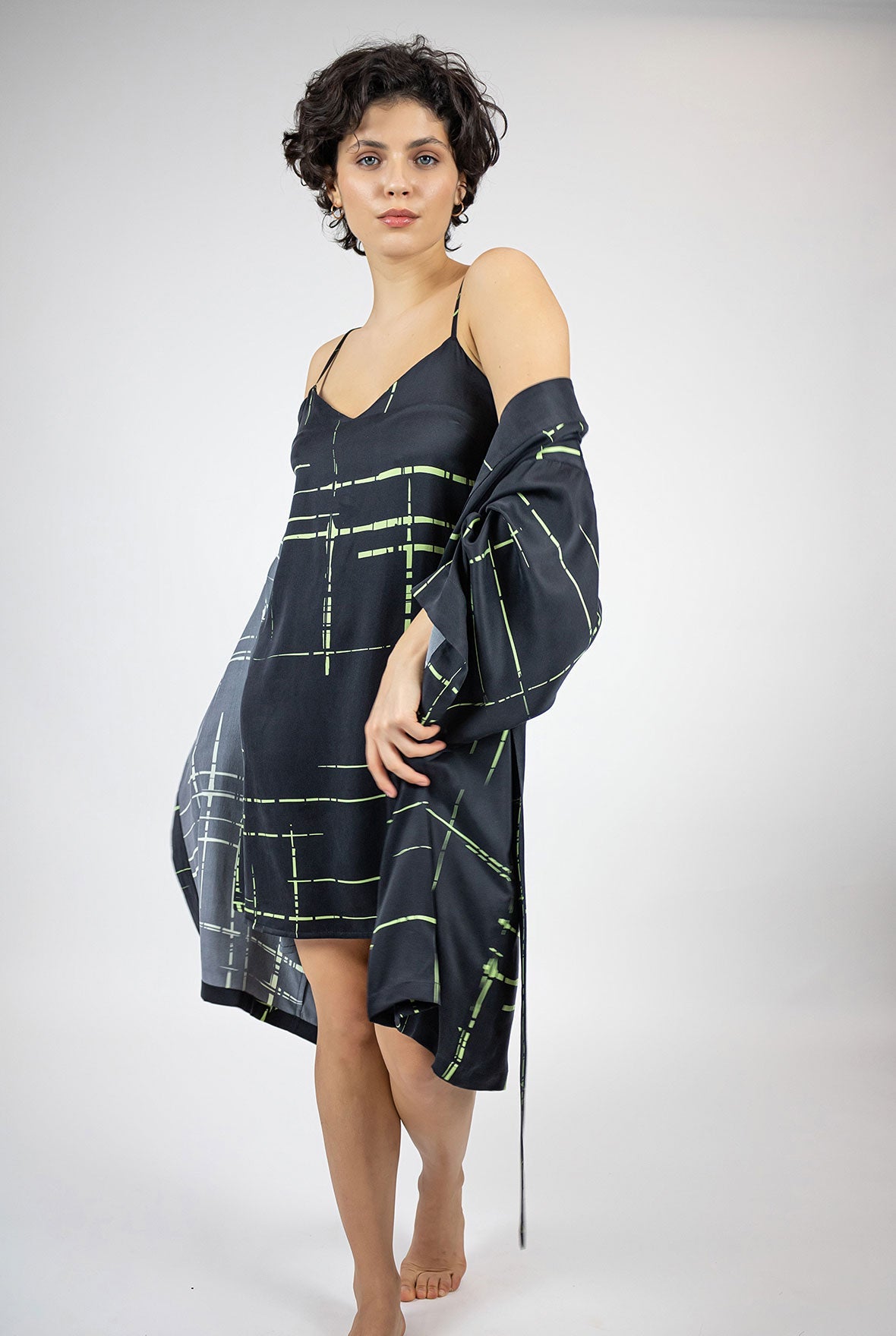 The captivating Cool Matcha print on the black silk surface creates a magical outfit, offering a sense of rest and reflection.