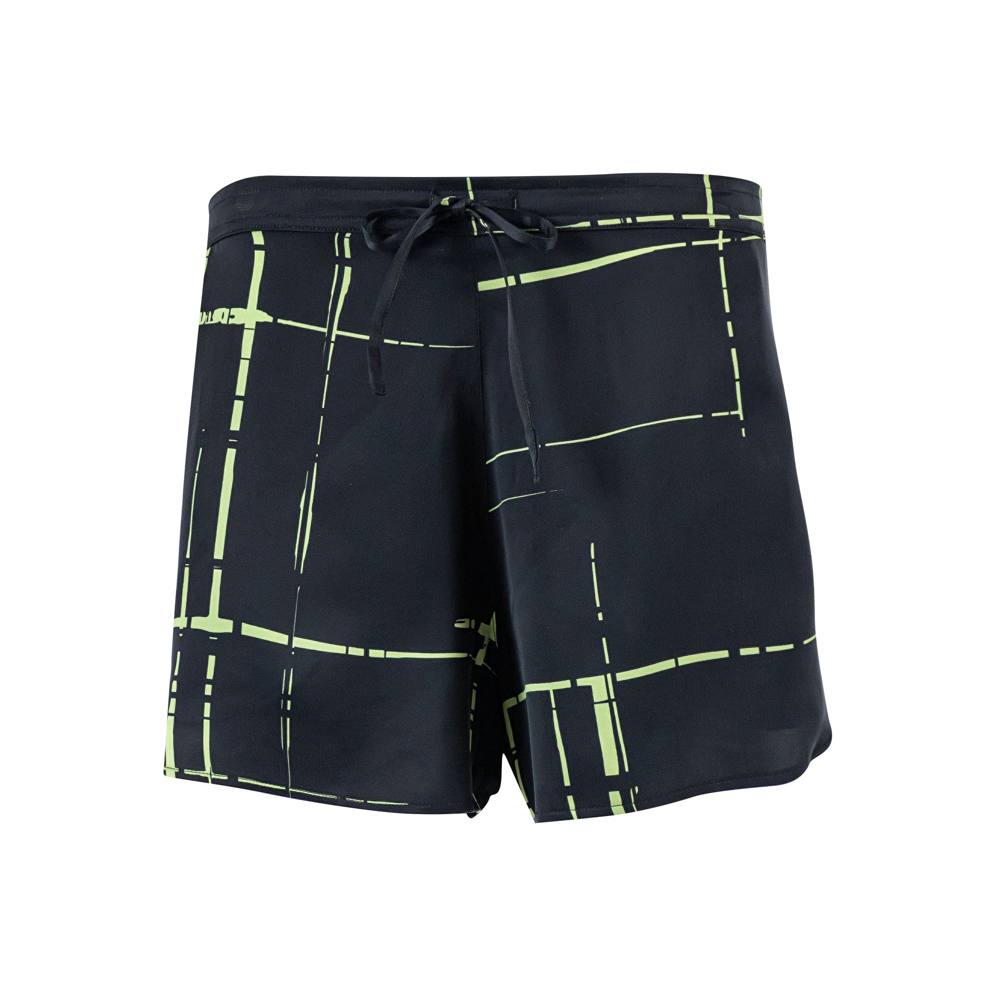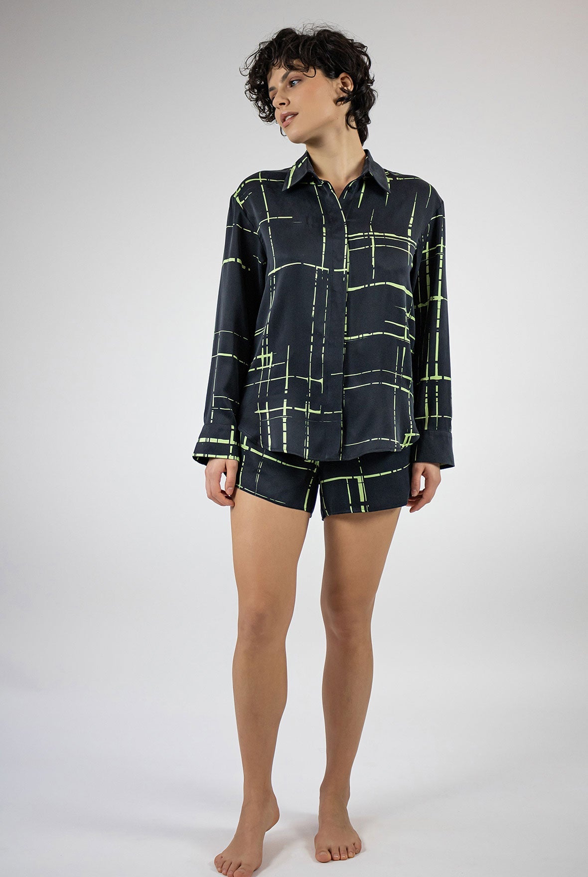 The comfortable and stylish Silk Dreamscape shorts from NOKAYA, made from washable, 100% Mulberry Silk. The garment incorporates an elasticated waistband with a drawstring closure, complemented by practical pockets for enhanced usability.