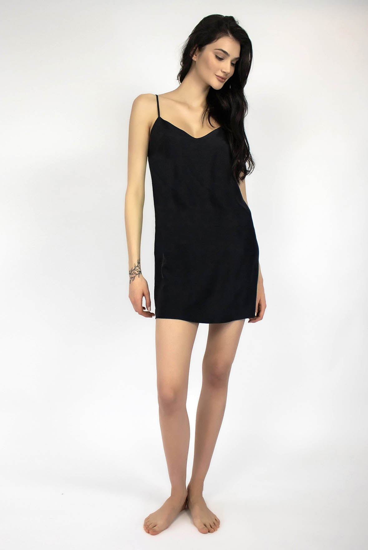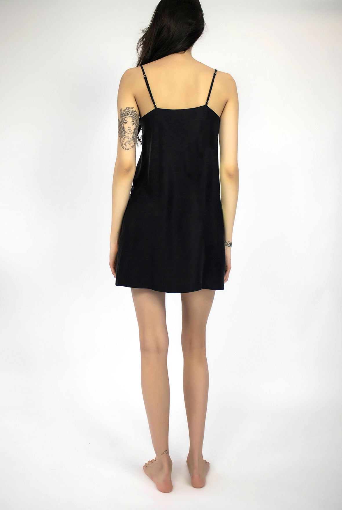 The Dreamscape Silk Slip Dress is meticulously crafted from 100% Mulberry Silk, featuring a sophisticated black hue that, an all-season favourite, gracefully enhances the figure and cascades elegantly to a mini length.