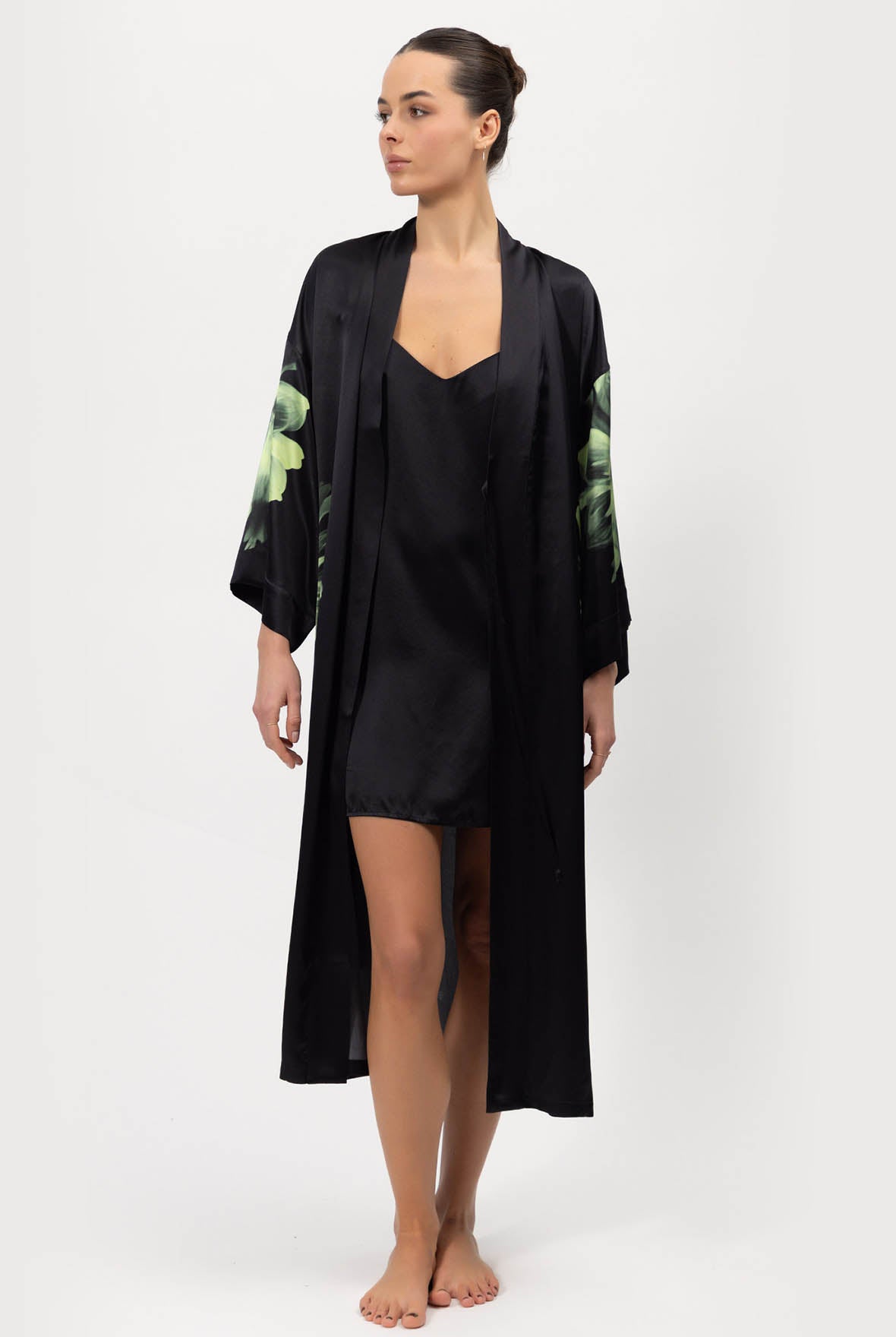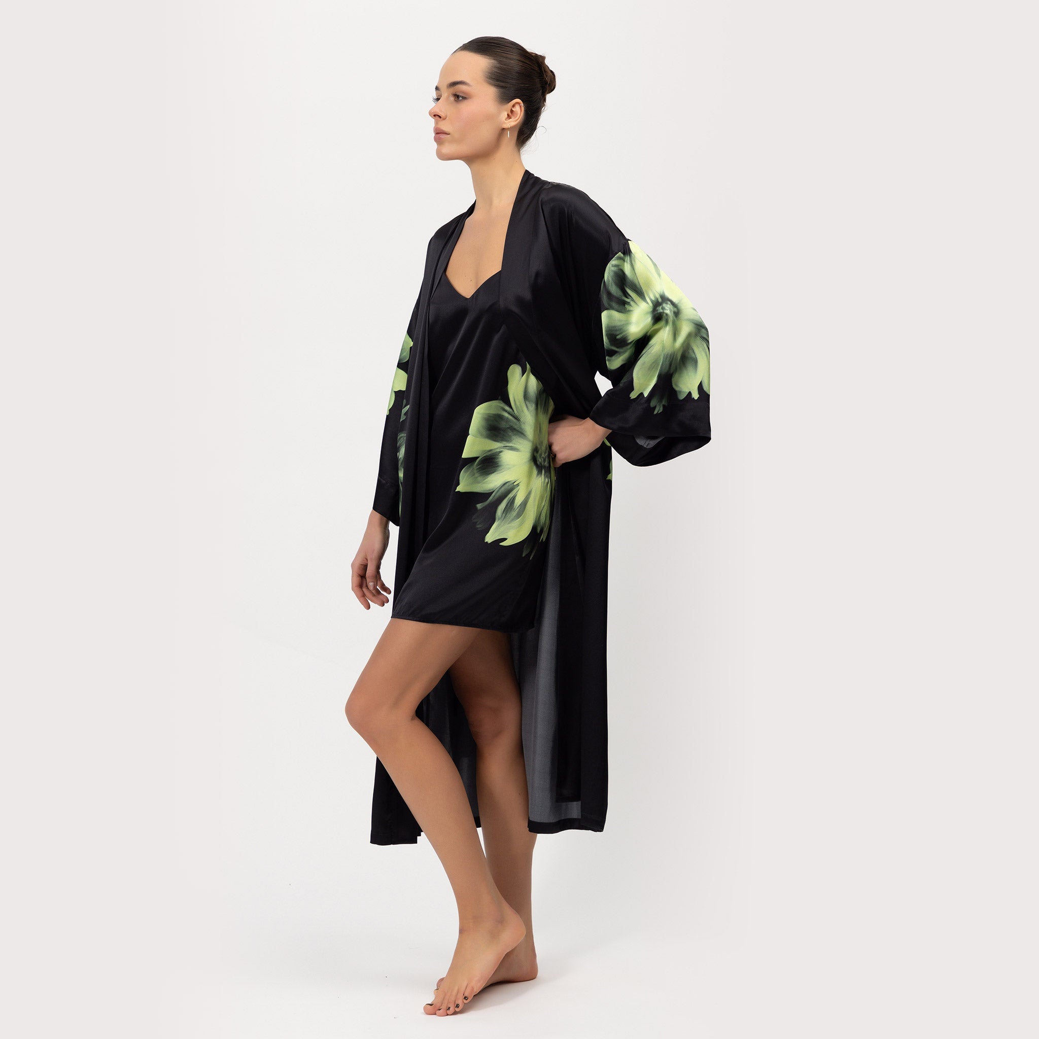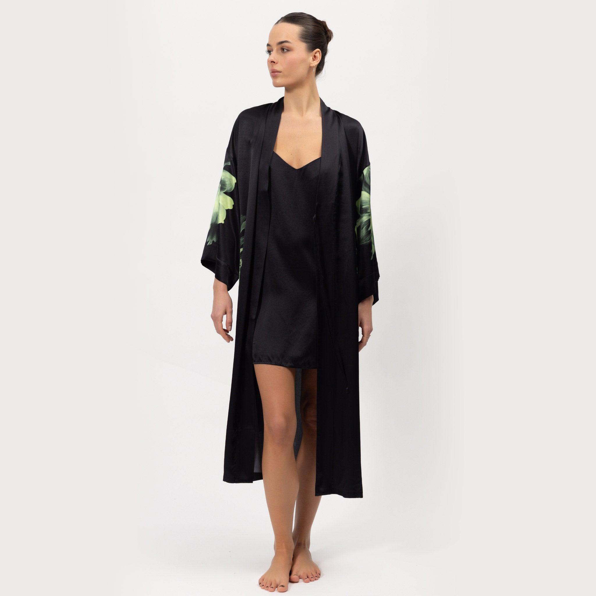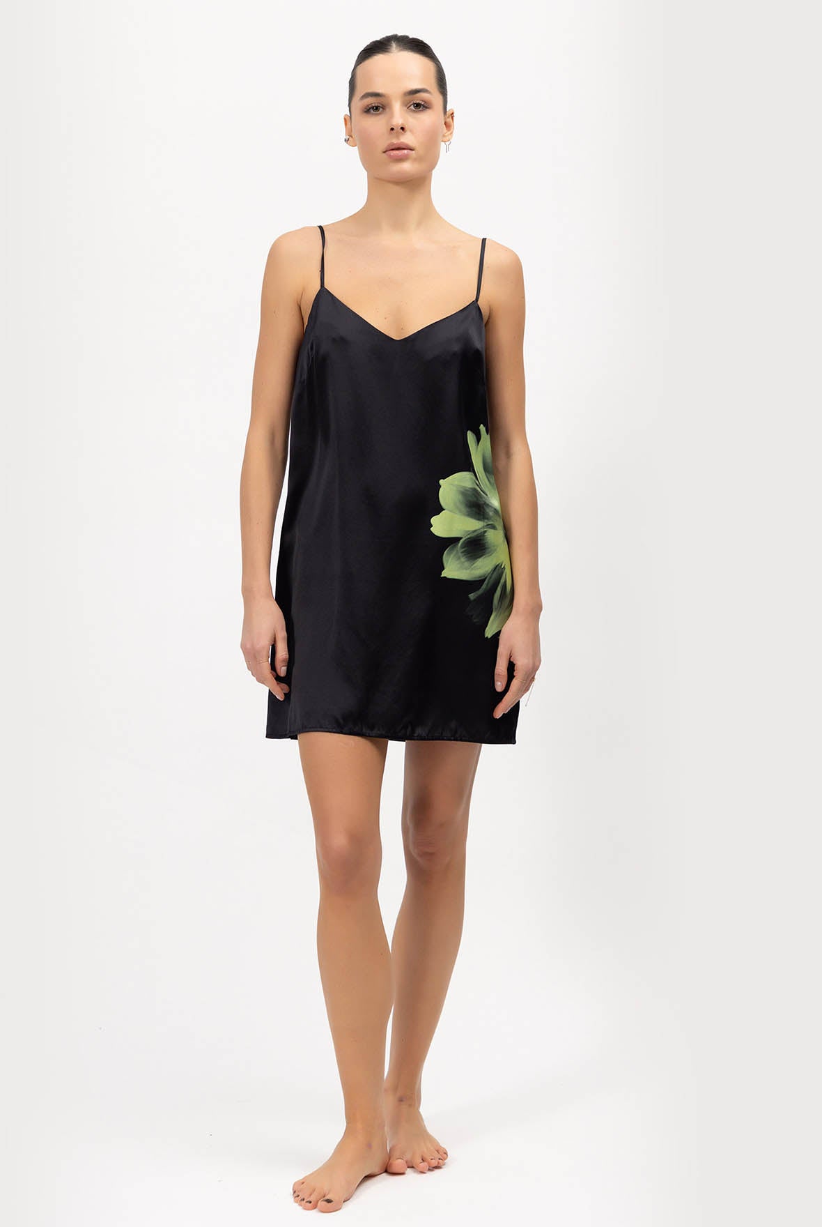 The Dreamscape Silk Slip Dress is designed from 100% washable Mulberry Silk. The Cool Matcha Flower on a black silk background gracefully enhances the figure, soothes the mind, and brings a sense of rest and reflection.
