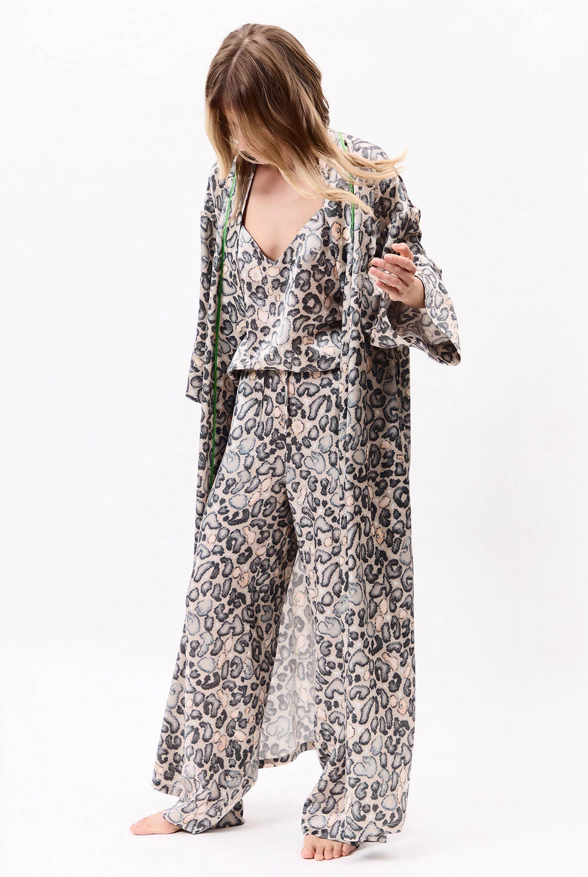 The fluidity of the silk meets a strong visual rhythm, with Snow Leopard as the base — bold yet grounded, creating presence without excess.