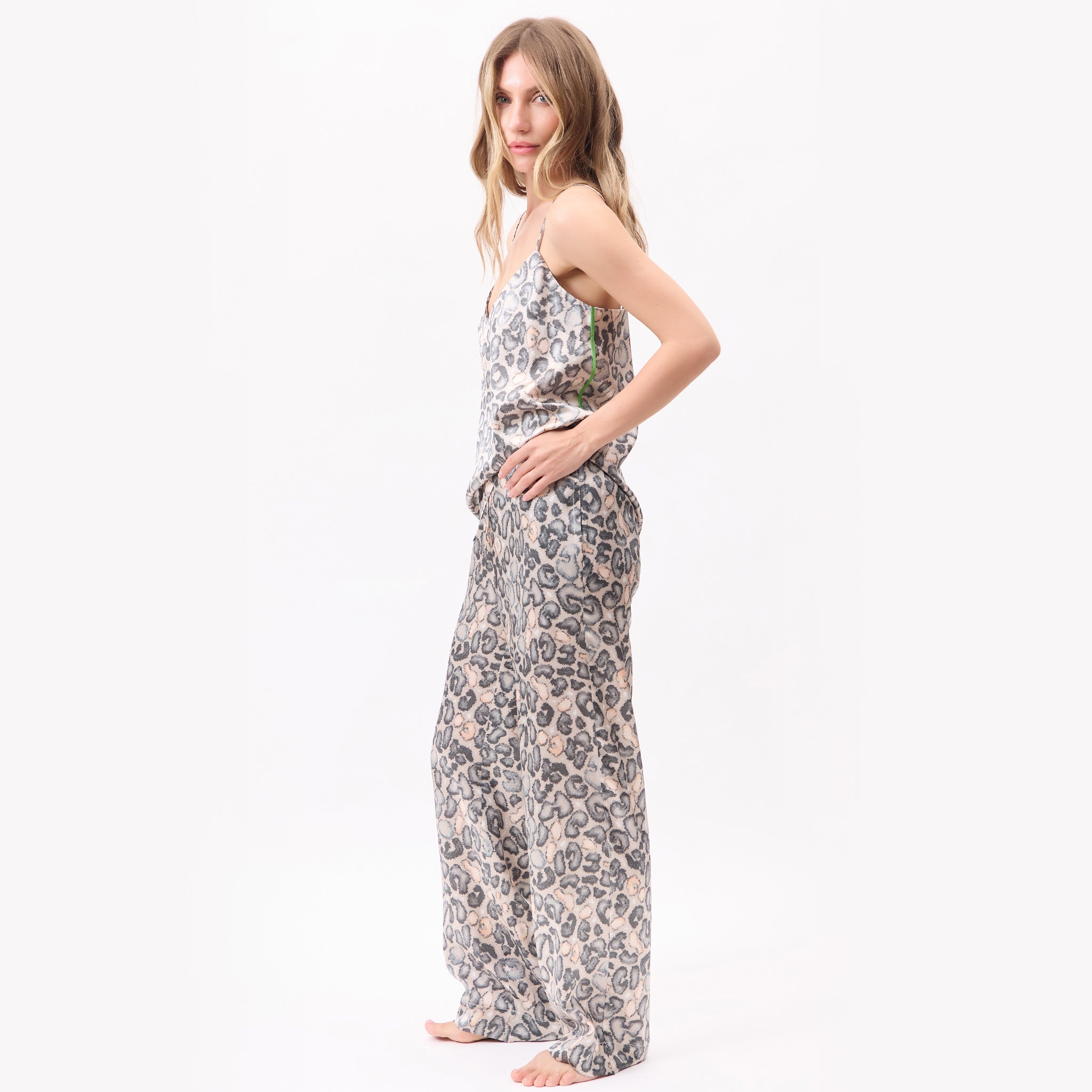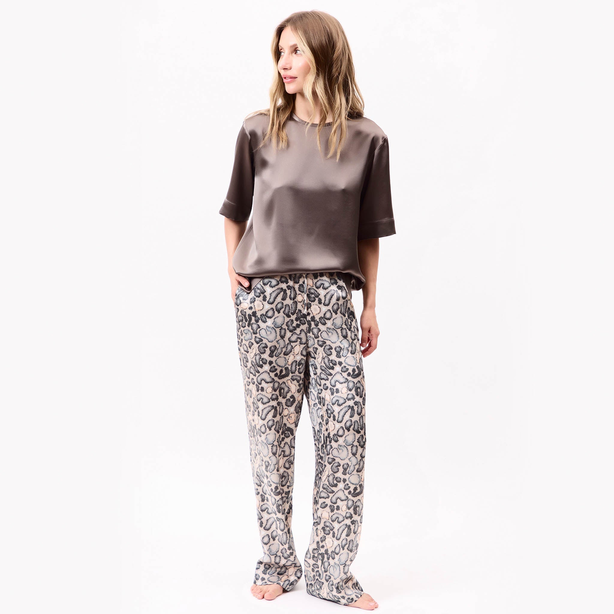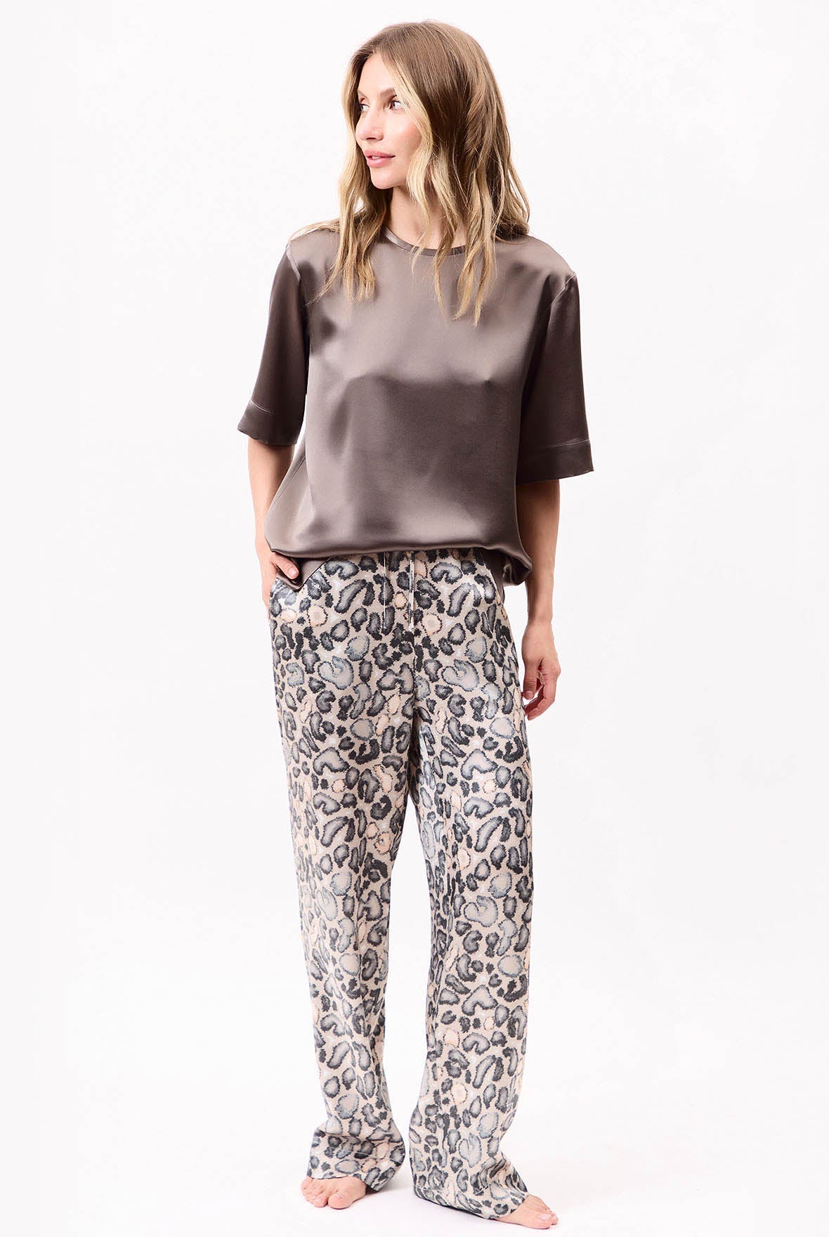 Designed from Mulberry Silk with a straight, relaxed leg and an elastic waistband, the Animal Print pants offer freedom of movement without sacrificing polish.