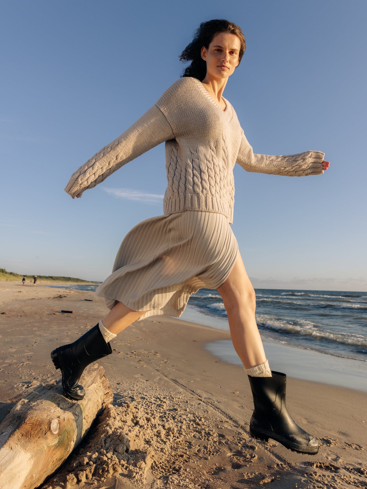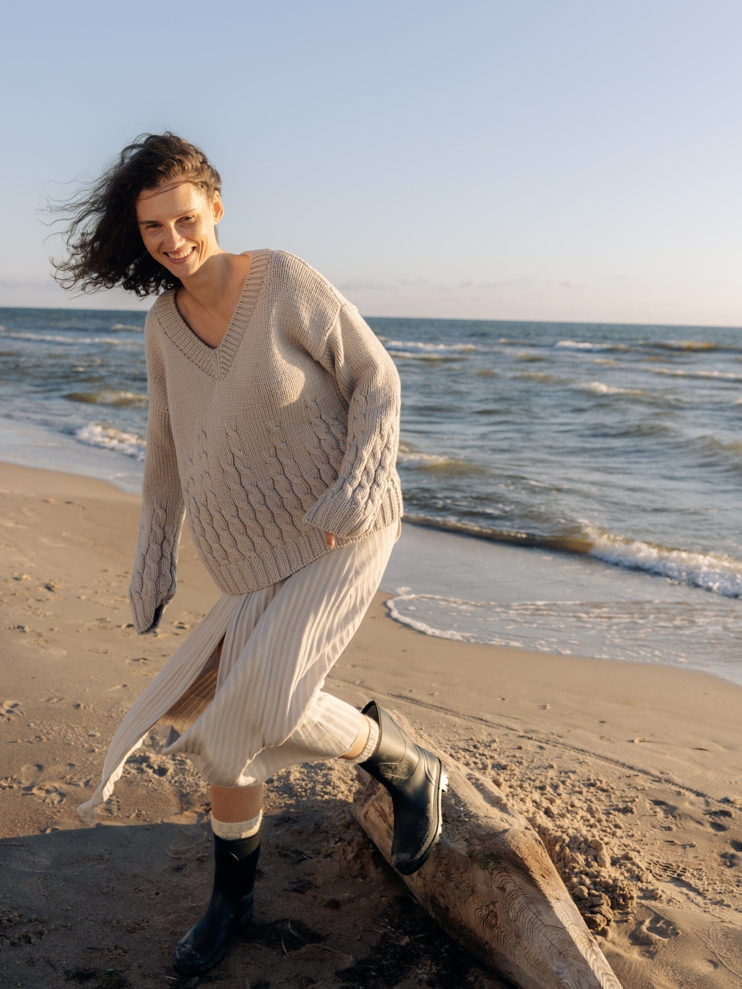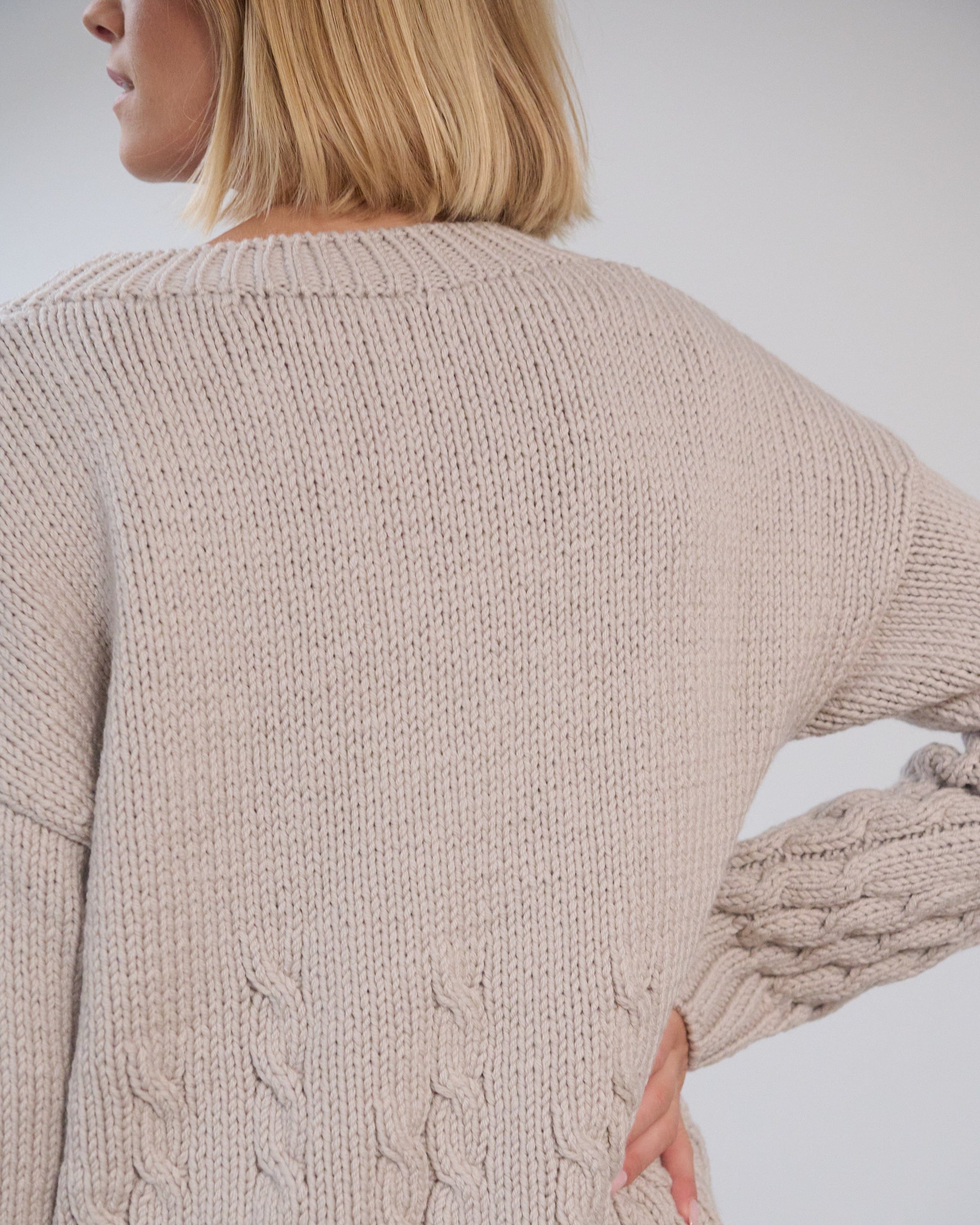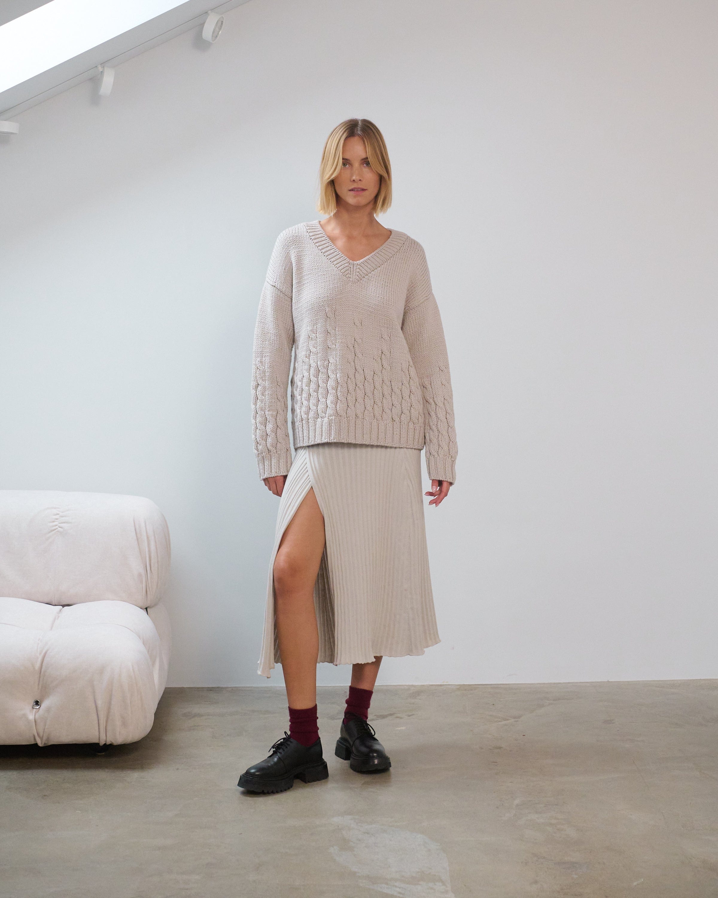 The irregular cables of our Slėniai Sweater mimic the rise and fall of the Lithuanian hills that inspired its name. Hand-knitted from premium certified merino wool, this V-neck sweater is naturally chunky with a stretchy texture, ensuring warmth during the colder months.