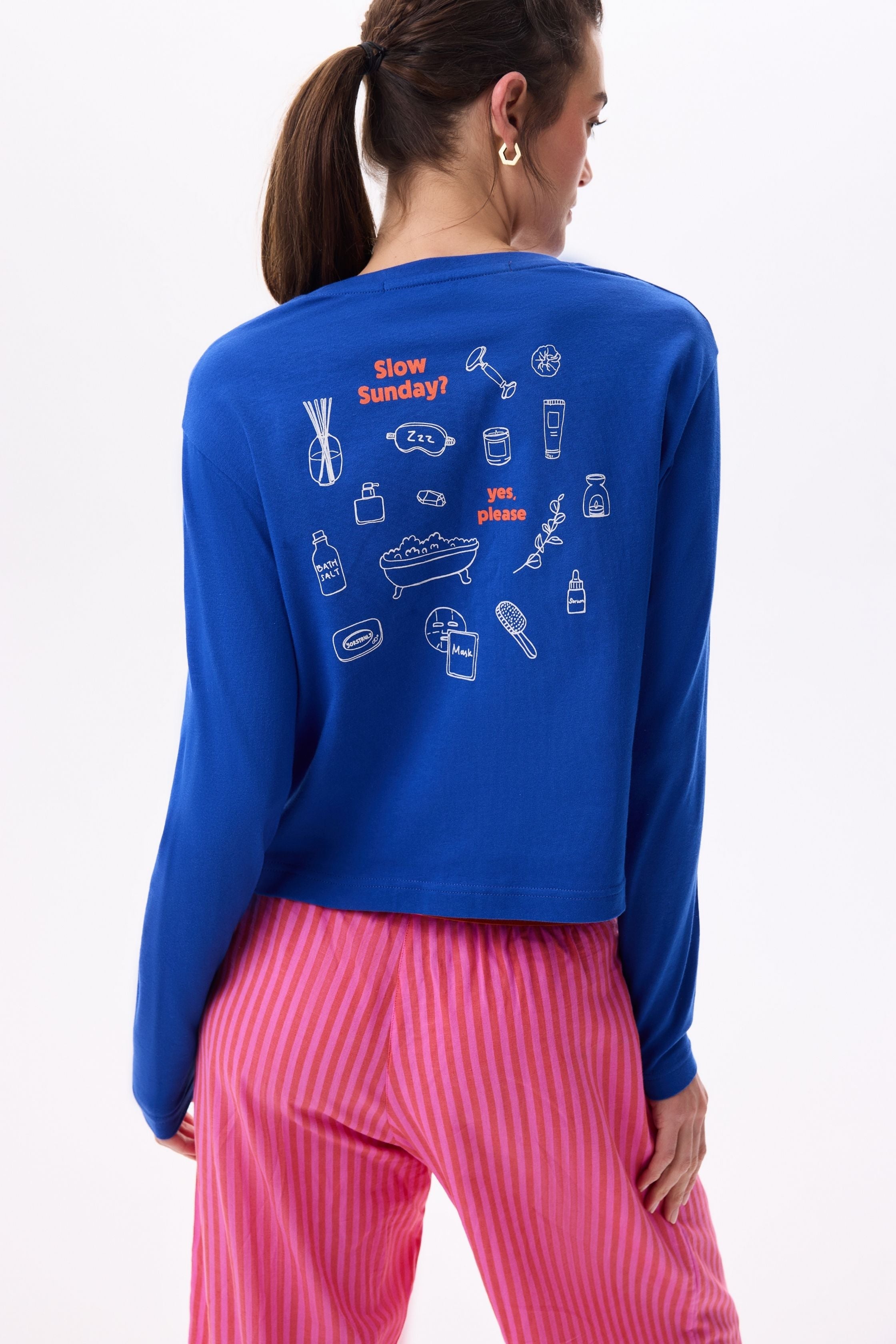 A long-sleeved, slightly cropped, 100% cotton printed t-shirt. On the front, there’s a sweet illustration as a reminder for those who love the scent of white soap, and on the back, you'll find a cute design featuring all the details of a SLOW SUNDAY.
