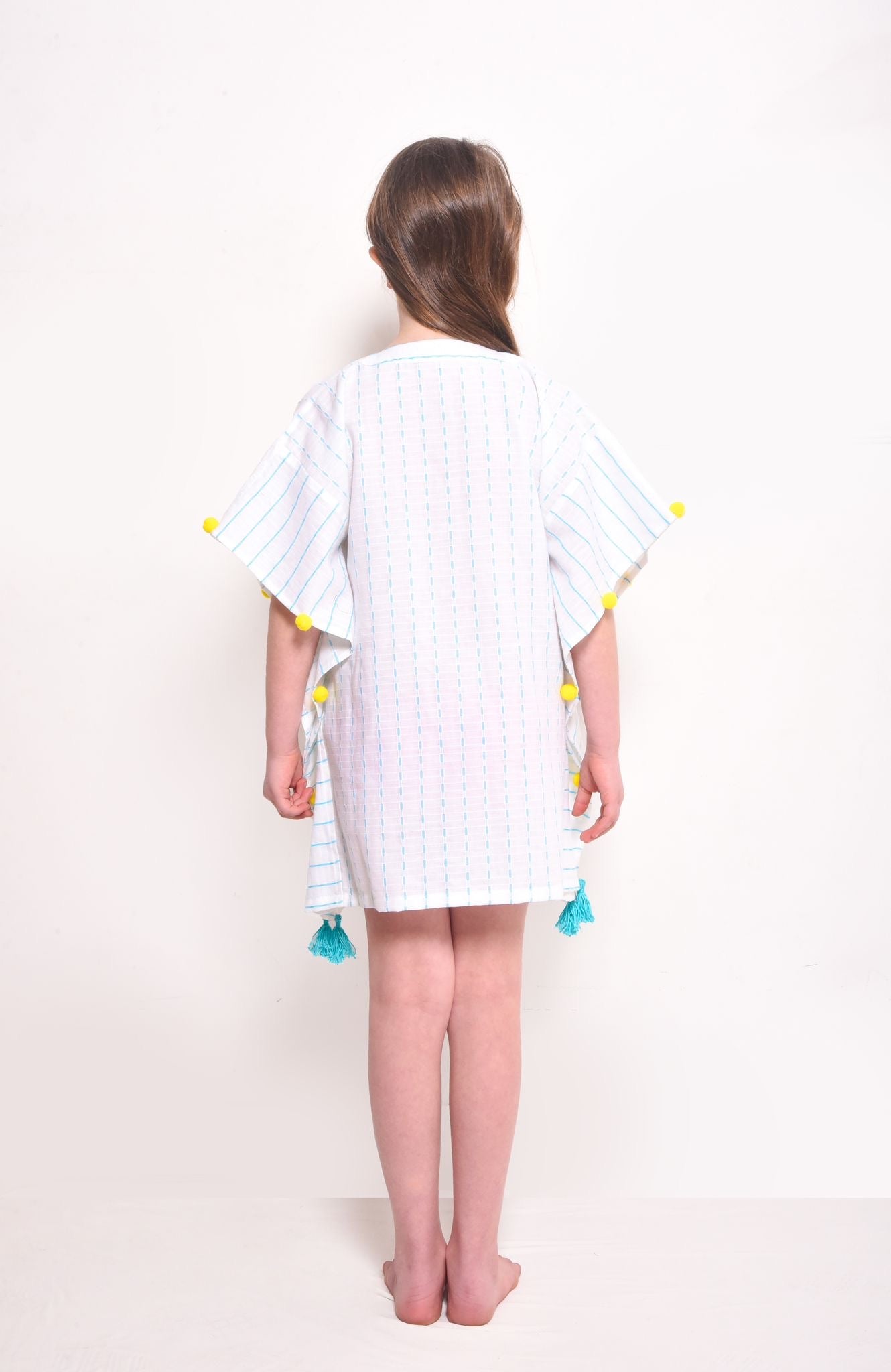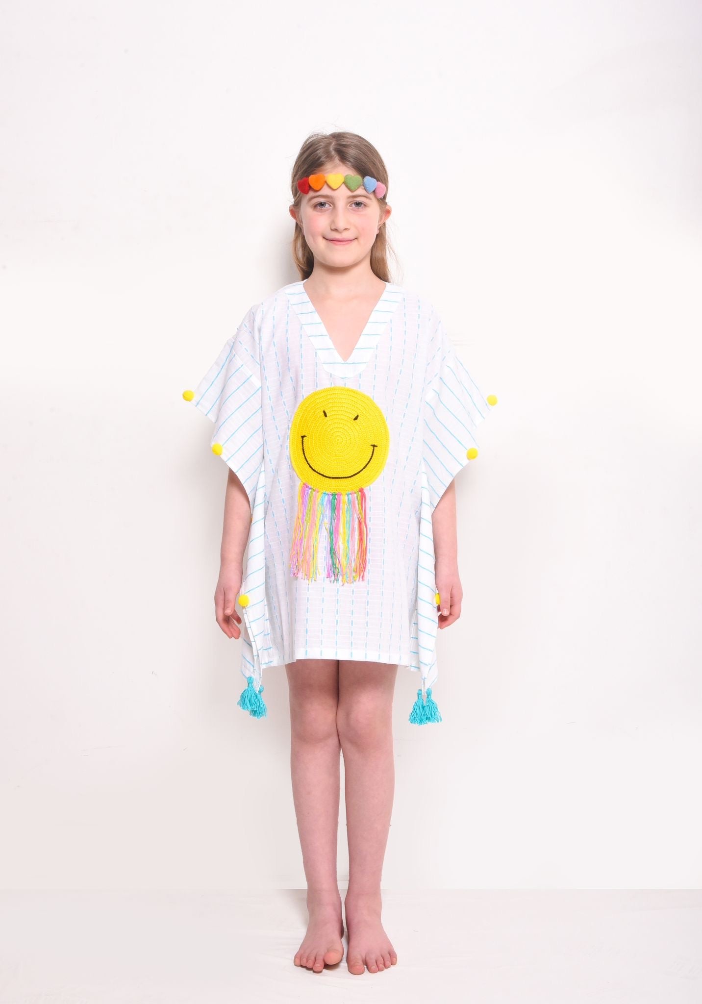 Elevate her beachwear with our charming girls' cotton beach tunic, featuring a whimsical touch of handmade crochet- a delightful smiley motif. Crafted with soft and breathable cotton fabric, this tunic ensures comfort and style under the sun. The handmade crochet smiley adds a playful and unique flair, perfect for sunny days by the shore.