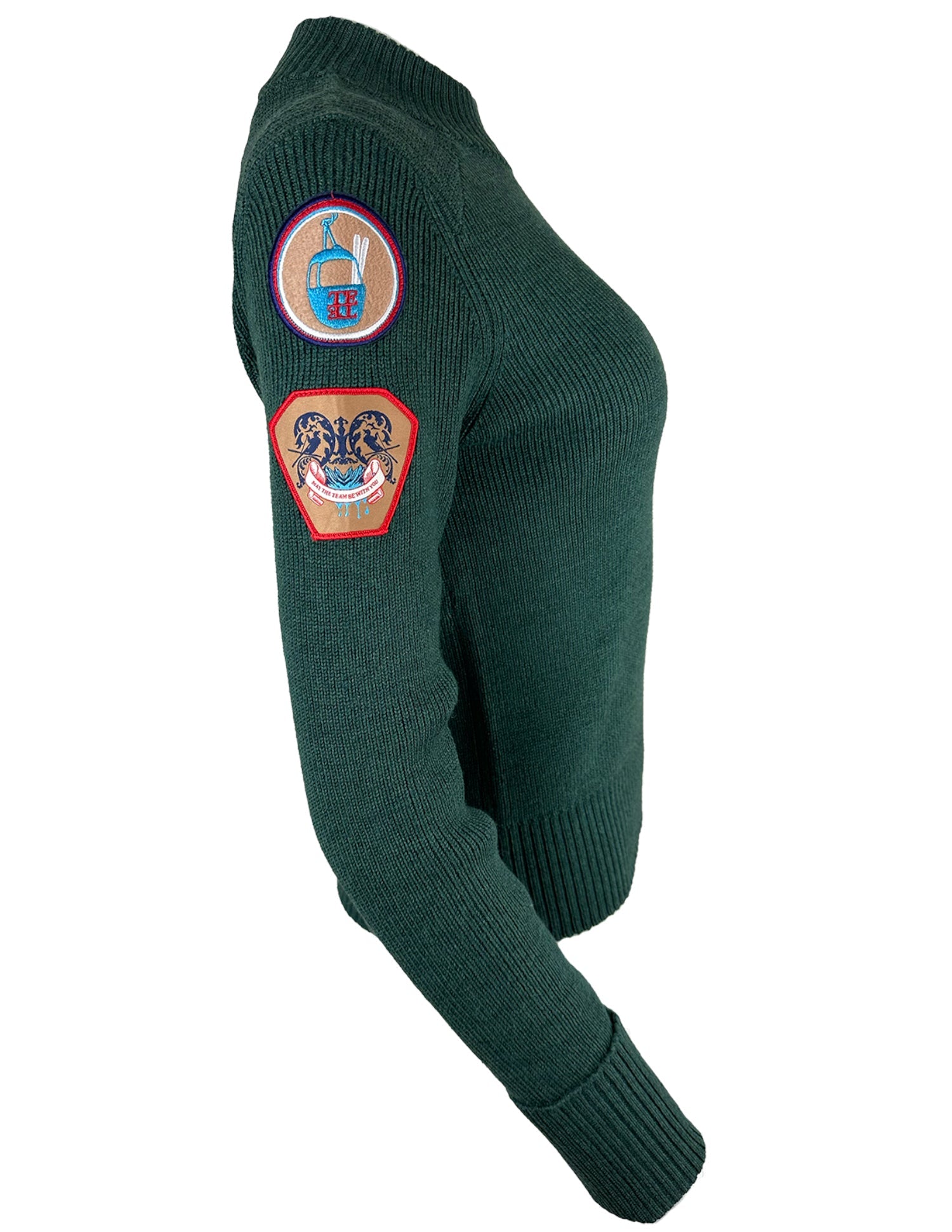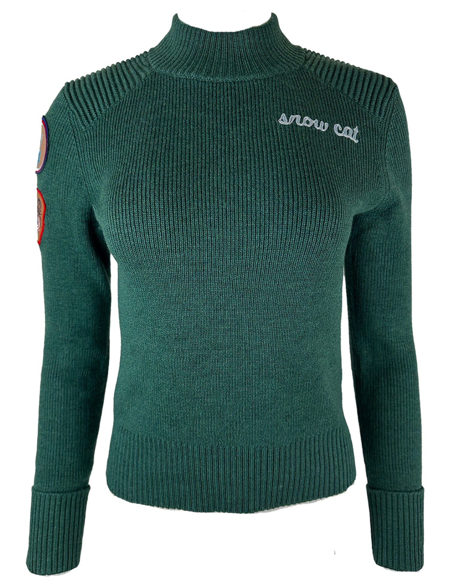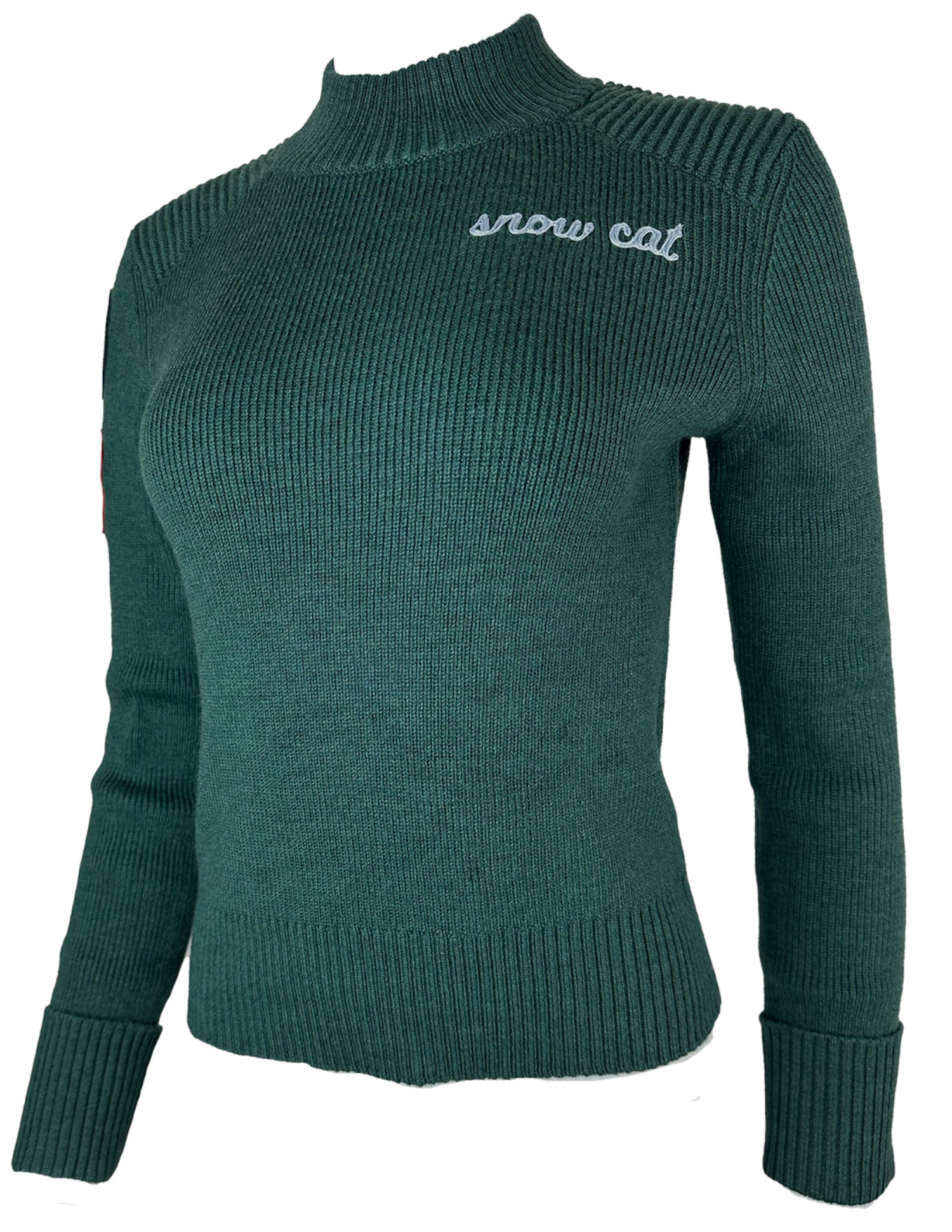 Hey Snow Cat! You look groomed and ready for the slopes -- OR for Après by the slopes!! This rib knit funnel neck takes inspo from military sweaters. "Snow Cat" is embroidered across the left chest, while the right side sleeve features original patch artwork by Park City Artist Elizabeth Carrington, an alumnus of the early Winter X Games.