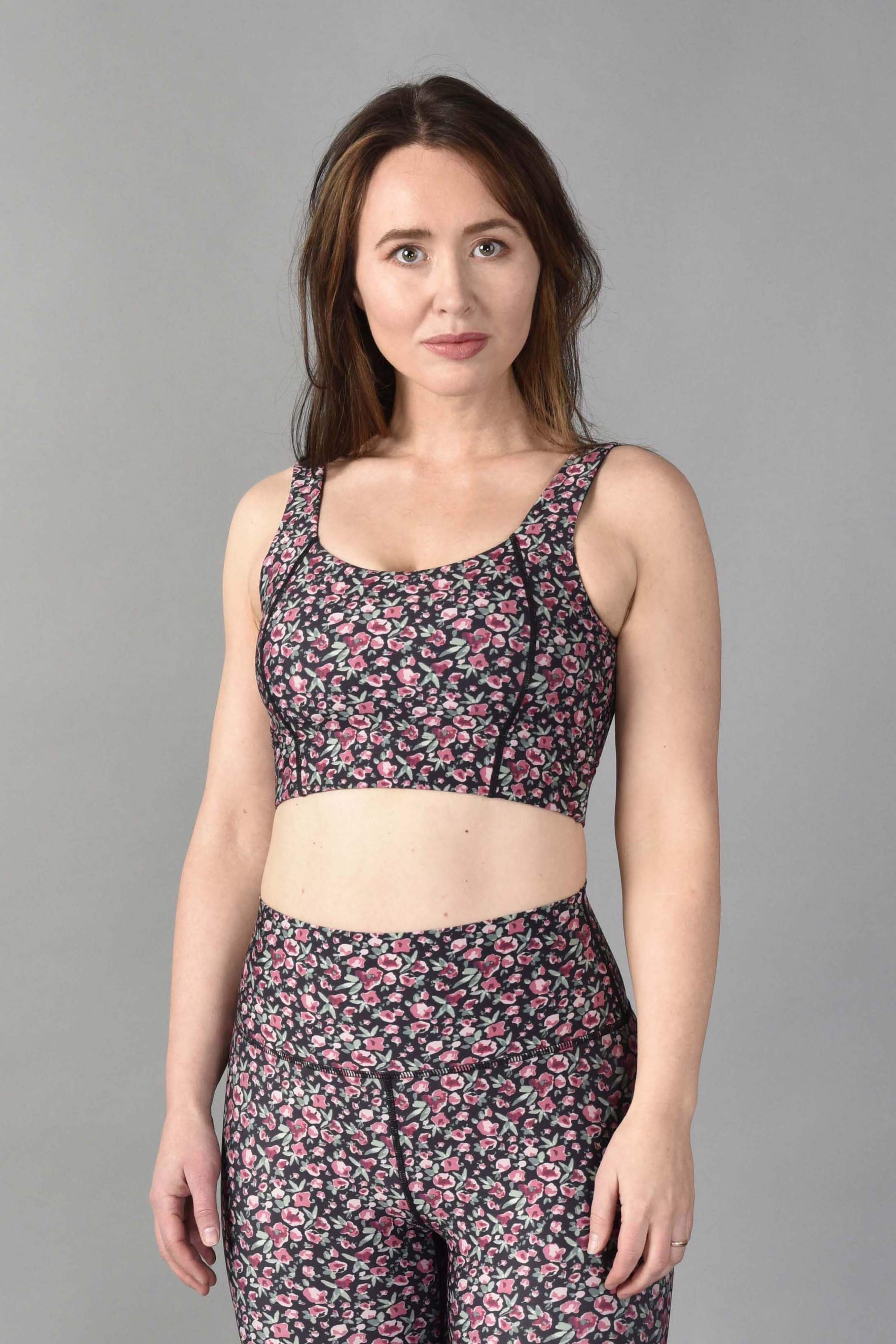 Experience the luxurious comfort of our buttery soft floral printed sports bra made from premium recycled materials. It's lightweight, breathable, wireless, and offers medium support- perfect for yoga, pilates, and studio sessions. Upgrade your workout wardrobe and indulge in both style and comfort today!