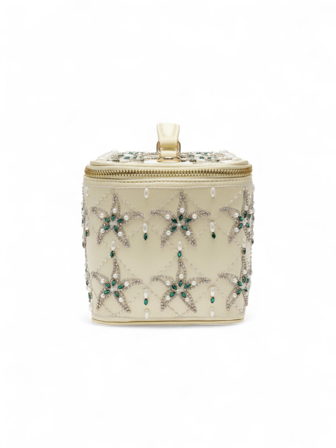 This chic vanity-style bag features a built-in mirror and a detachable shoulder strap, beautifully adorned with hand-embellished elements. A perfect blend of elegance and craftsmanship, it’s your new statement accessory for any occasion.