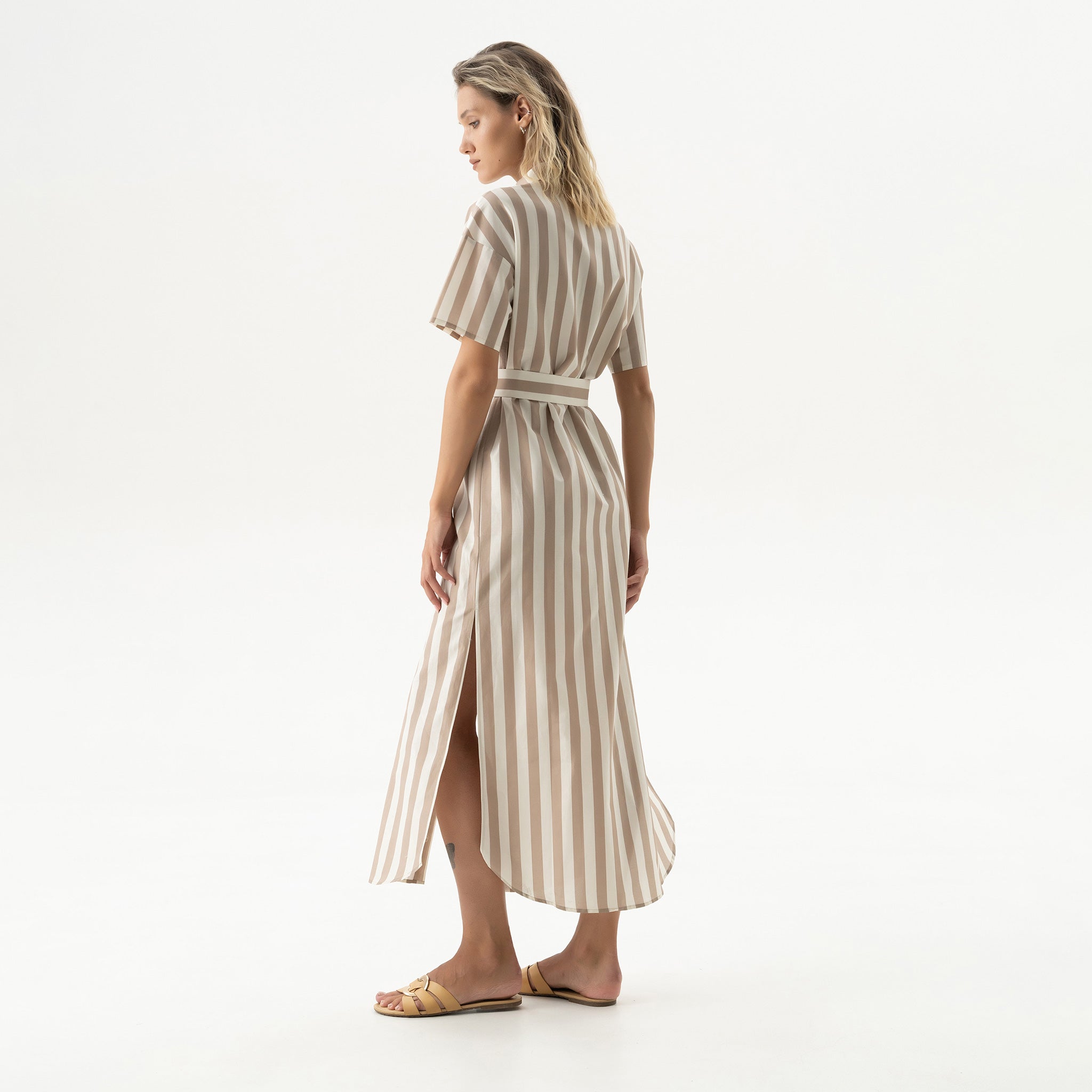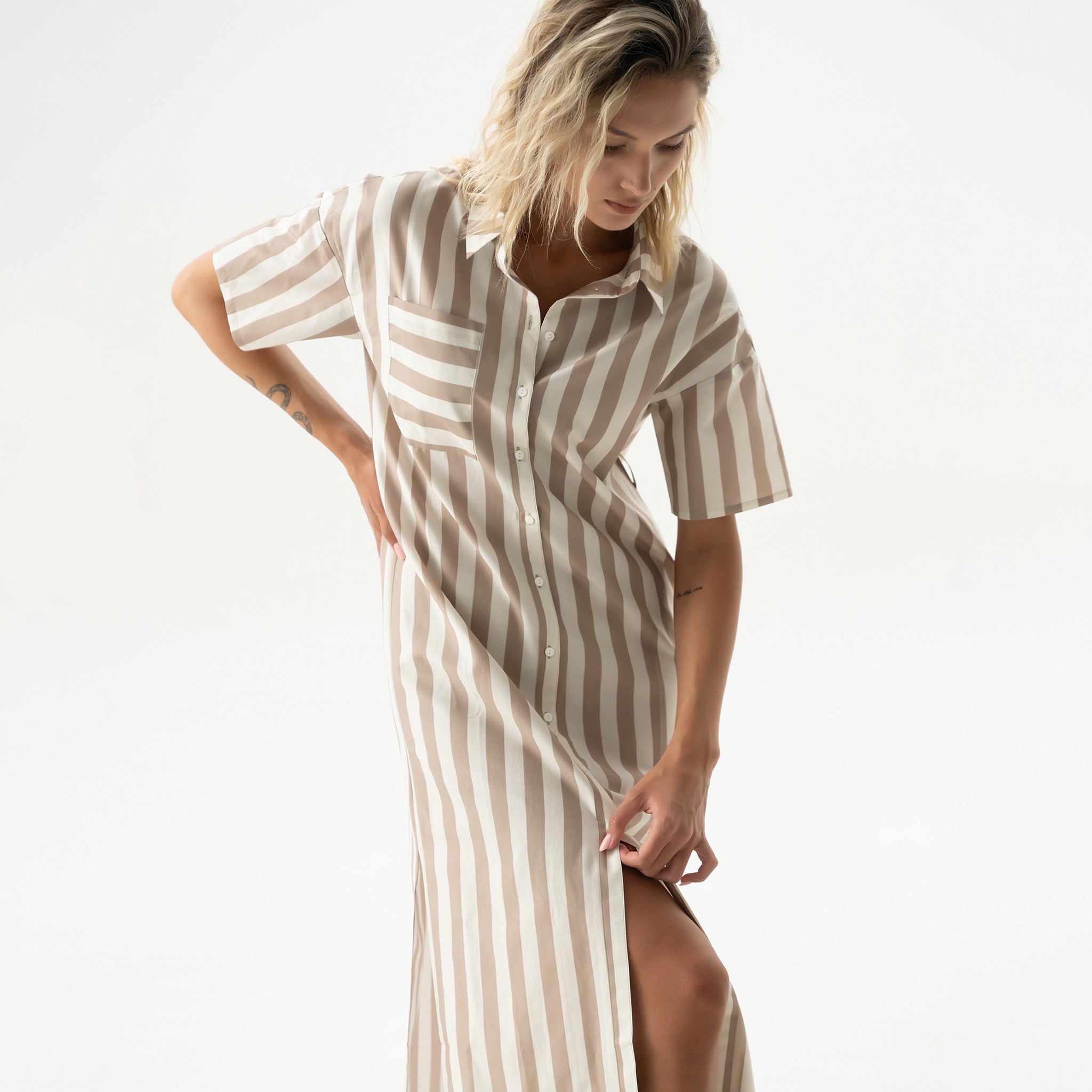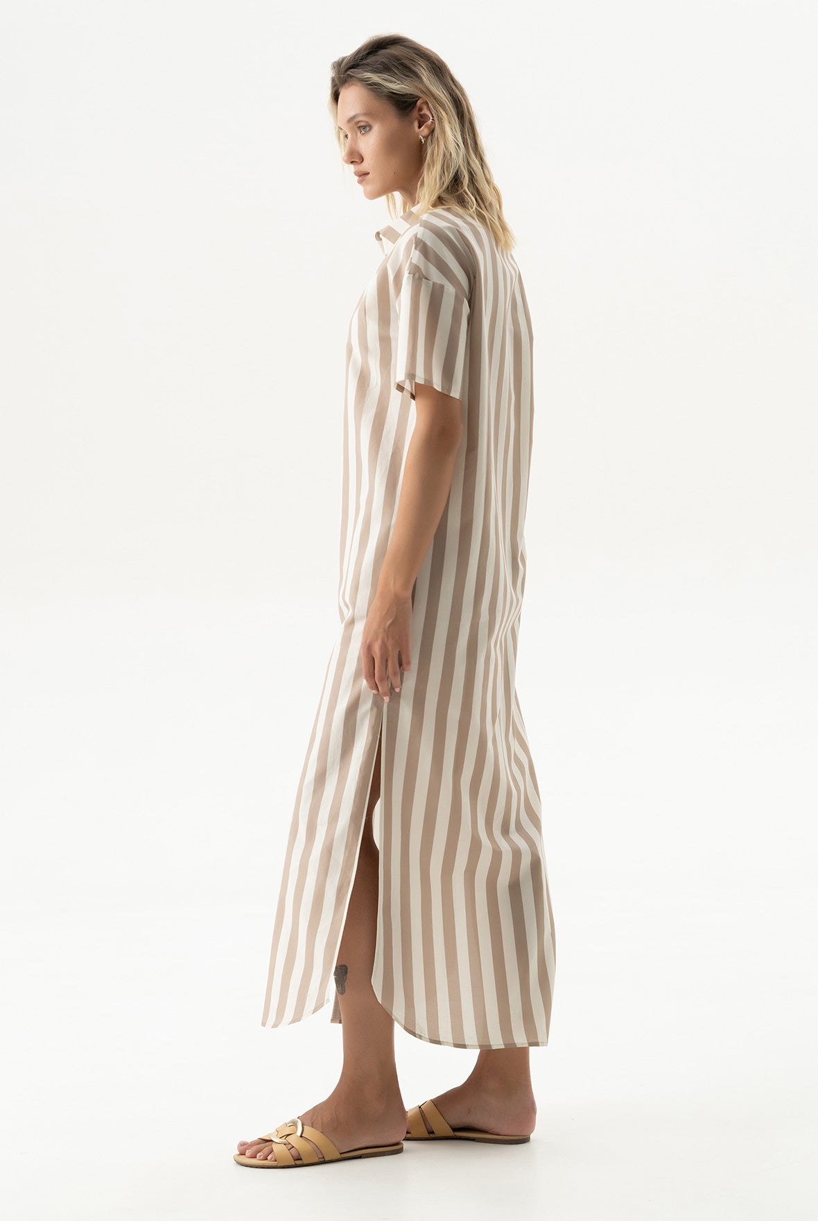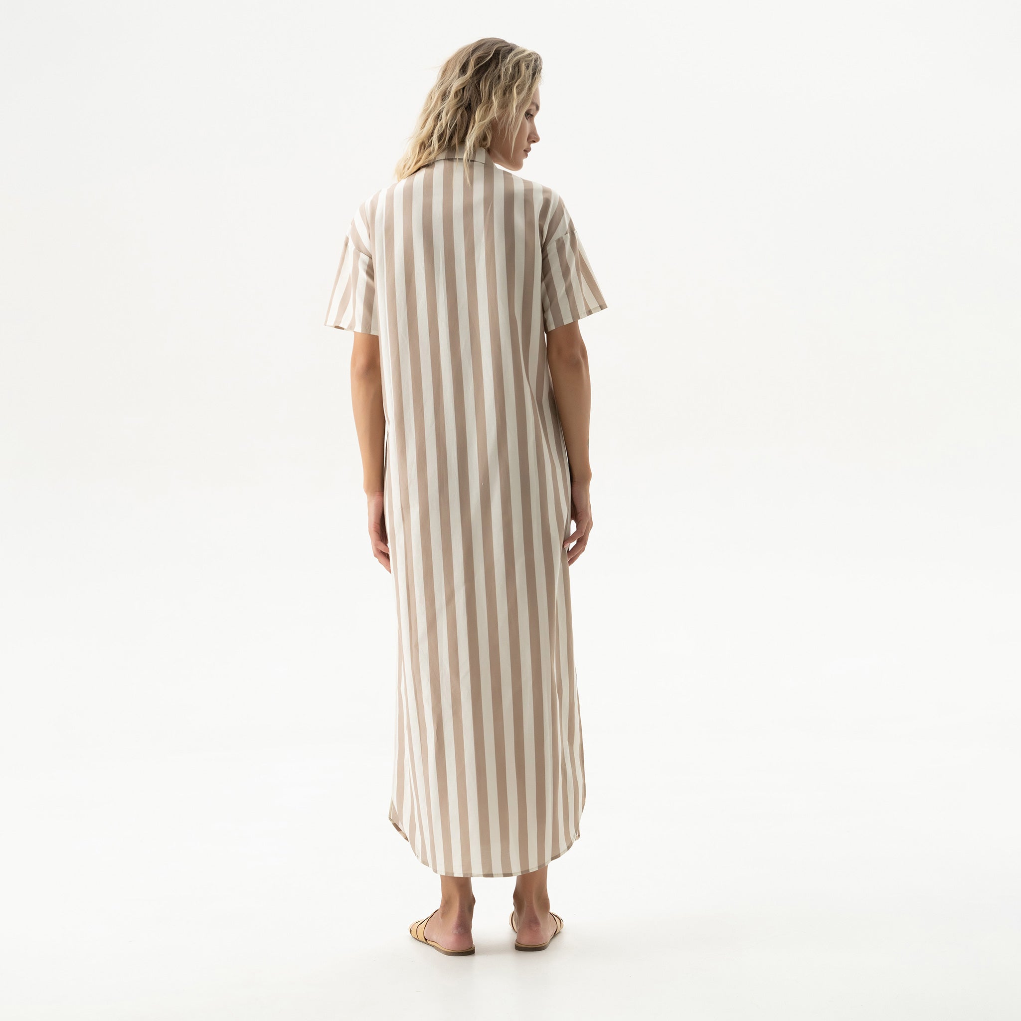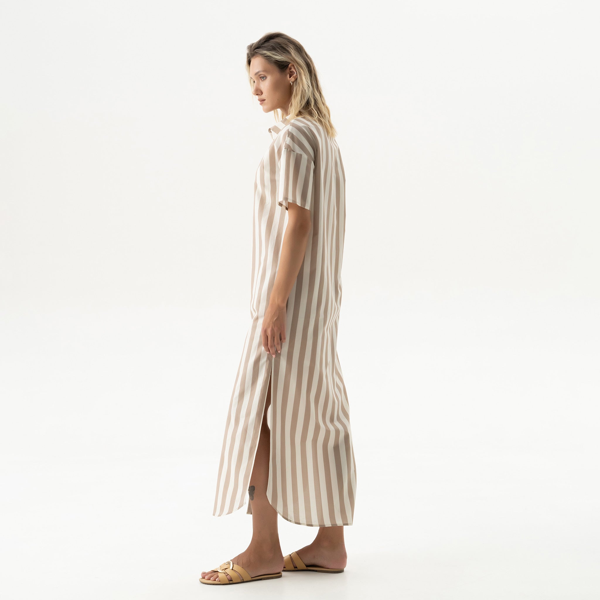 The Strapped Cotton oversized shirt dress is crafted from soft cotton, featuring a drop shoulder and a curved hem. The easy silhouette floats around the body, making it ideal for hot days in the city or at the coast.