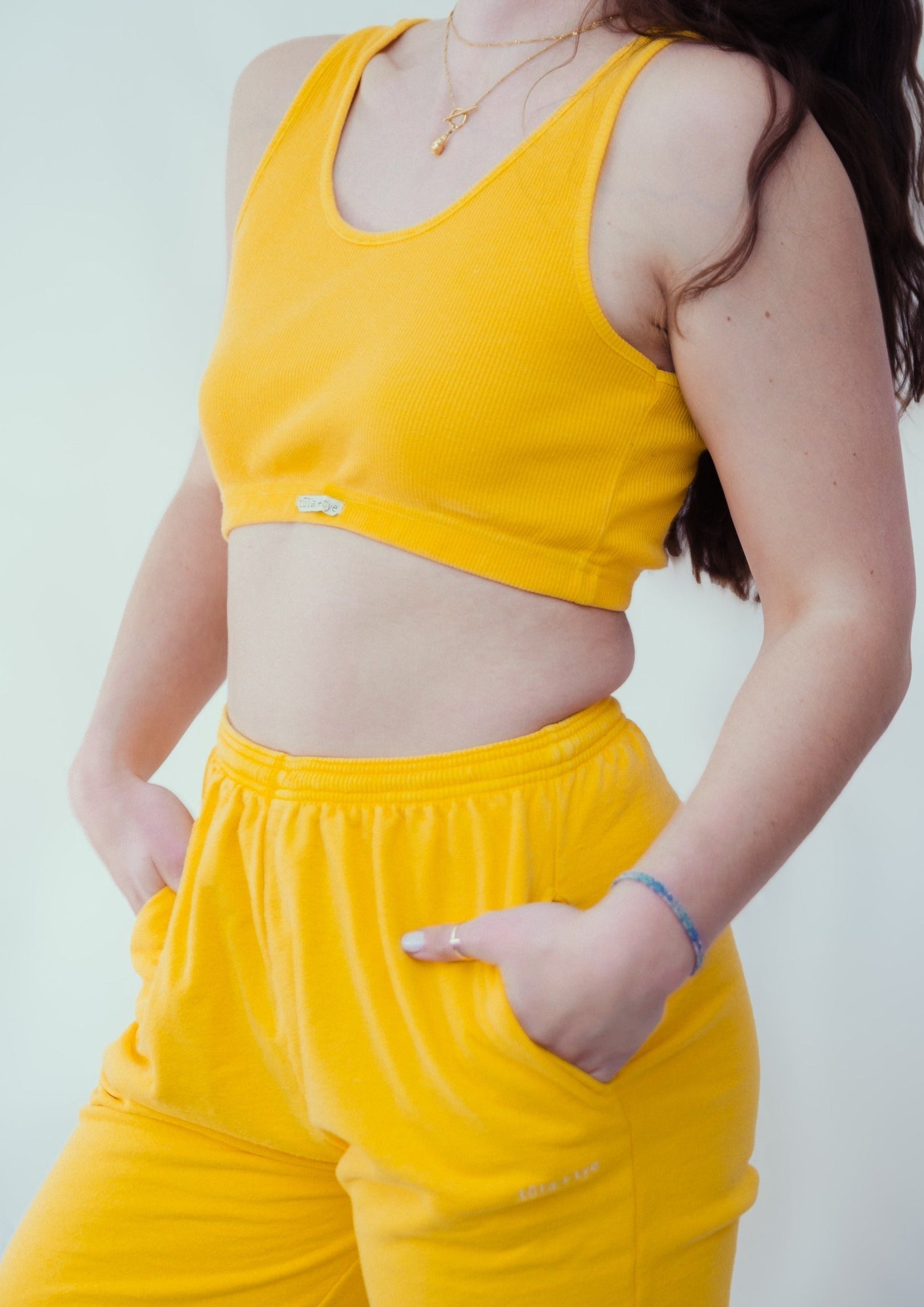 Our bralette-style cropped vests are the ideal inner or outerwear, made from recycled ribbed fabric and have an elasticated band for support. Made with our very own Three-Mile Threads™ hyperlocal production process.