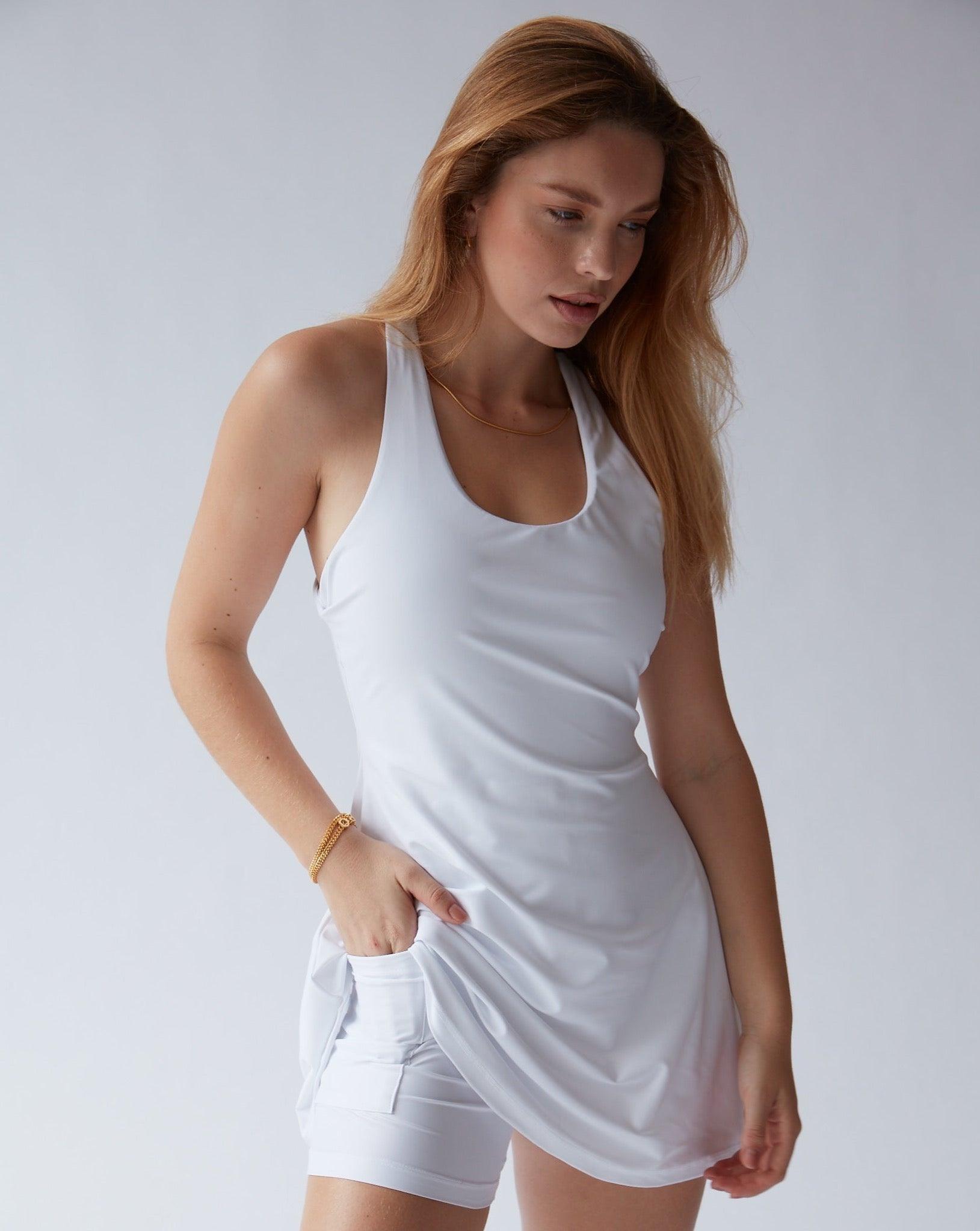 Designed for movement, Anna sports dress is the perfect pick to play and lounge in. The inner bodysuit with built-in shorts and bra keeps it all together while the loose dress layer on top keeps it casual and versatile. On the side of the build-in shorts there’s a side pocket – ideal to hold a tennis ball or save your phone.