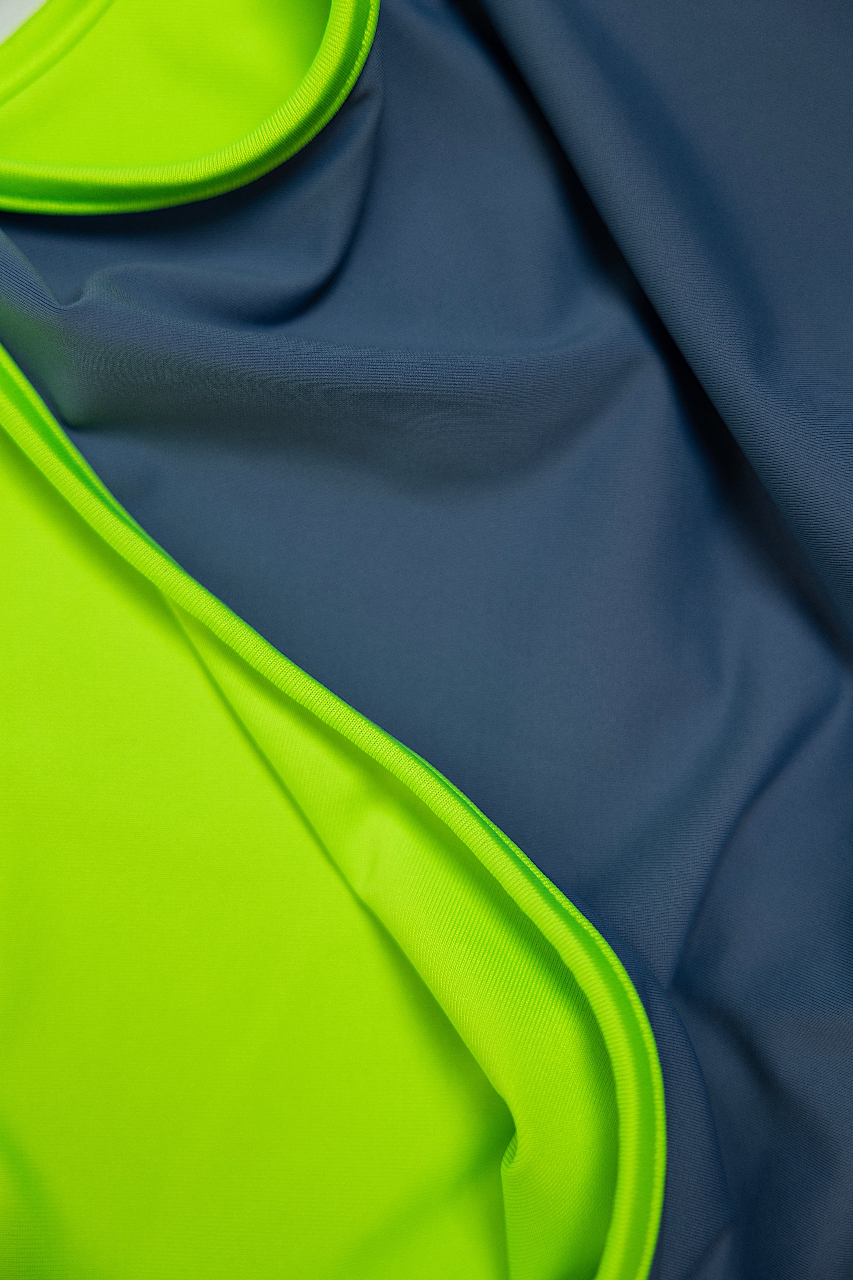 Elegant grey blue with a bright neon lime lining. High performance elastic microfiber fabric, ultra-soft with properties resistant to UV + 50 and chlorine. OEKO-TEX certified fabric.