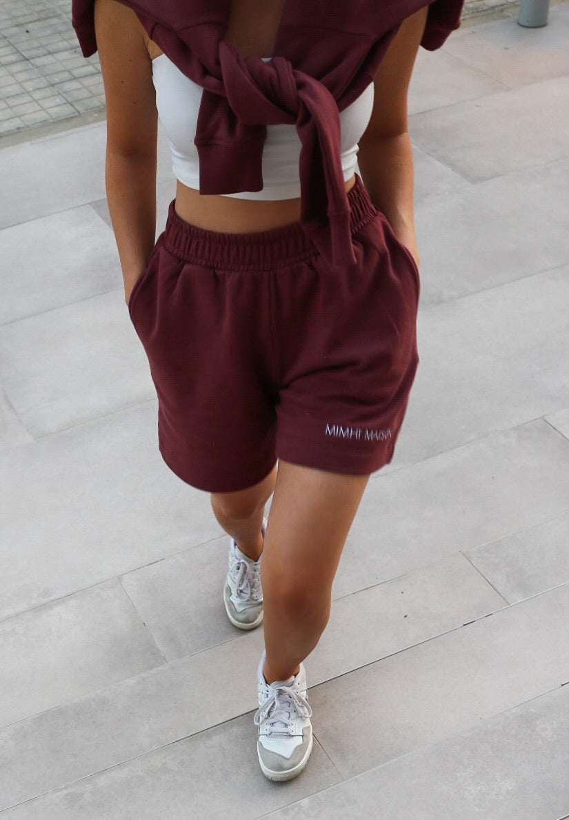 Comfort and style without effort. These burgundy shorts are made from 100% cotton and feature a relaxed cut with an elastic waist. The white embroidery of the logo on the bottom provides clean and discreet detail. Wear them with the sweater together for a total look, or combine them with basic t-shirts and your favourite sneakers for a relaxed and versatile outfit.