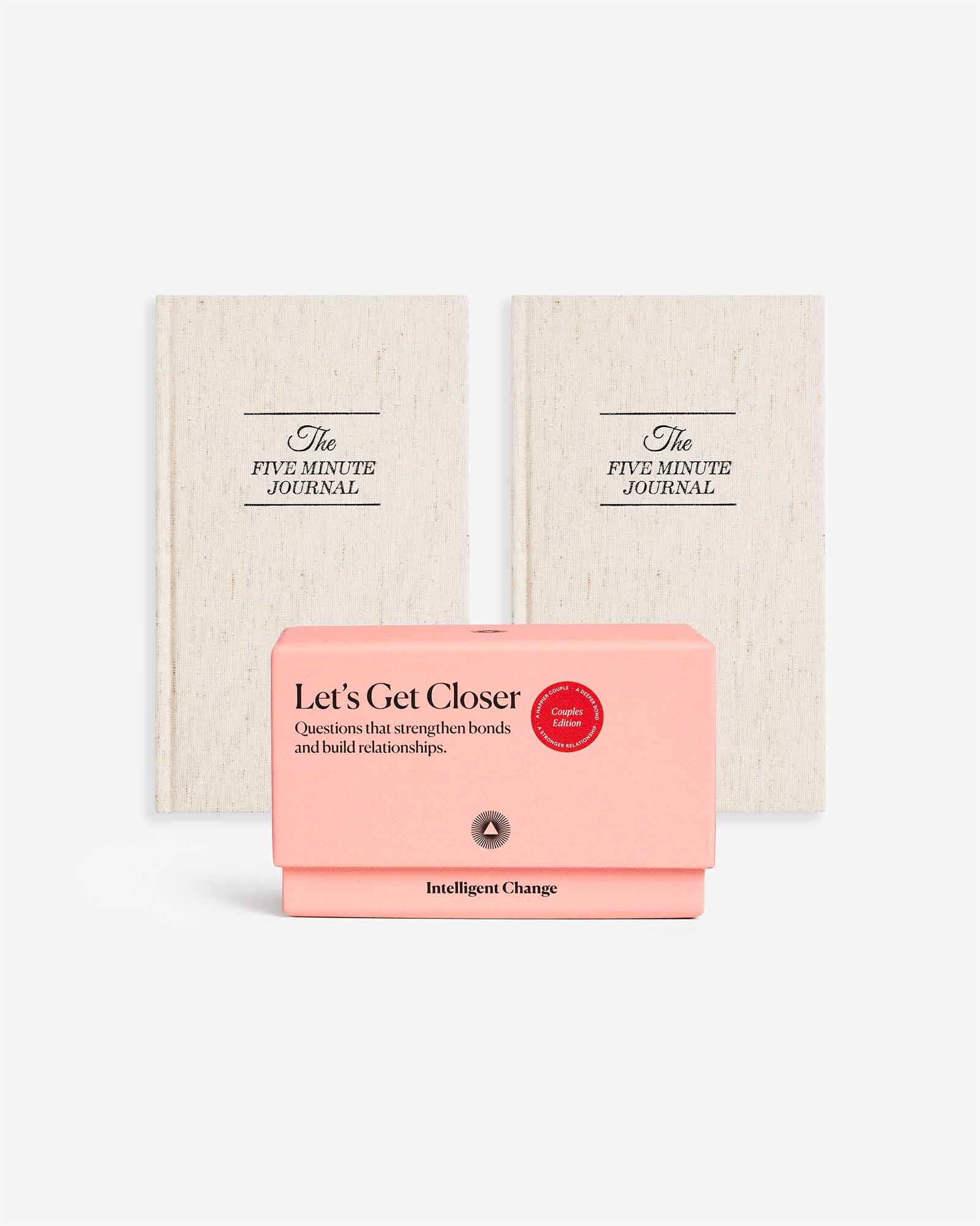 Build a gratitude ritual with your partner, spark meaningful conversations around love, and strengthen your bond with the Happy Couple Bundle, which includes two Five Minute Journals for you and your partner and the Get Closer Couples Edition game. Gain a more positive perspective on your life and relationships. Reflect on what truly matters to you as a couple. Define your love.