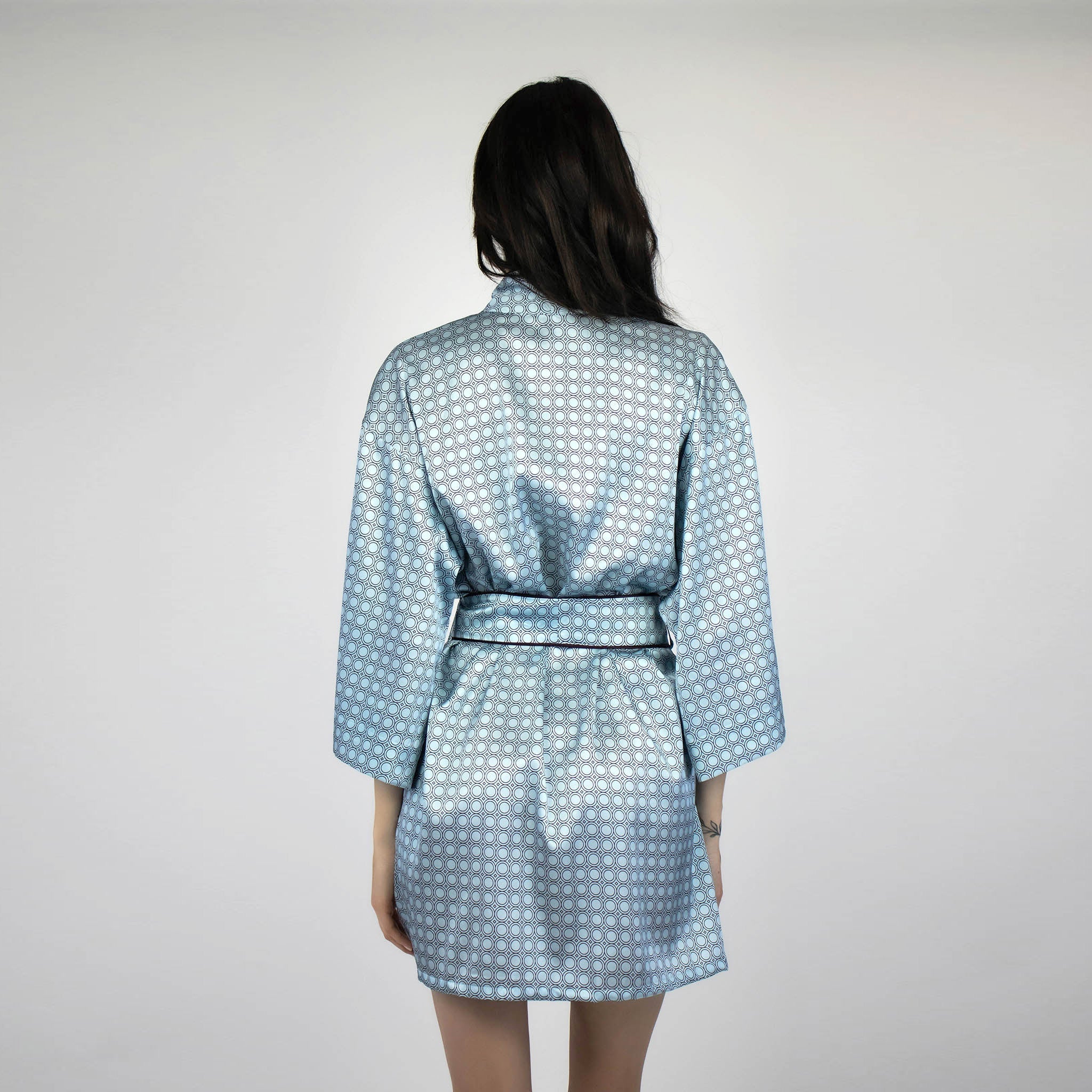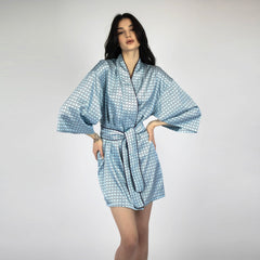 The Lady Silk Robe is made from 19 momme Mulberry silk in a sky-blue hue, features a stylish graphic print and contrast piping, and makes a fine addition to the boudoir wardrobe.