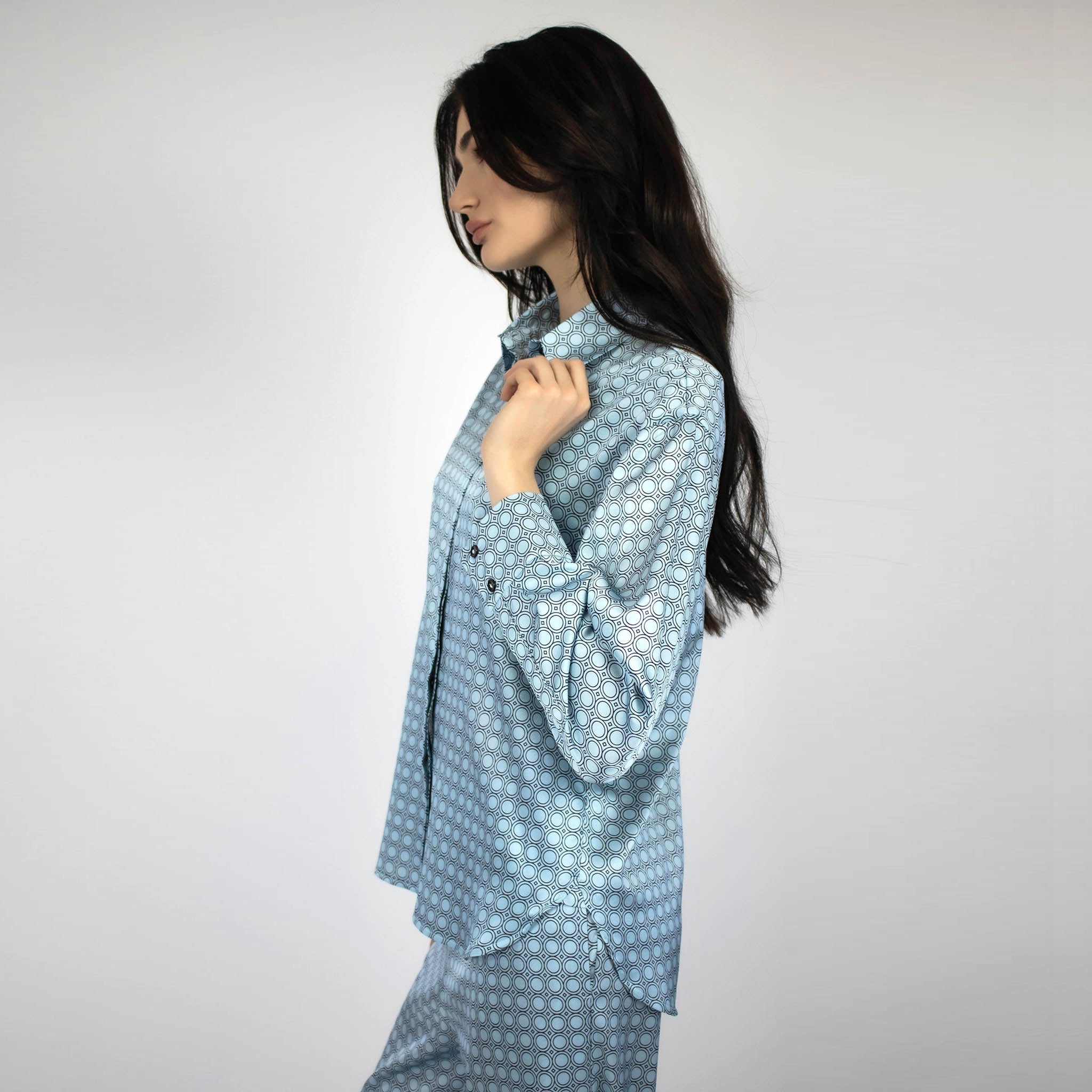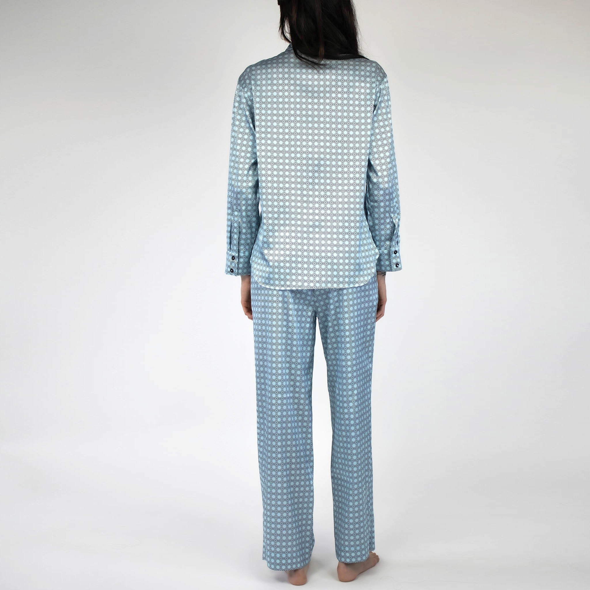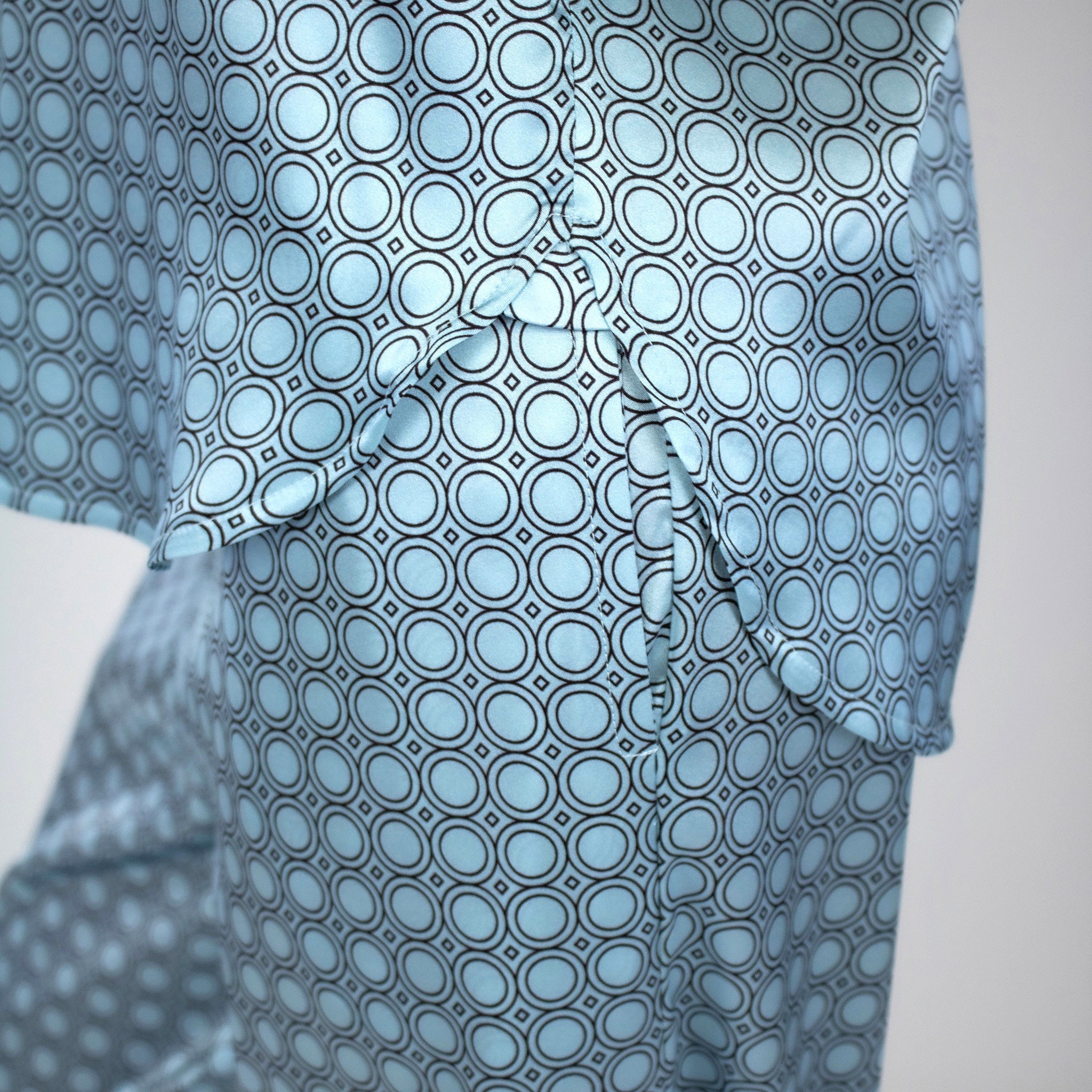 Pyjama Set is offered as a complete ensemble, featuring a calming "Cooling Spray" shade with a subtle graphic print that evokes balance and relaxation; it features contrasting, hand-worked fudge silk piping.