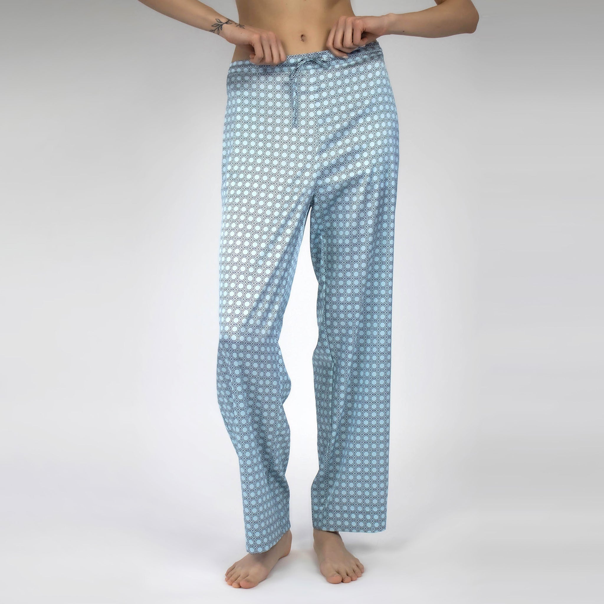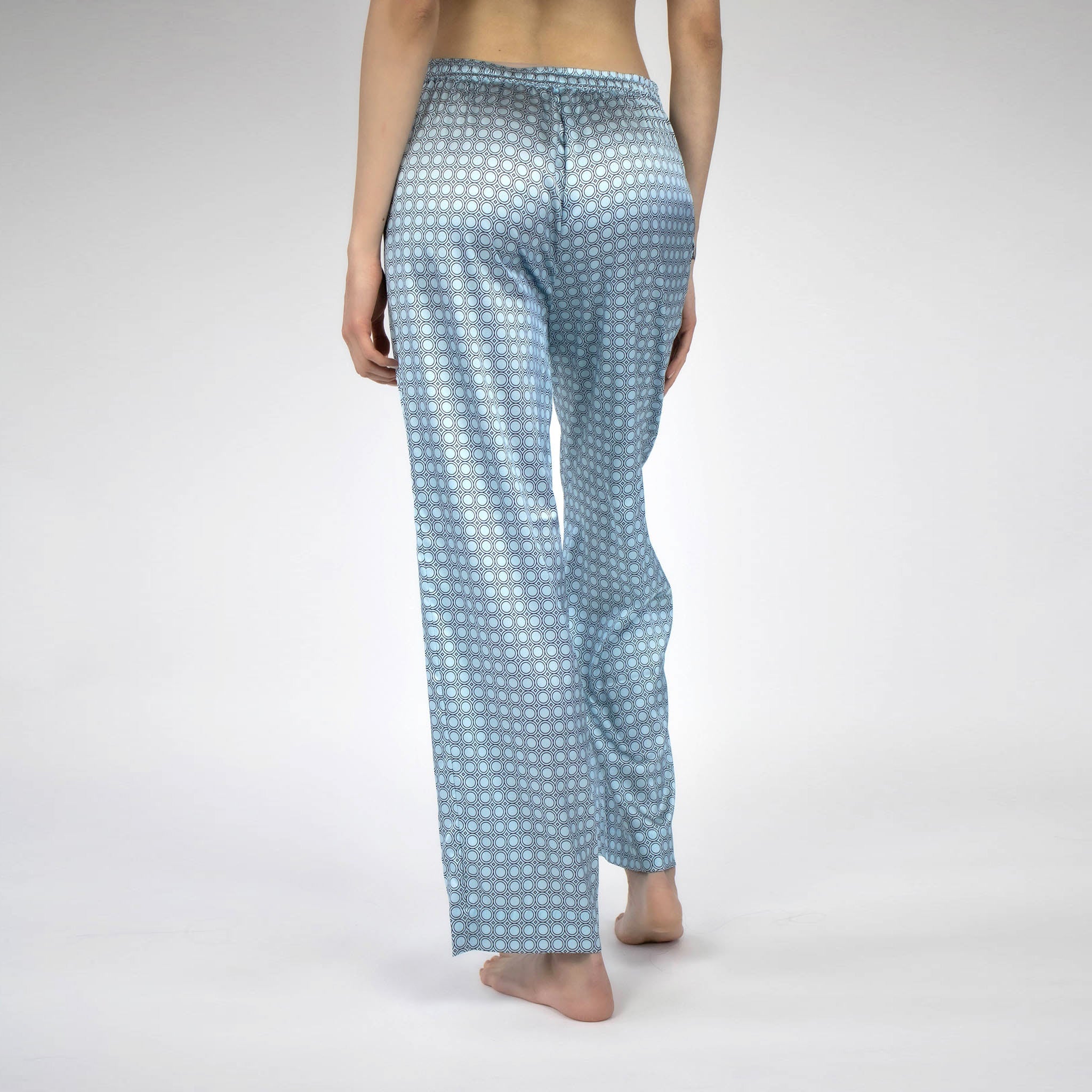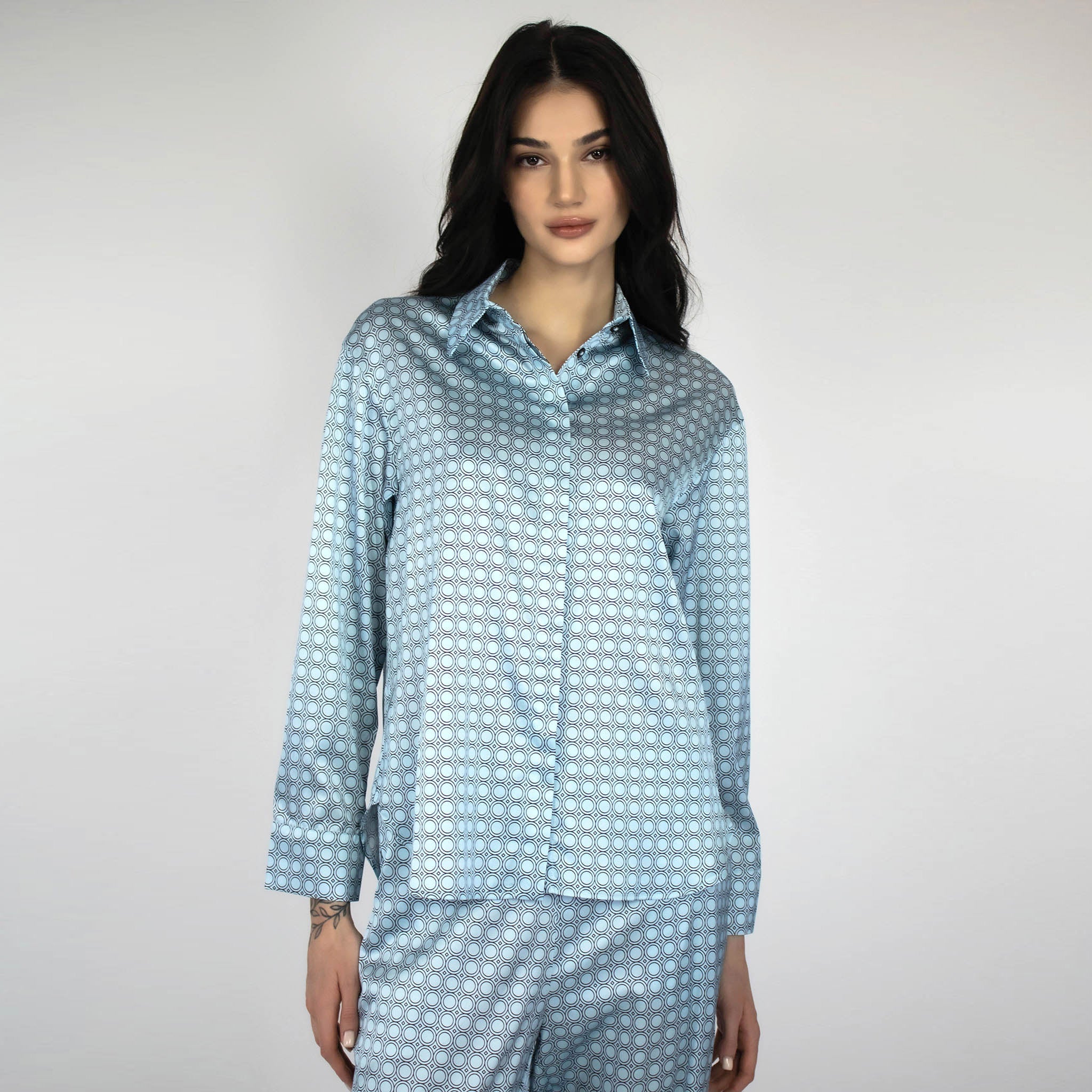 Pyjama Set is offered as a complete ensemble, featuring a calming "Cooling Spray" shade with a subtle graphic print that evokes balance and relaxation; it features contrasting, hand-worked fudge silk piping.