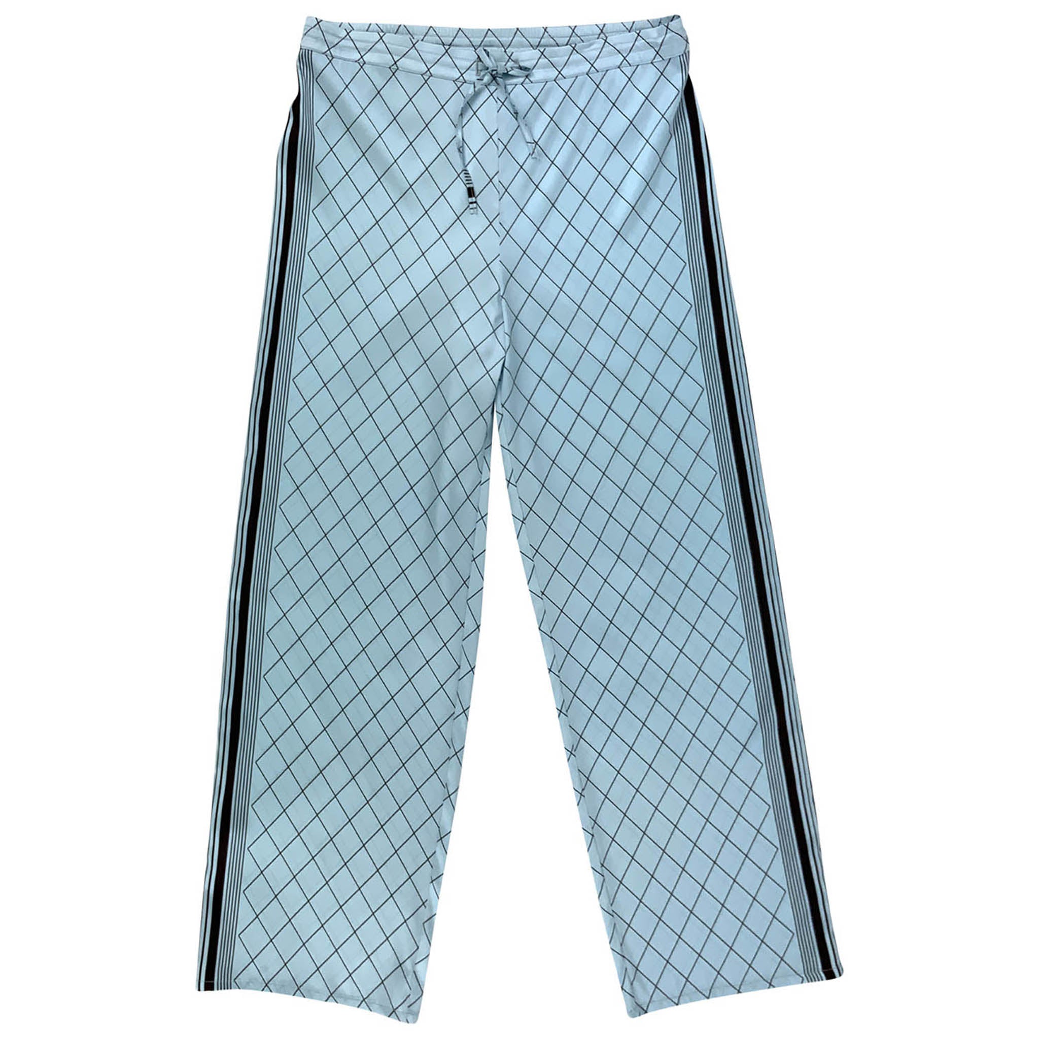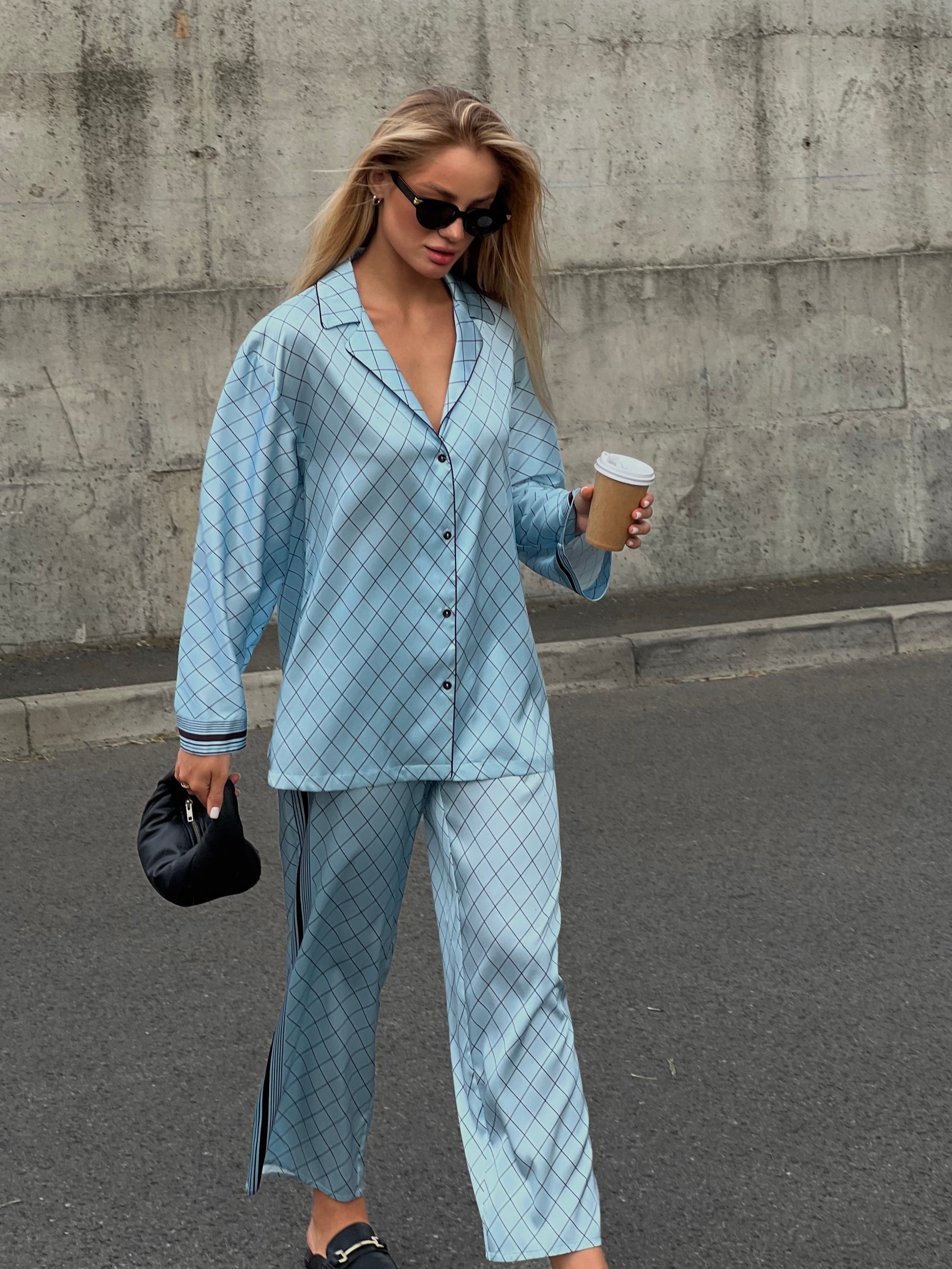 The Lady pants from NOKAYA are crafted from 19 momme Mulberry silk. World’s finest fabric in a sky-blue hue with a subtle graphic print in a contrasting fudge color evokes balance and relaxation.