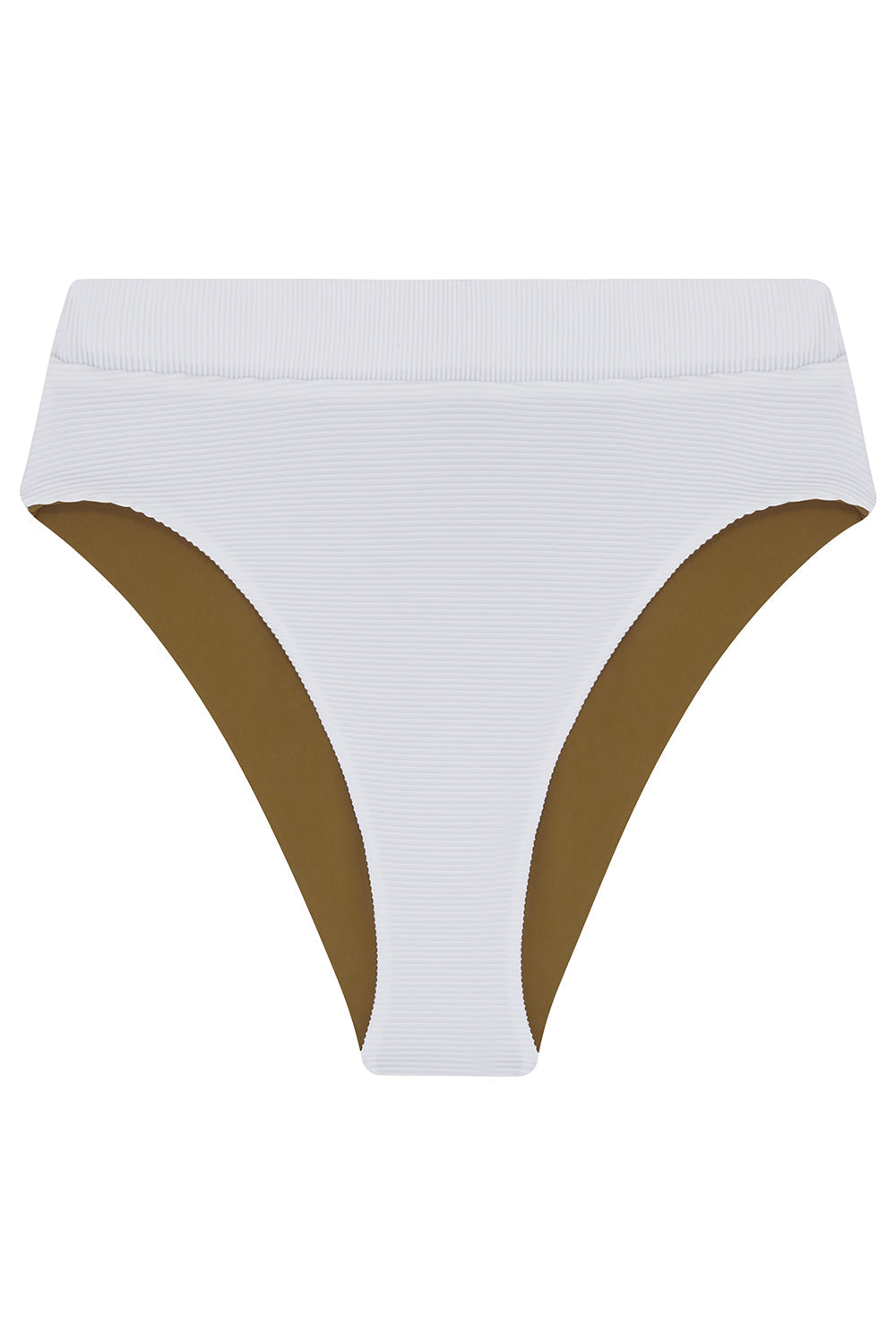 The timeless 80’s style high-waisted bottom with high-cut legs and supportive waistband. The conservative 'Oriane' is crafted using our signature ottoman rib fabric paired with the smooth matte reverse fabric, and suits all shapes and sizes. This classic is available in two colourways: White + Seagrass & Azura + Rose