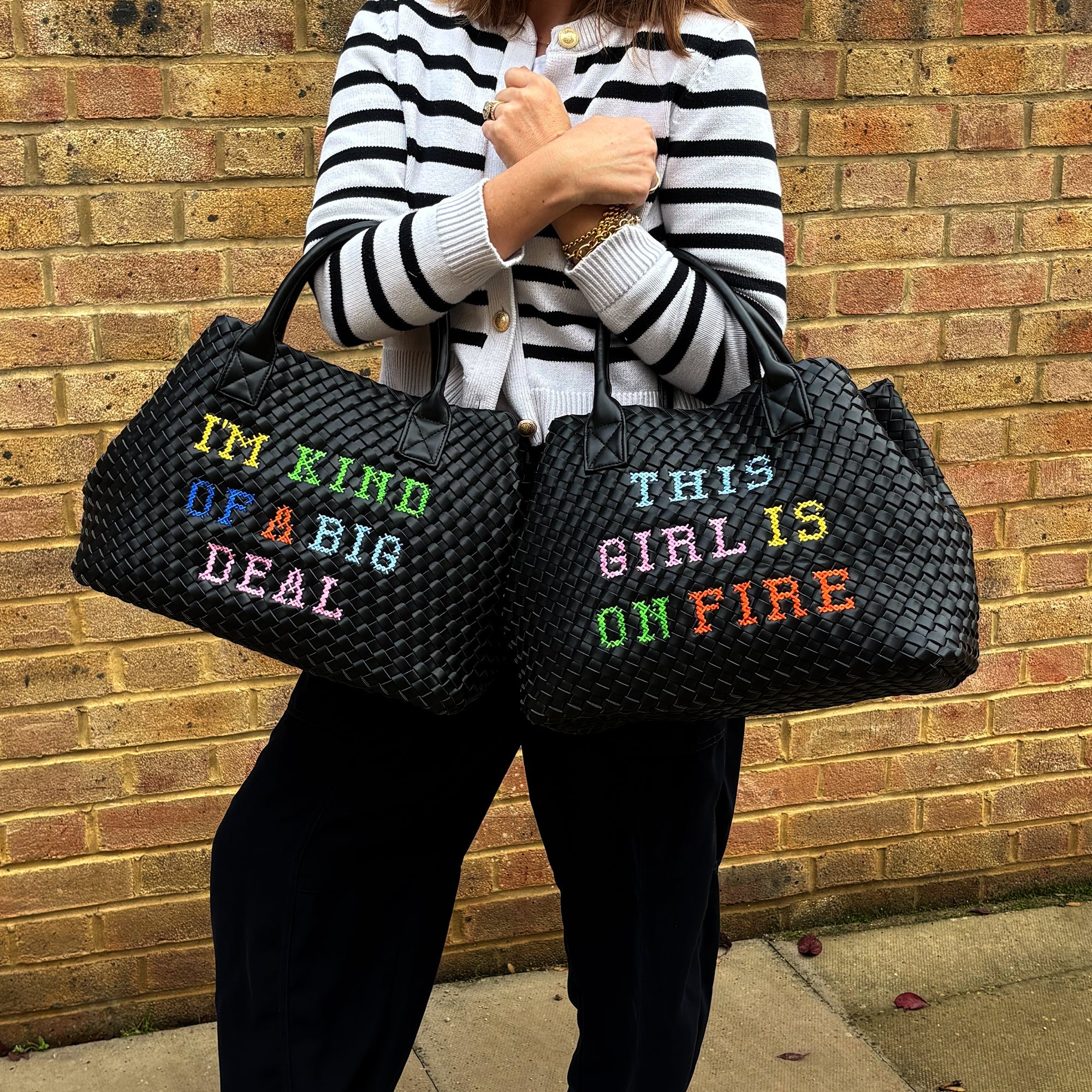 New, this is a beautiful, super soft vegan bag, crafted from soft, hand-woven vegan leather! Featuring a clever detachable inner pouch inside the roomy main compartment, this playful bag is perfect for work or weekend fun. Handmade with top-quality embroidery, it’s your go-to companion for everyday adventures with a cheeky twist.