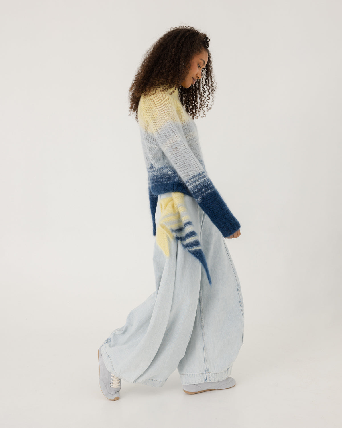 This bandana-style scarf is shaped using a fully fashioned technique and showcases a gradient knit that blends two shades of yarn into a seamless fade. Spun in Italy from a brushed RMS certified mohair and silk blend. The cruelty free silk strand binds the mohair to give strength and a subtle sheen, while the brushed finish adds softness and texture. Featherlight yet warm, it’s a tactile little bolt of luxury - the perfect addition to your winter wardrobe. Depents how bold you want to be.