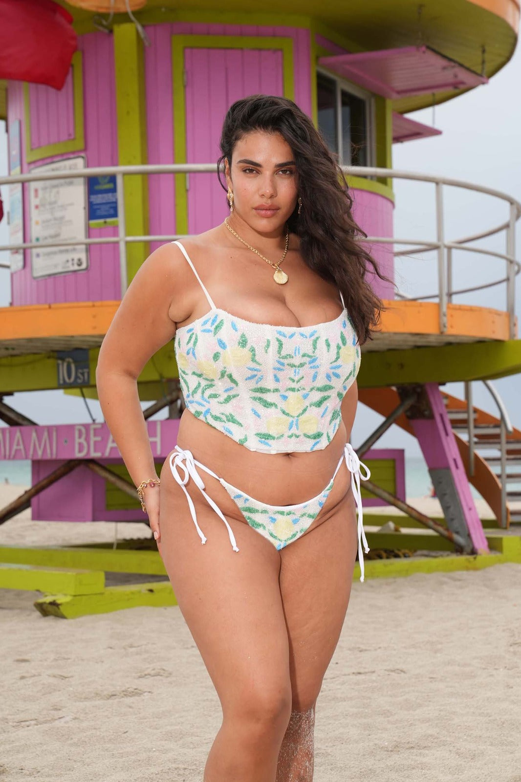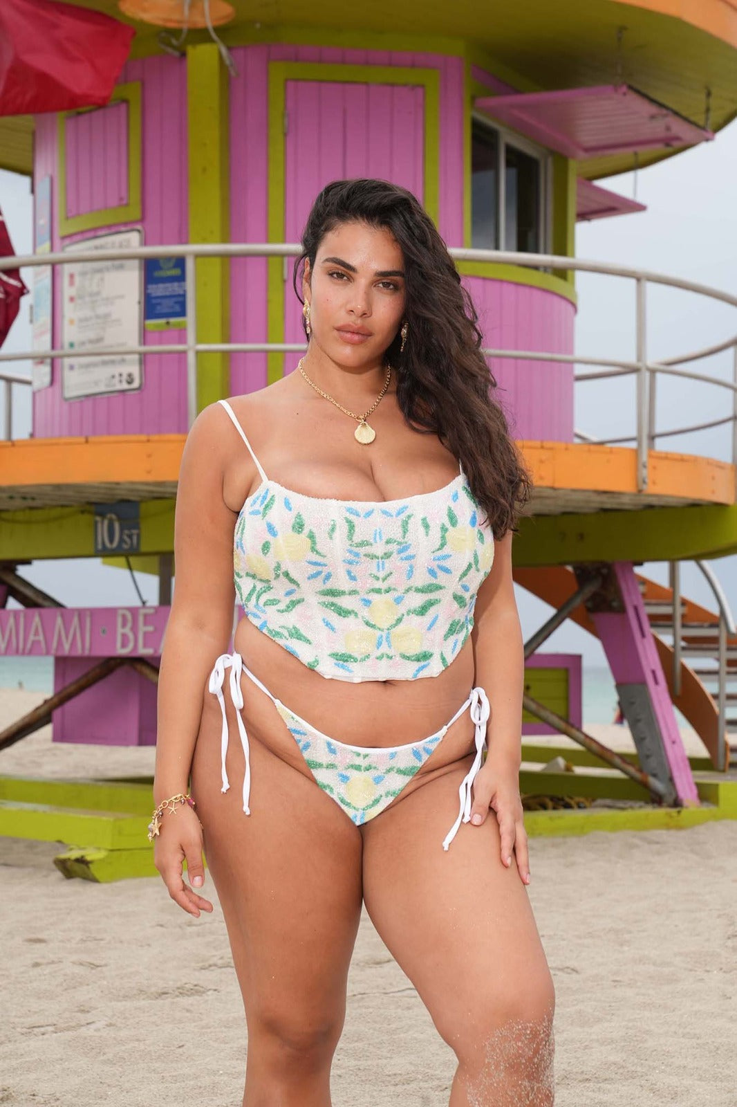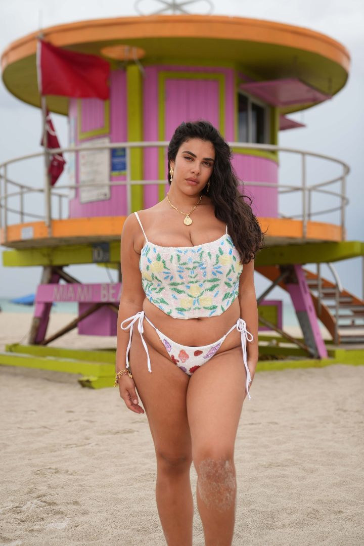Delicate yet bold, the Tropique Top is a celebration of nature’s untamed beauty. Designed in London this off-white strappy top is adorned with intricate blue and green floral motifs, brought to life through exquisite bead work. Each flower is hand-embroidered to create a three-dimensional texture that shimmers with every movement—capturing the breezy elegance of the Miami coast. As seen on the runway at Miami Swim Week SS25, this piece brings artful craftsmanship to warm weather dressing.
