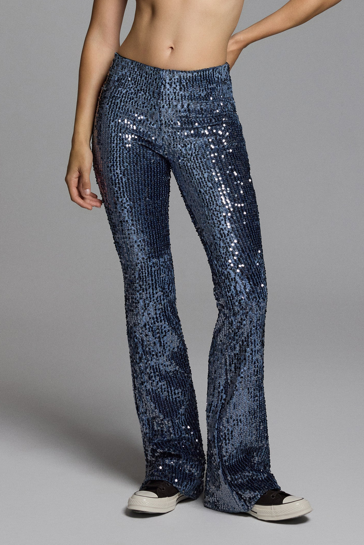 This blue sequin pants bring nocturnal sparkle together with a modern silhouette. Its fluid fabric and stretchy form sit gracefully on the body, while the flared leg cut creates a strong stance. With every movement, its shimmering surface instantly gives your look a stage-ready feel.