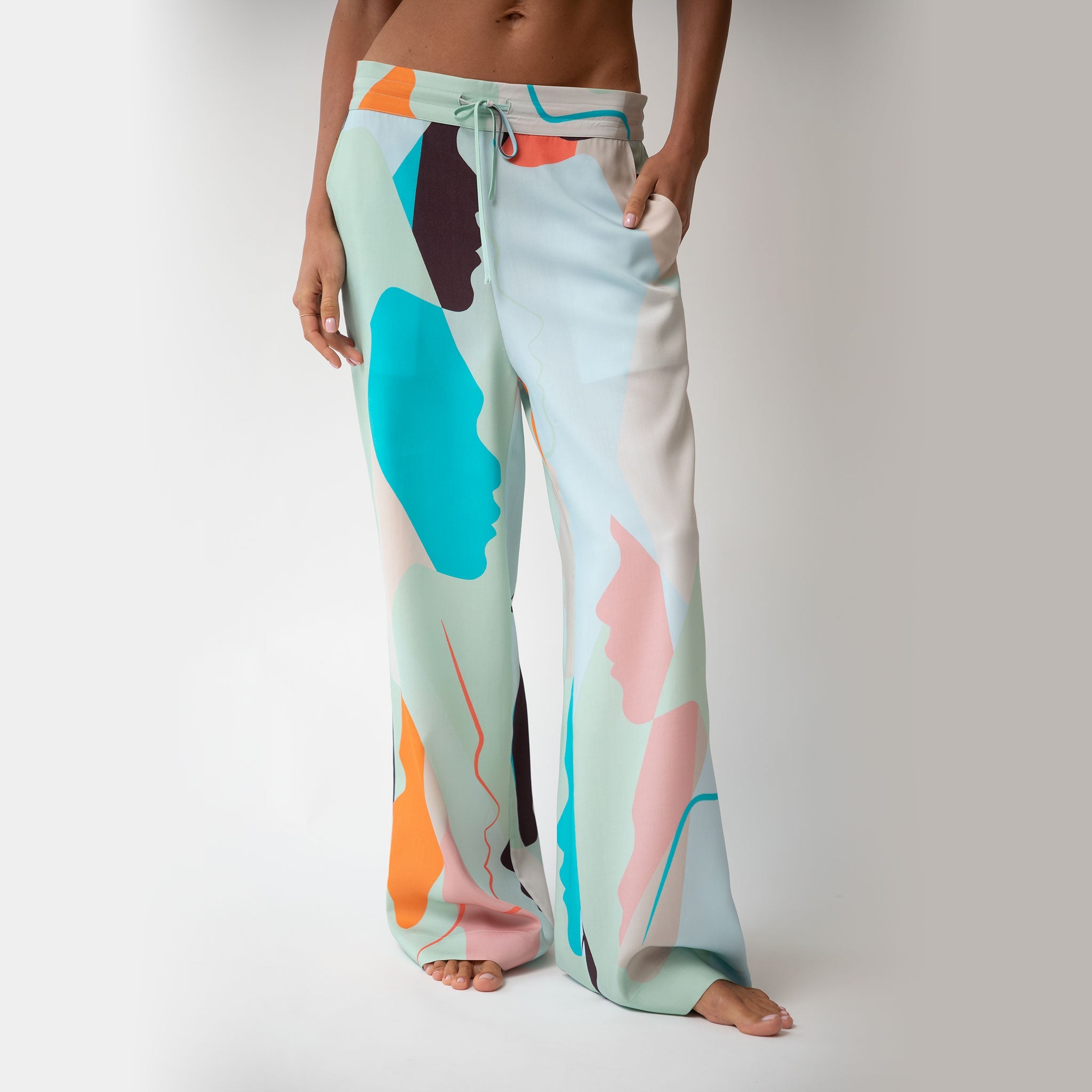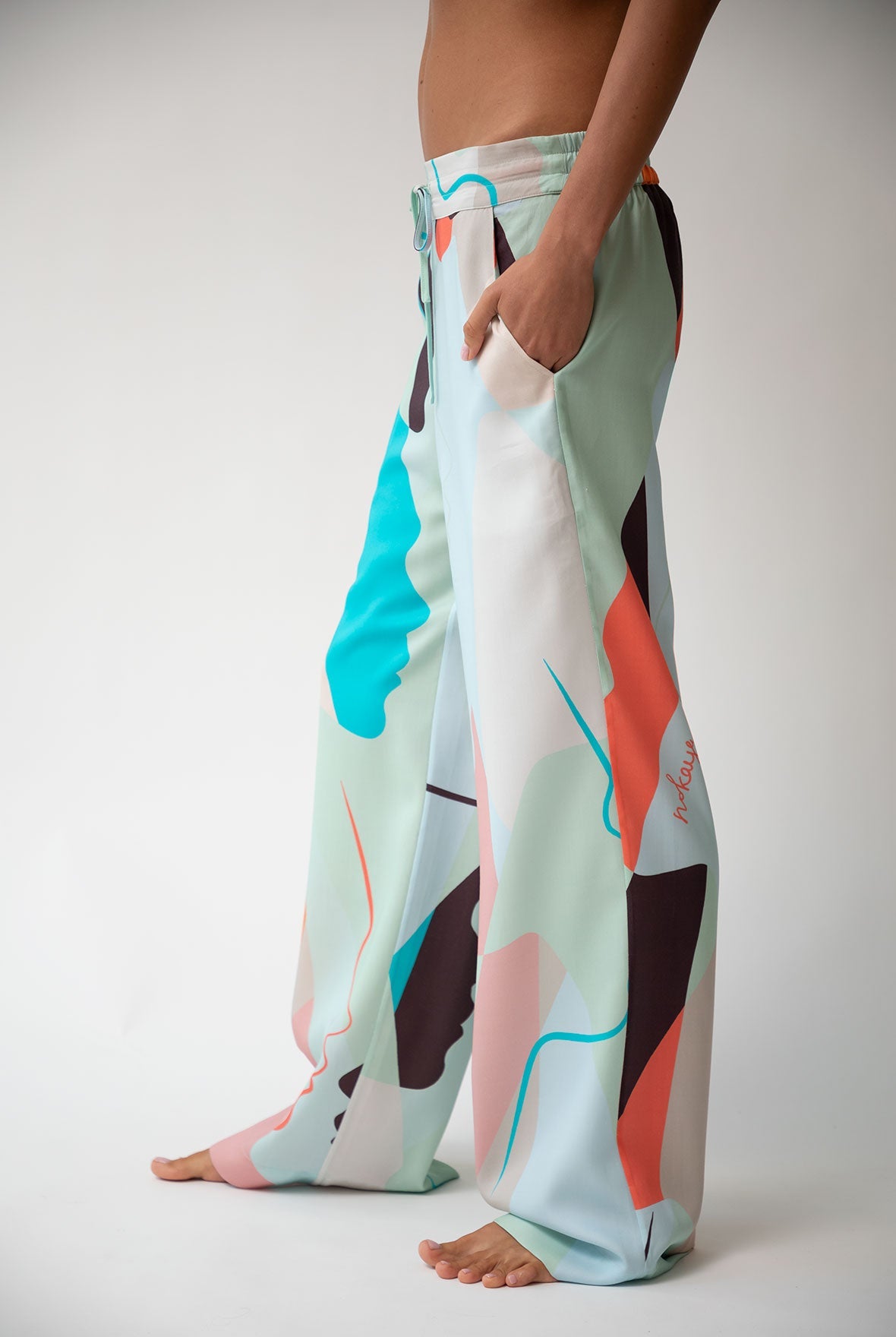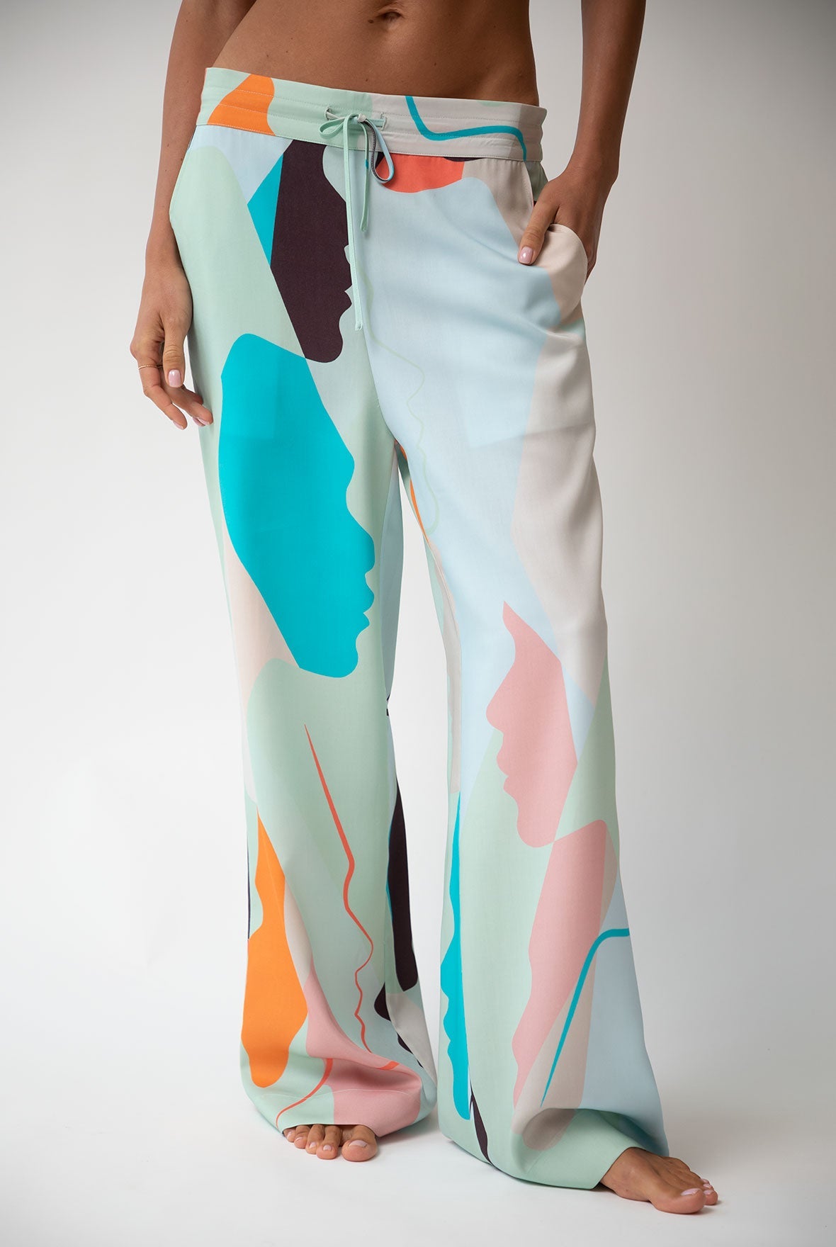 The pants' harmonious green and multi-coloured abstract print offers a unique and stylish look, perfect for various occasions.