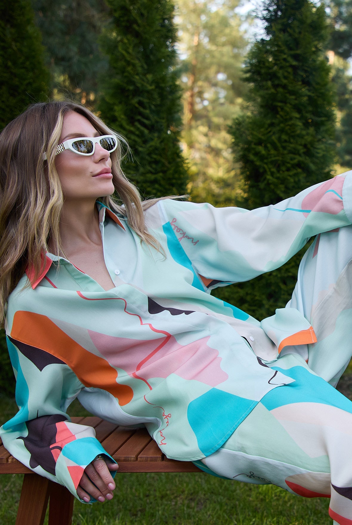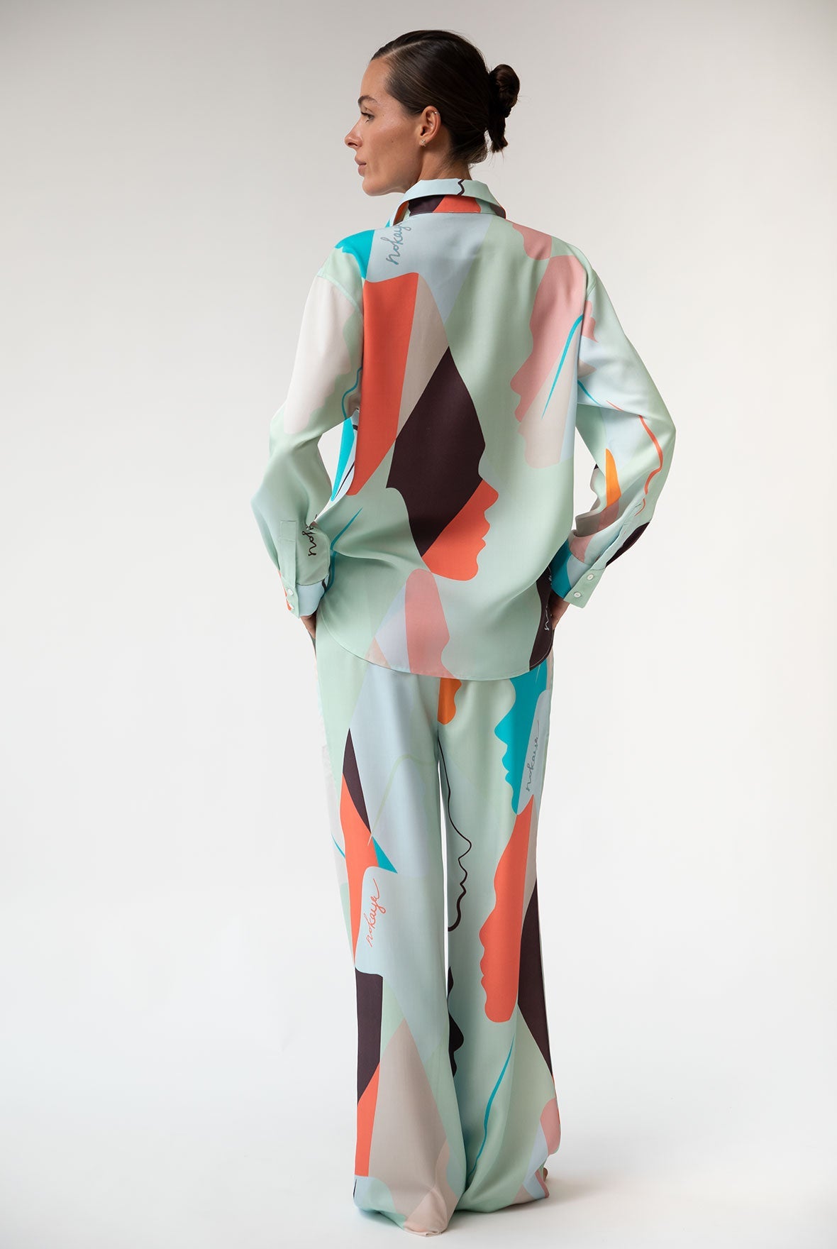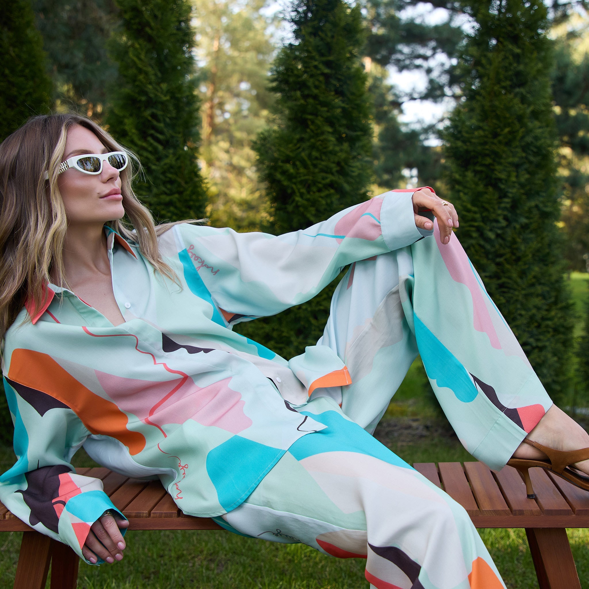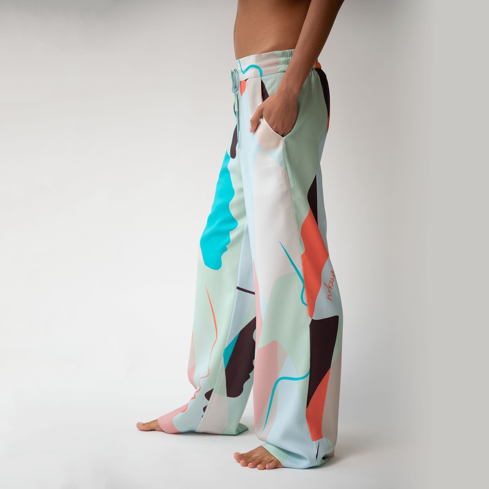 The pants' harmonious green and multi-coloured abstract print offers a unique and stylish look, perfect for various occasions.