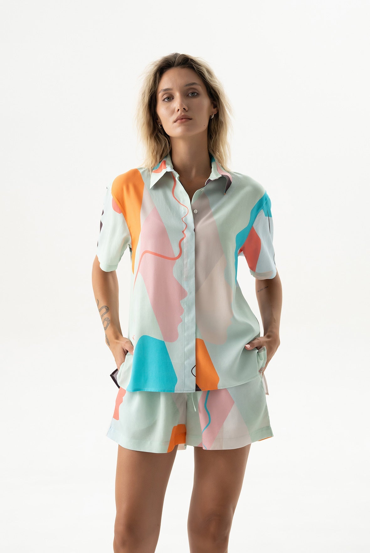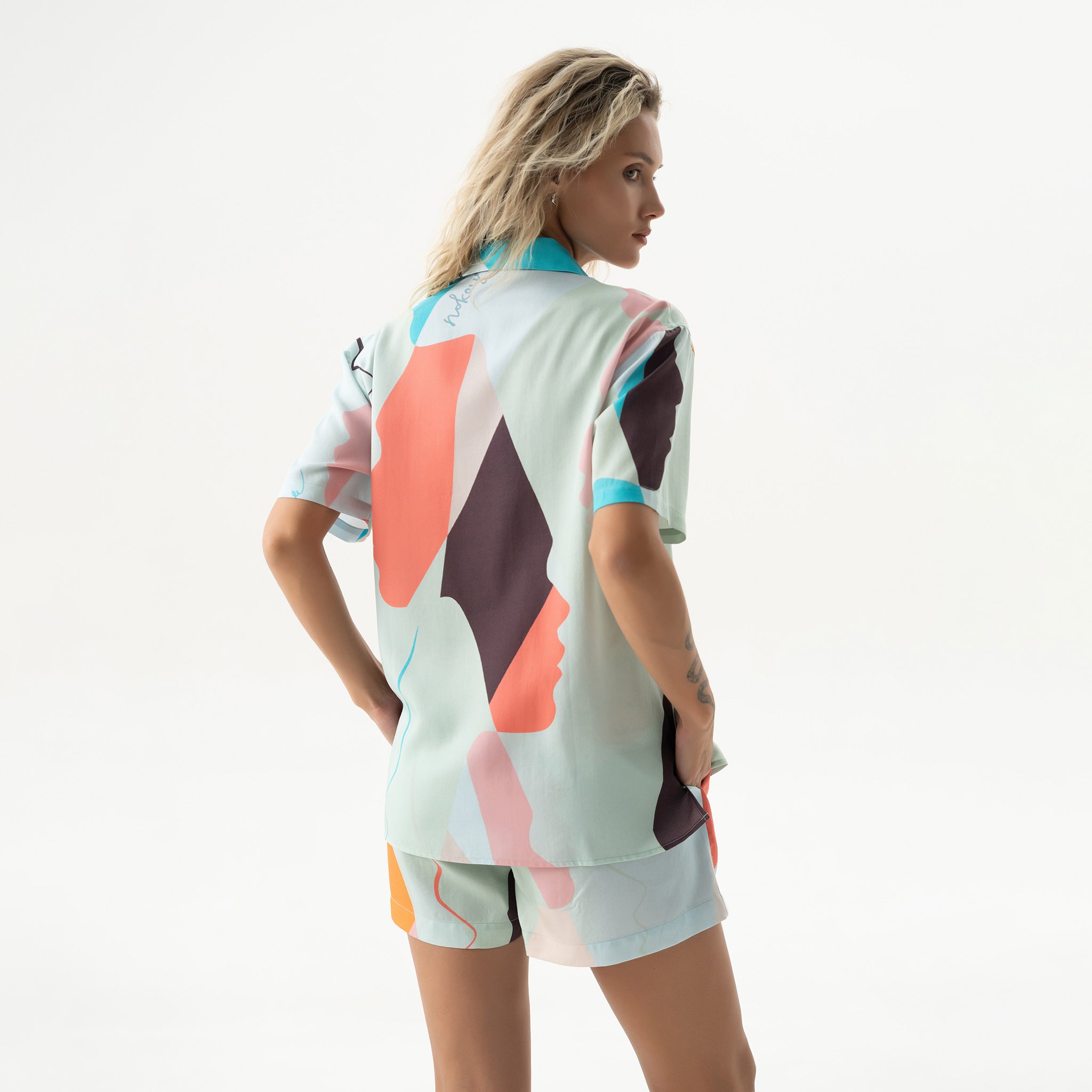 The harmonious green base is brought to life with our exclusive abstract artwork, a fluid, in-house design that celebrates spontaneity and modernity. Each piece is unique, as the print placement may vary due to the non-fixed pattern.