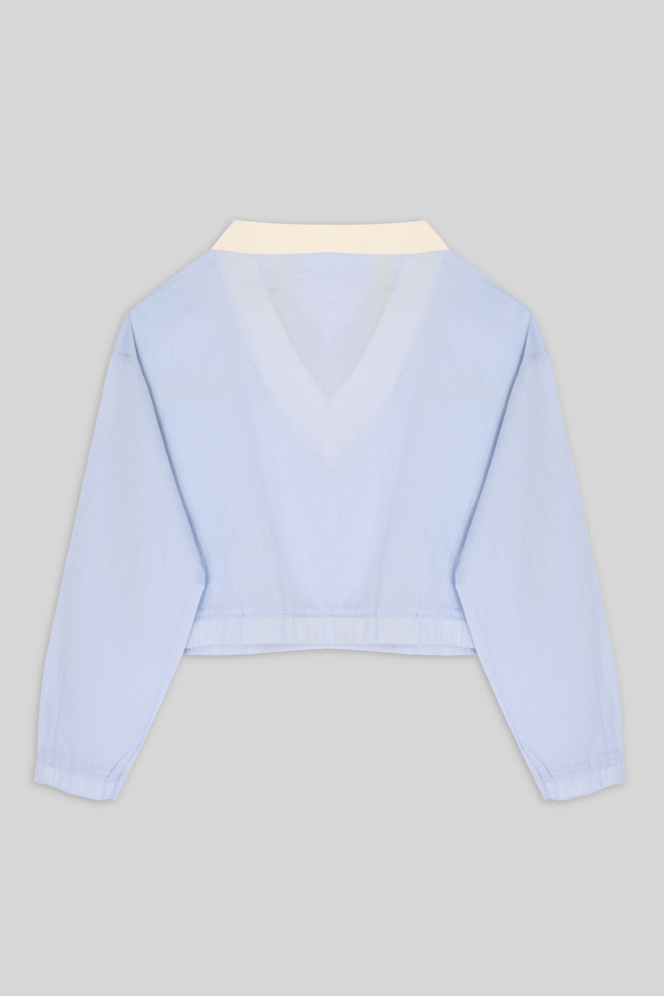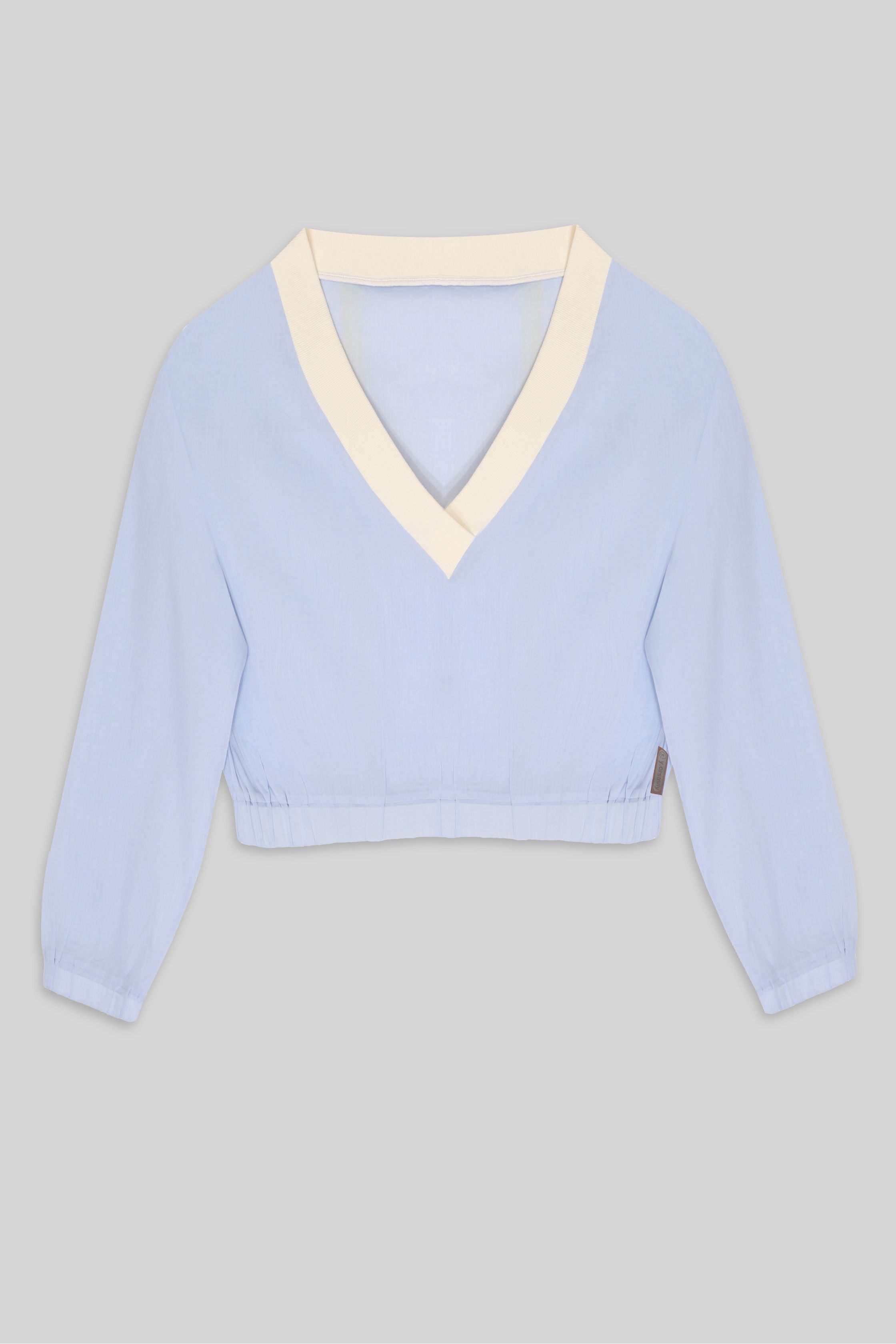 Its sheer, breathable texture gives it an ethereal quality, perfect for layering over your court set or styling solo with high-waisted skirts and shorts. A deep V neckline with contrast ribbing frames the silhouette, while a gathered hem ensures a relaxed yet feminine shape.