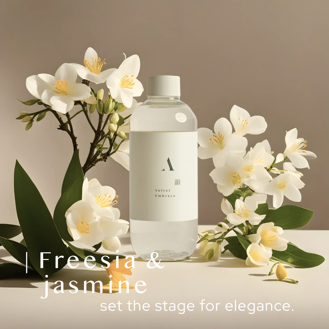 Jasmine uplifts mood and boosts creativity, while freesia adds lightness and freshness. Velvet Embrace is perfect for inspiring artists, designers, and creatives, offering an inviting, fresh scent that stimulates new ideas and creates welcoming environments.
