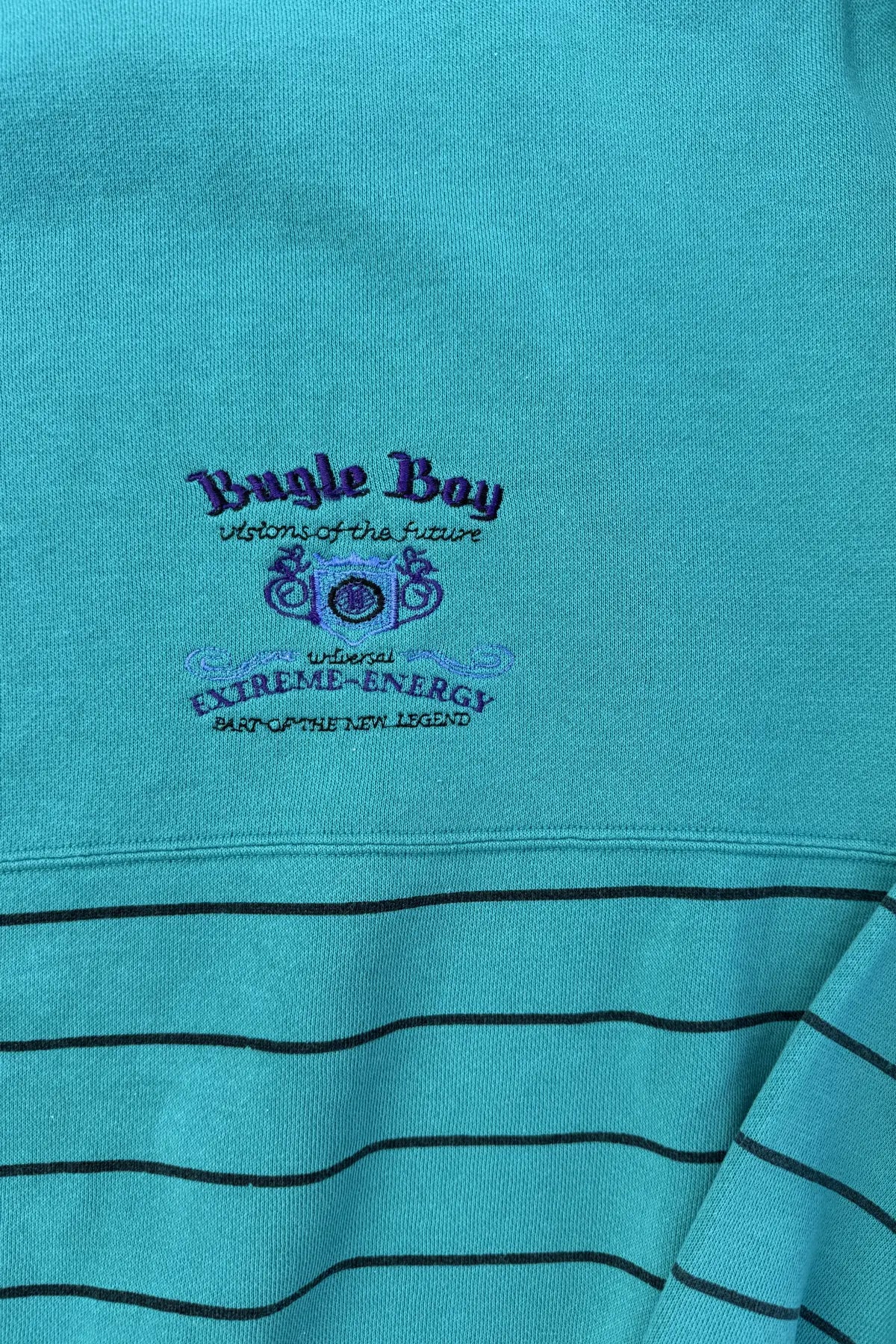 Bugle Boy was one of the most successful and iconic brands of the 1980's and 1990's. This sweatshirt is absolute fire! The color blocking, the stripes, the double neckline, the super dope embroidery. We think it fits closest to a medium/large.