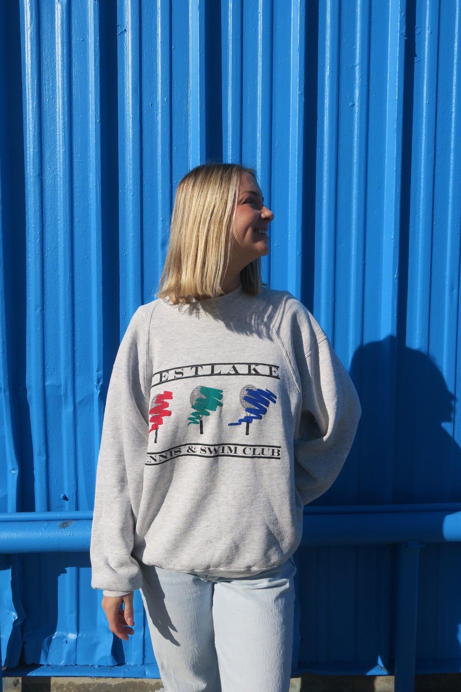 We love everything about this vintage sweatshirt. The soft, mid-weight heather grey cotton, the raglan sleeves and the timeless graphic. There are a couple of small stains (mostly on the sleeves) to give it an even more vintage look!:) She fits true to size.