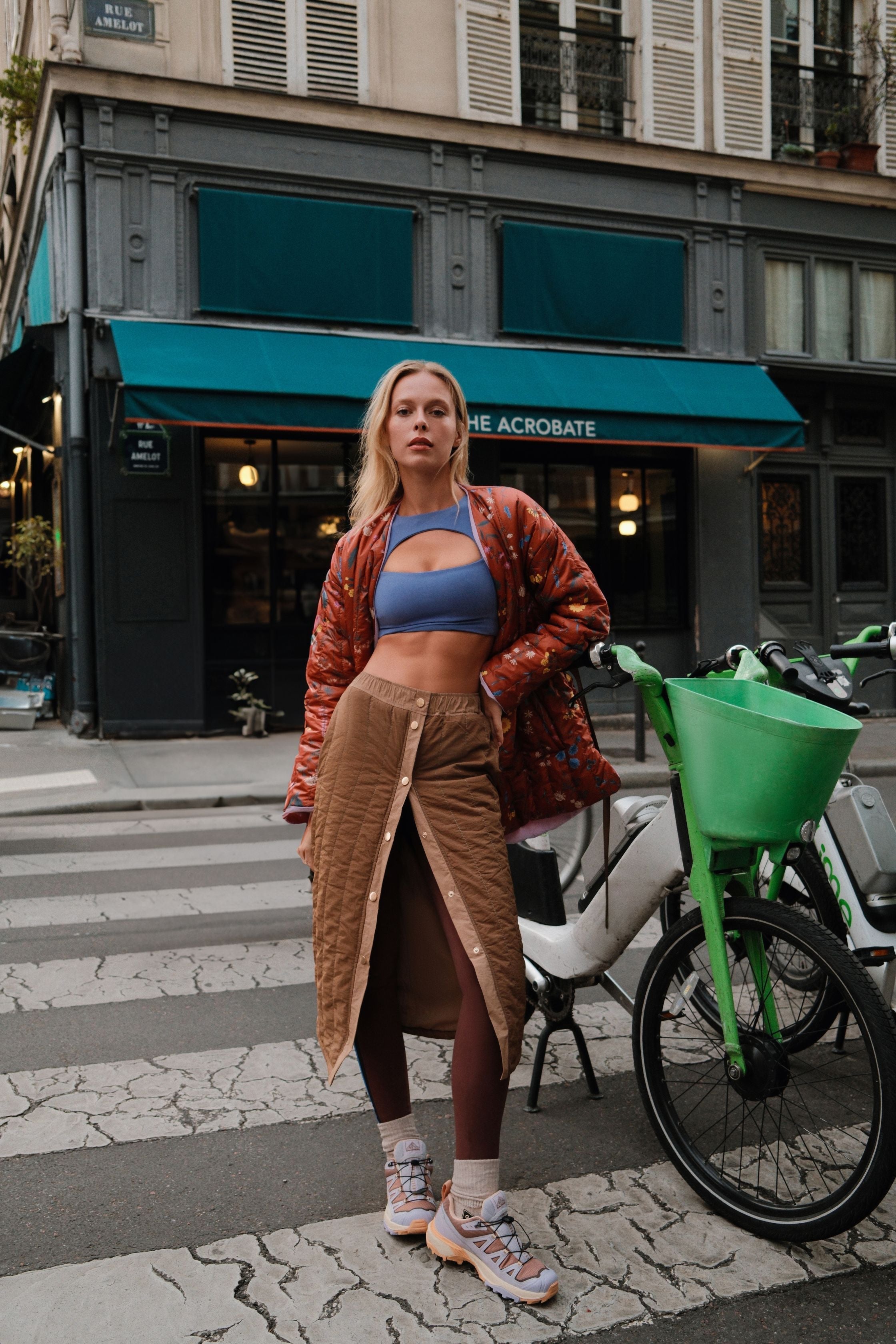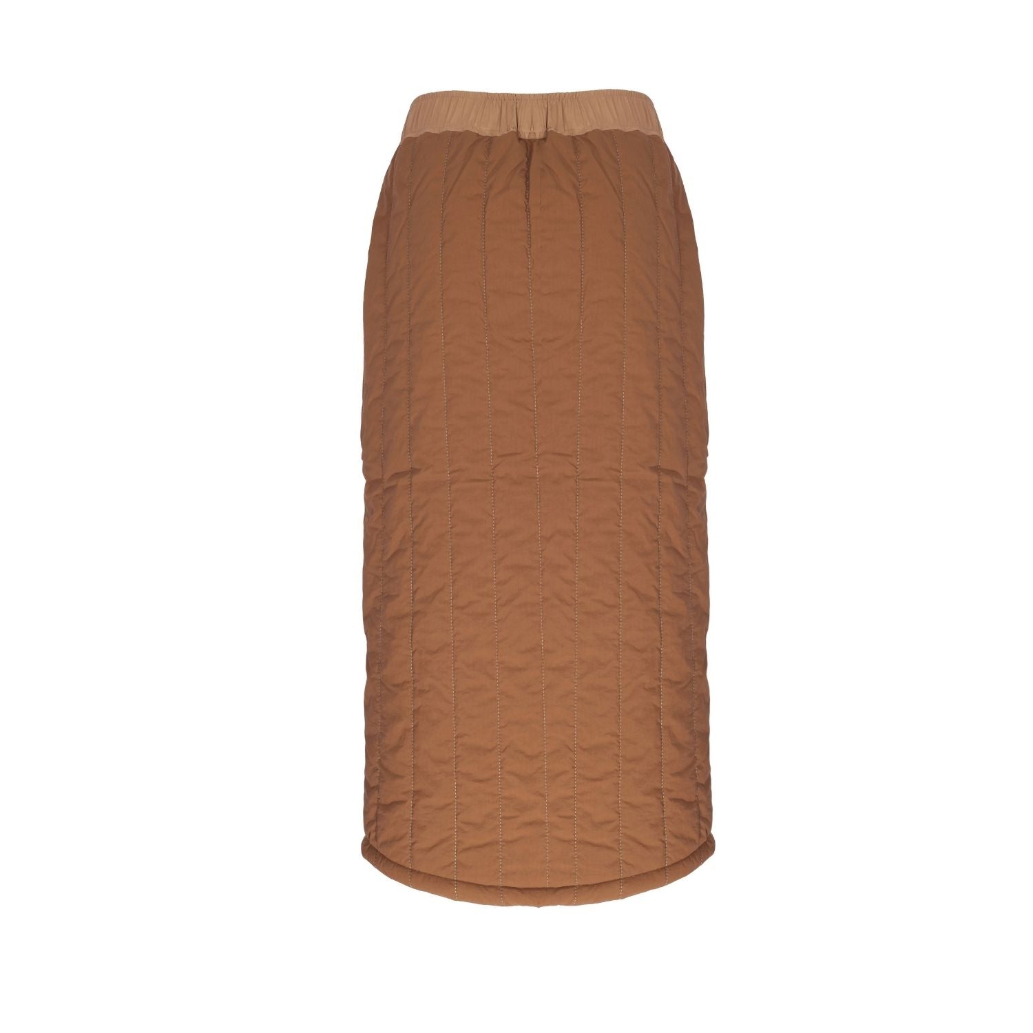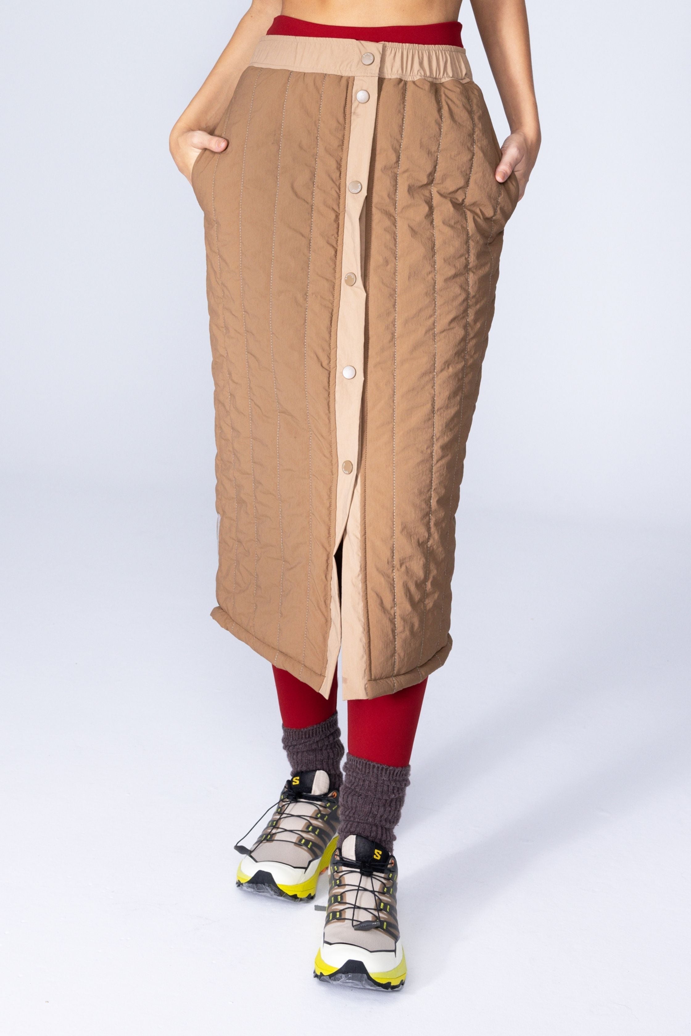This mid-length, pencil-style puffy skirt is made from coat fabric and combines both comfort and functionality for cold weather. With its insulated structure, it keeps you warm. The elastic waistband offers a comfortable fit, and the front buttons can be left open to any desired length.