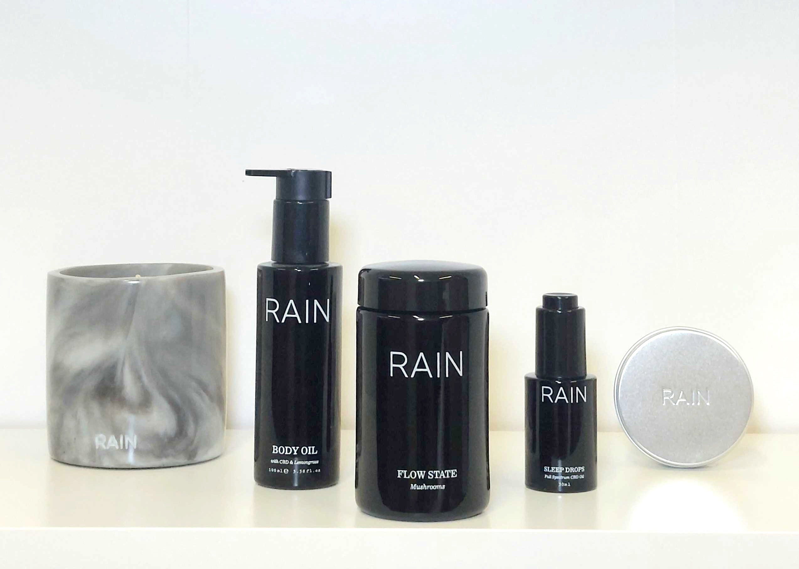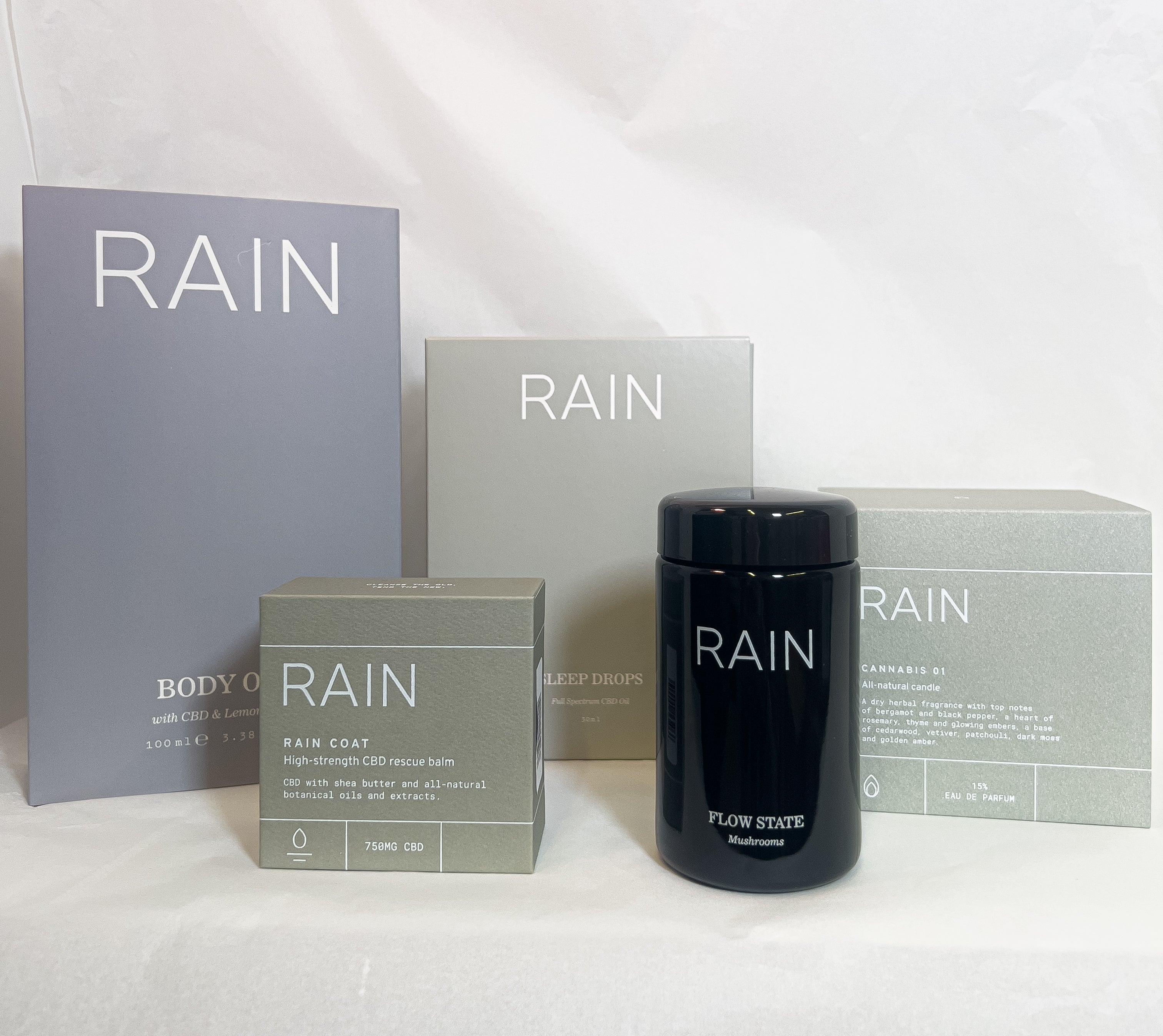 Our Wellness Collection Gift Set includes our hero products, Flow State Mushrooms Welcome Pack, Candle 01, The Body Oil, RAIN COAT CBD Balm, and a new, limited product, RAIN Sleep Drops.