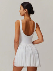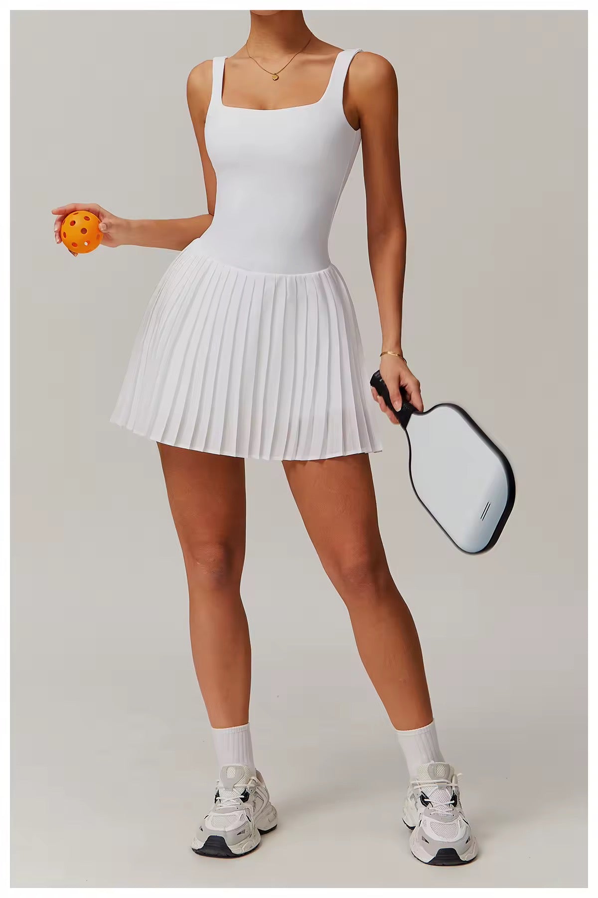 Experience ultimate comfort and support on the court with our white tennis dress. Made with Belsize custom Hydrasculpt fabric, this dress features a sports padded top and shorts with a side pocket. Perfect for any match, stay cool and confident while playing in style.