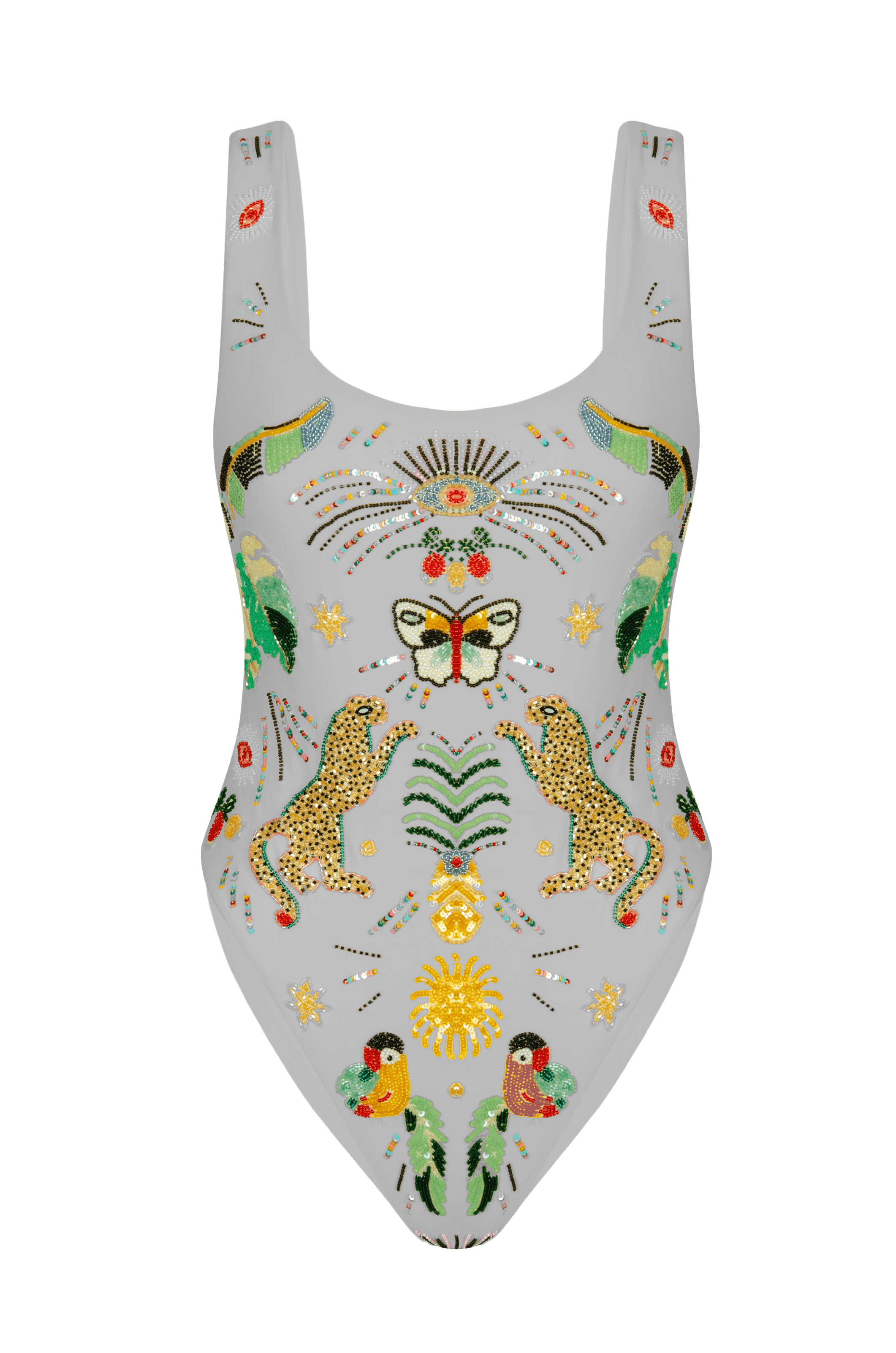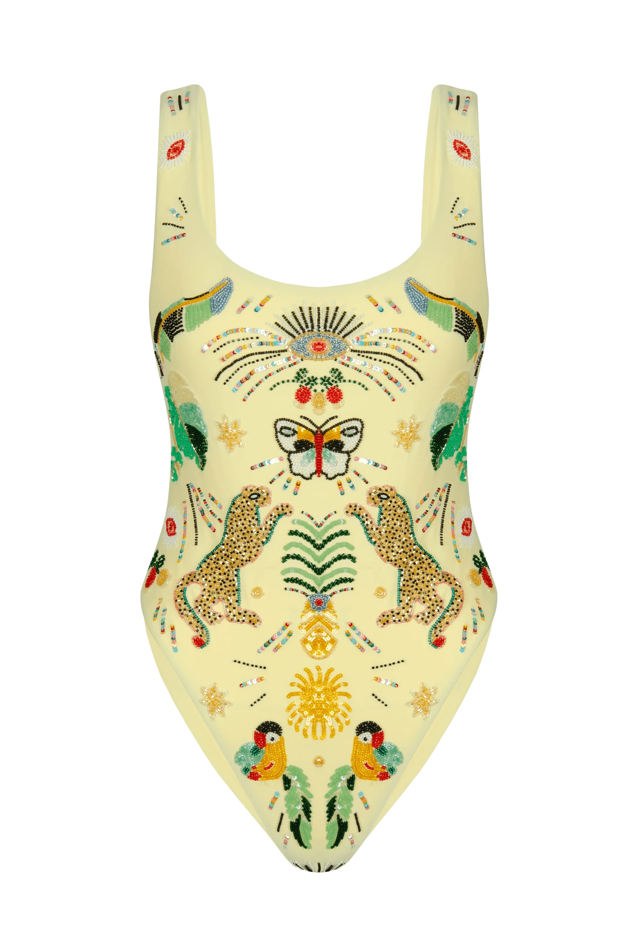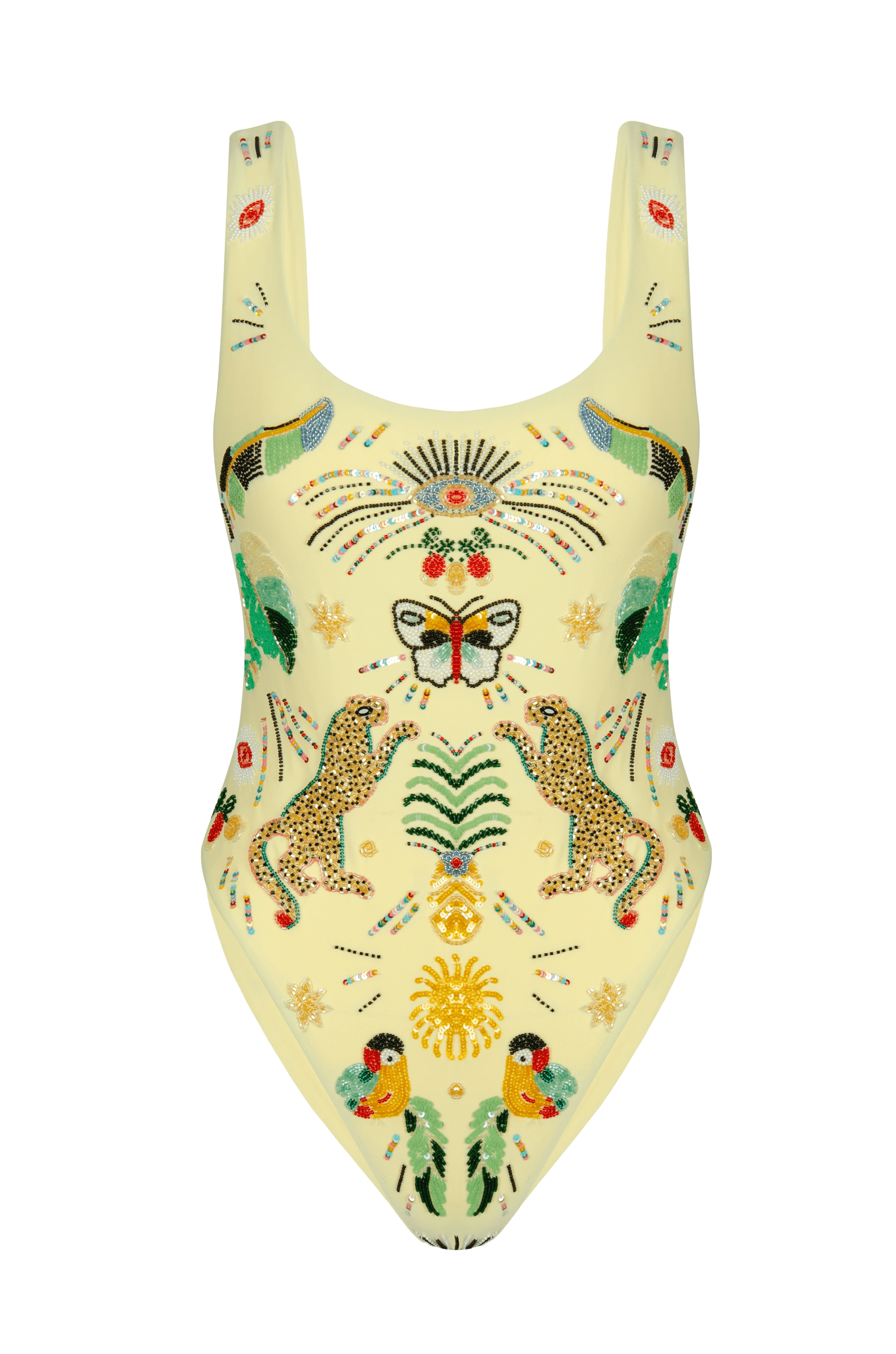 Inspired by our founder's new tropical home in Bali, WILLOW is our new signature swimsuit for the season. WILLOW features hand-embroidered tropical elements on an eco-friendly, pale yellow nylon base.