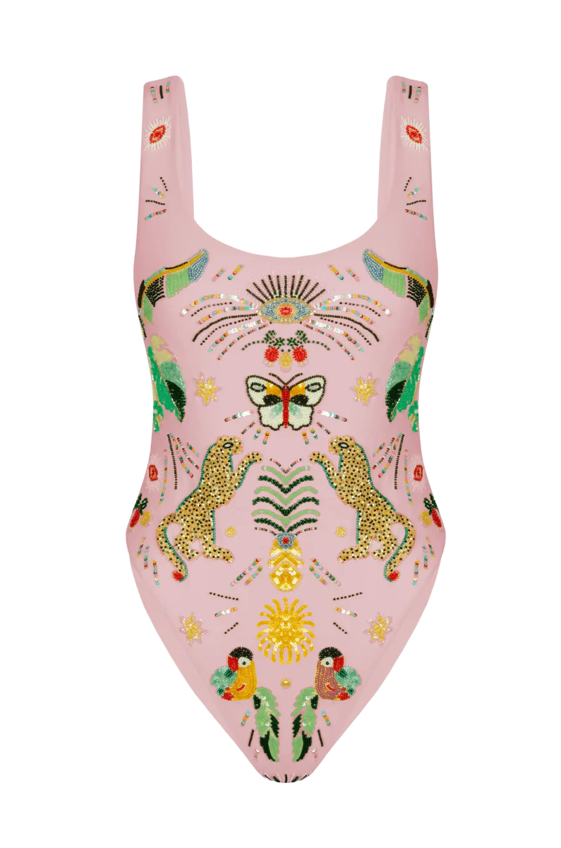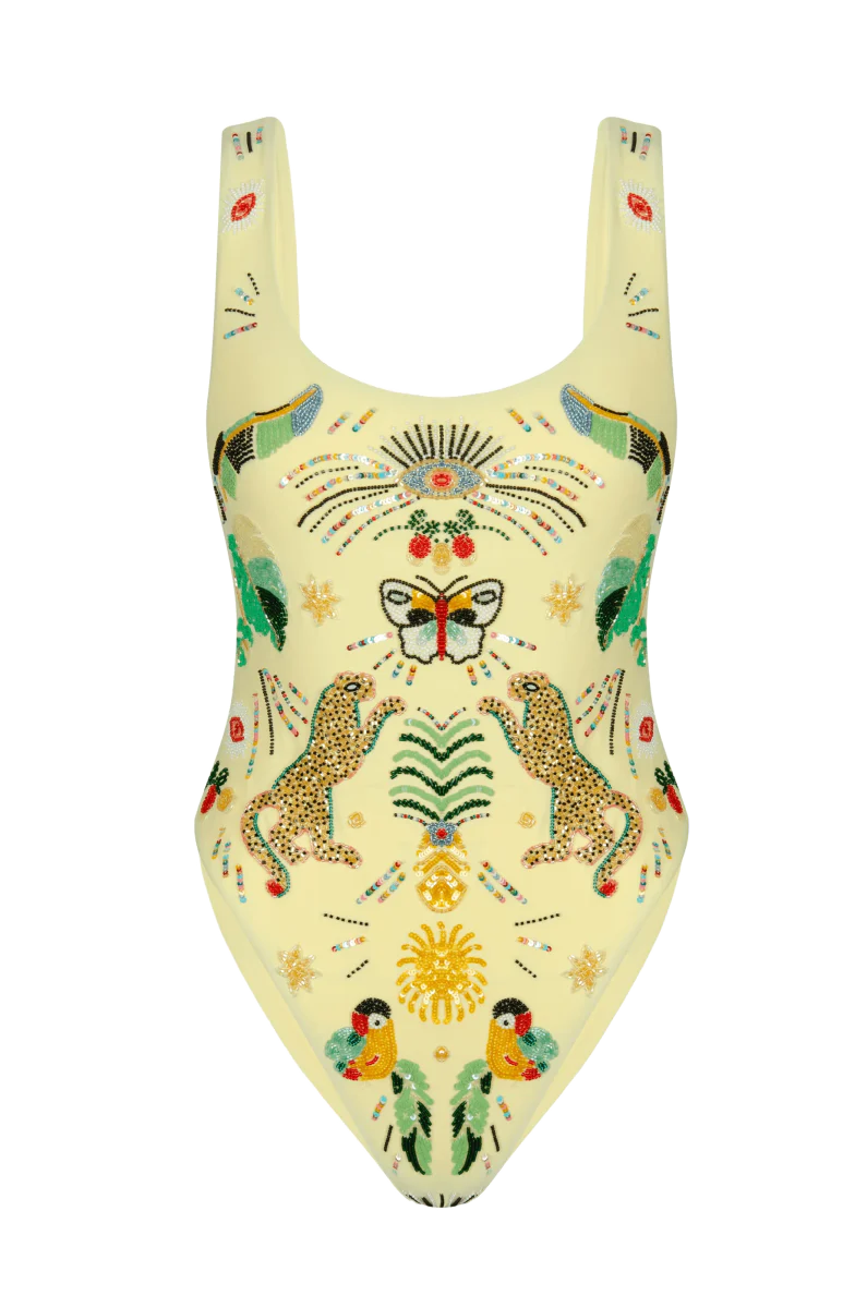 The Willow Hand Embroidered Swimsuit in pale yellow is inspired by Bali’s tropical beauty. Made from eco-friendly Italian lycra, it features intricate hand-embroidered tropical designs with a low coverage fit. A signature luxury swimwear piece perfect for resort wear, tropical vacations, and chic poolside style.