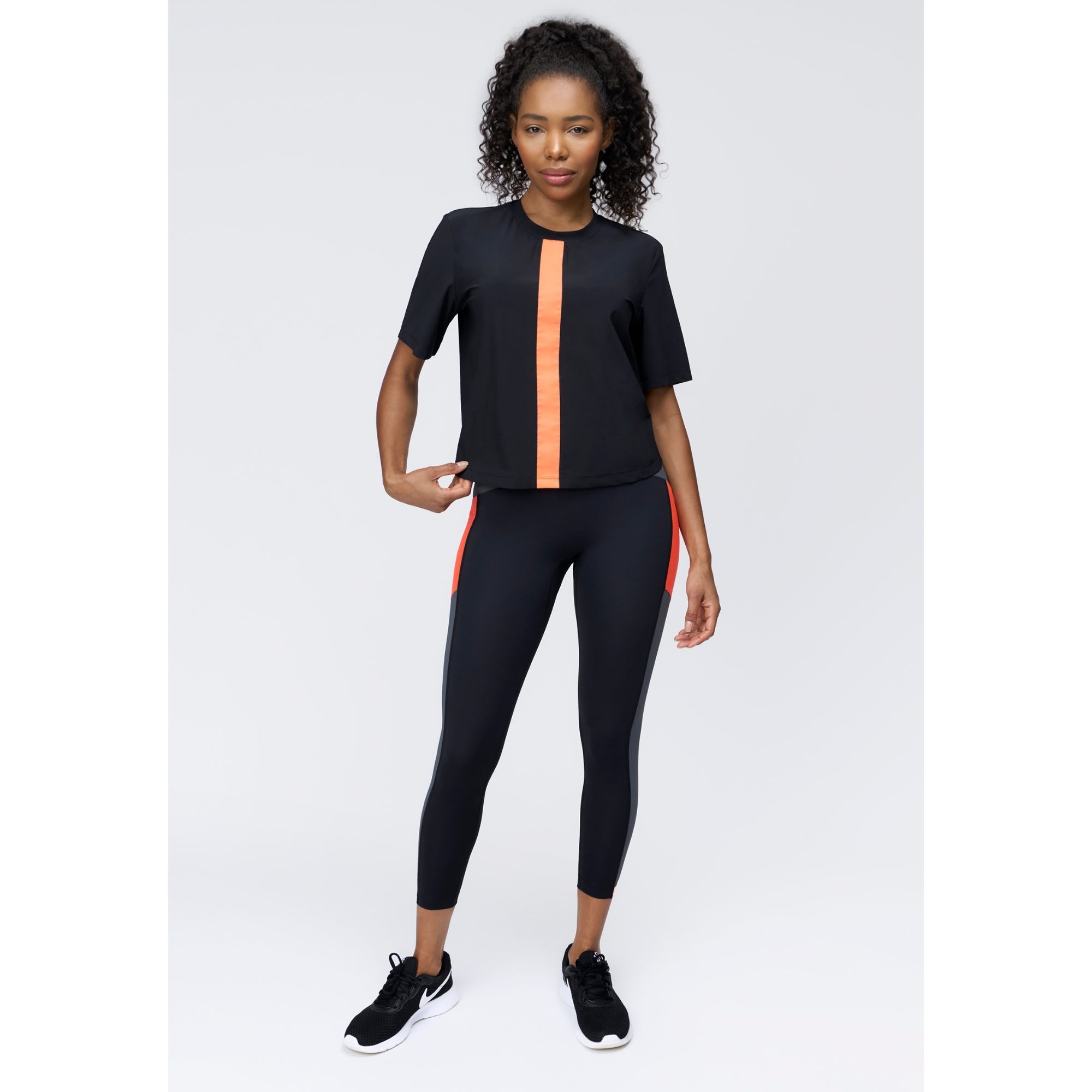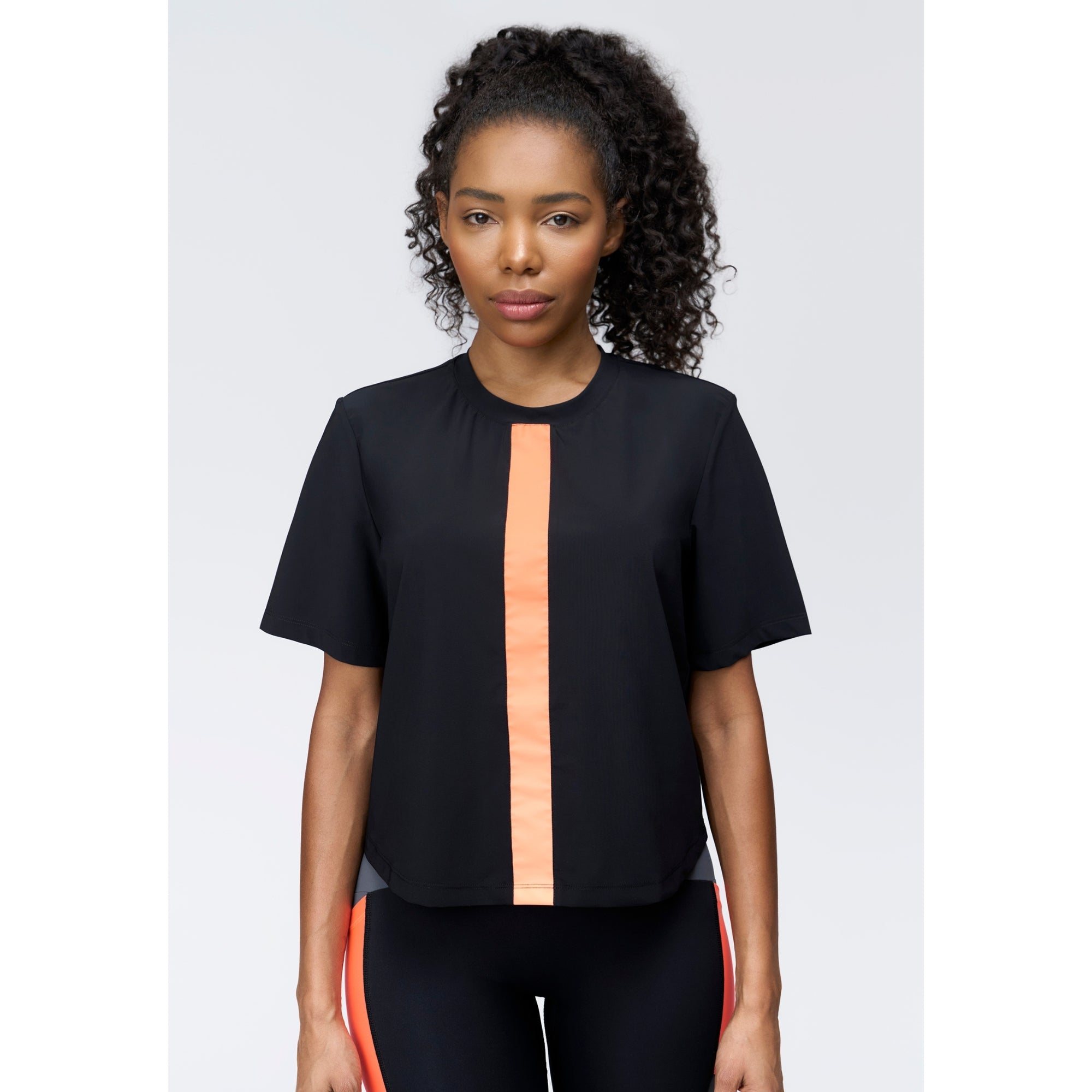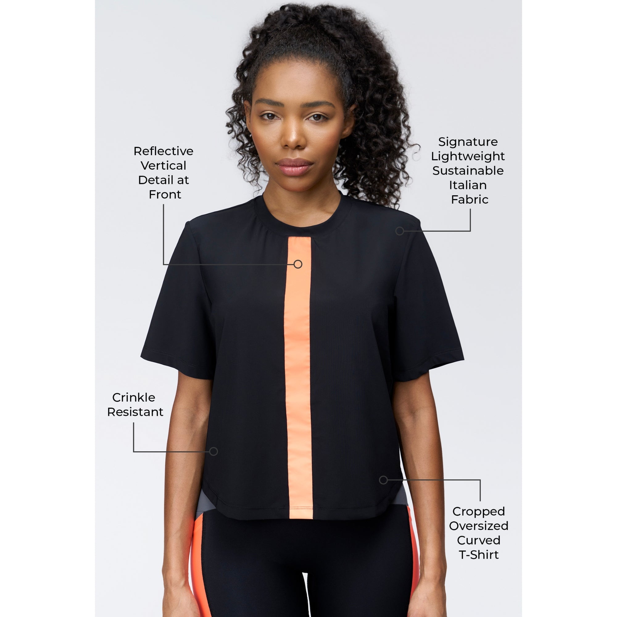 A lightweight oversized tee, the Wondai T-Shirt features a cropped silhouette for easy styling over leggings, shorts and denim. Created as an easy on-off layer to effortlessly pair with active pieces in the collection. Made from Italian Parigi fabric - a soft, breathable bielastic featuring 96% recycled nylon. A reflective vertical stripe at centre front and mesh vertical at the back add airflow and low-light visibility. A modern feminine crewneck tee for active and all-day wear.