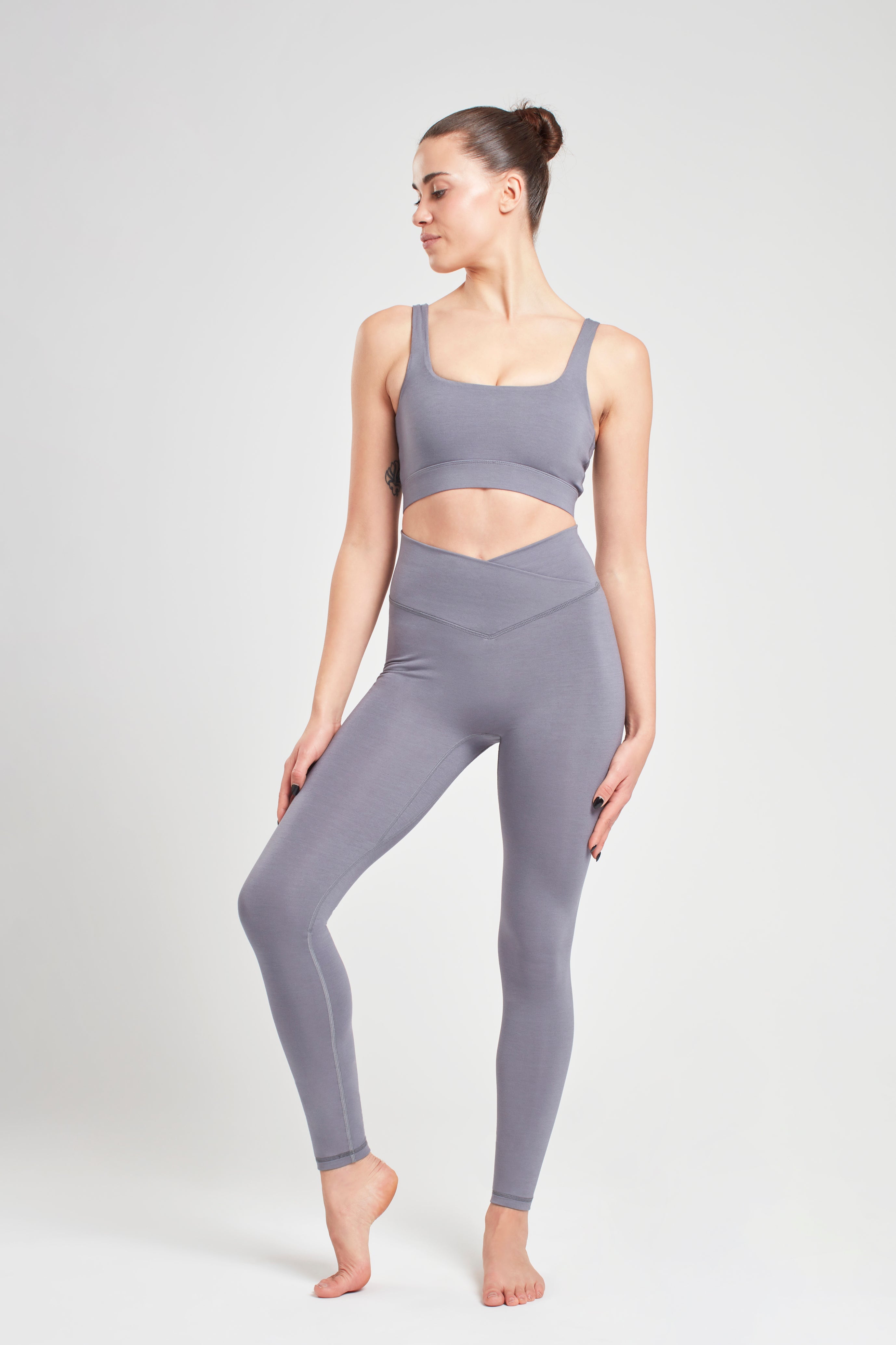 Sōma Wrap Leggings. Silver. High performance fabric. High waisted. Comfortable. Stylish. Comfortable feel for loungewear. Well suited to yoga and Pilates.