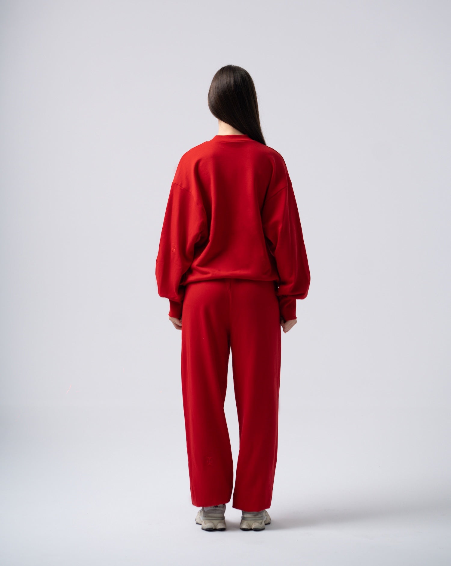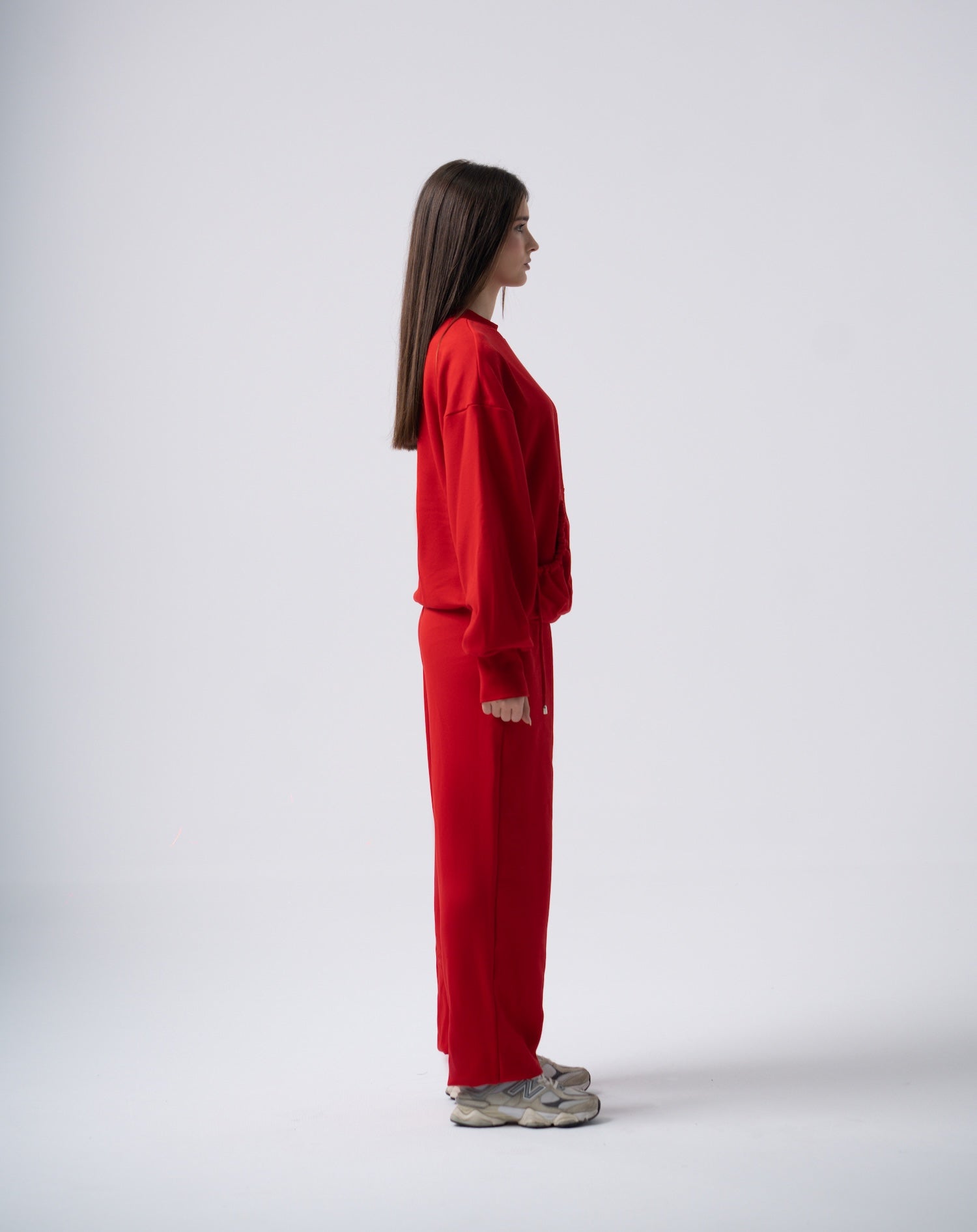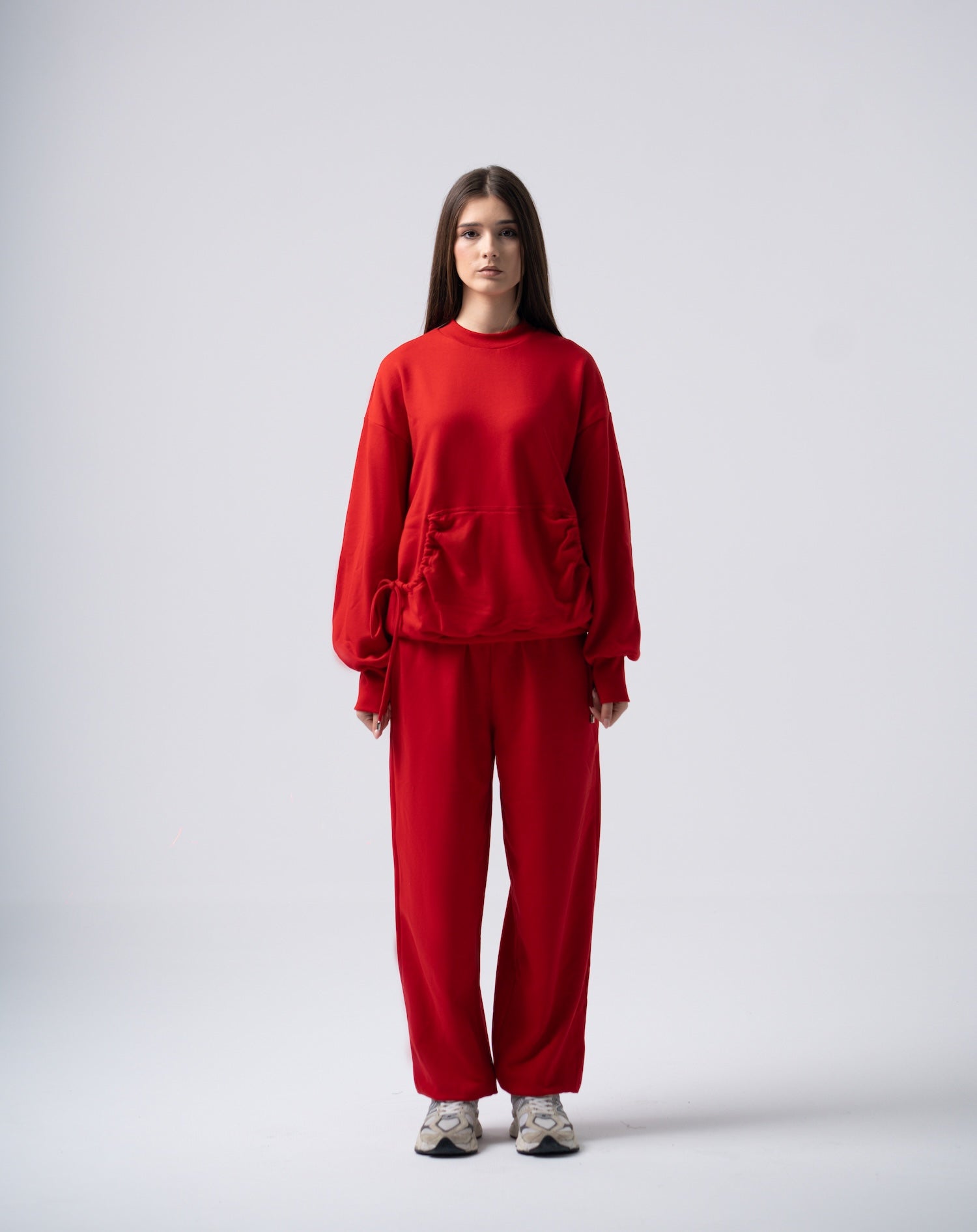 This sporty outfit consists of a long-sleeved top with a loose fit and gathered details on the sides of the pockets. The pants are wide and straight, gathered at the bottom, offering comfort and freedom of movement. The entire set has a minimalist and modern style, suitable for everyday wear or casual occasions. \n