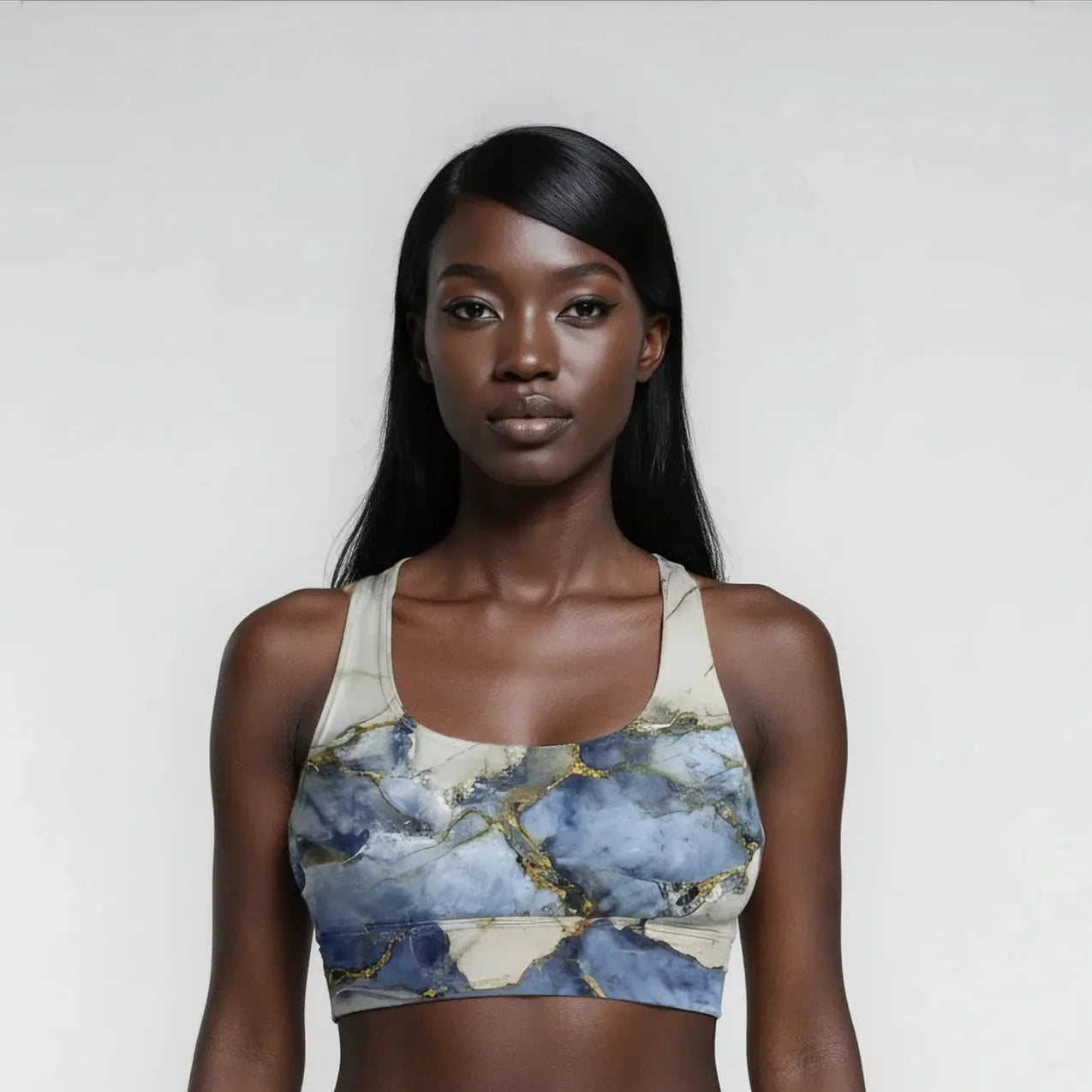 This marble yoga bra brings art and flow together — soft swirls of blue, white, and gold create a calm yet powerful look that moves with your energy. Made from breathable, stretchy fabric, it supports your practice while feeling light and effortless against the skin.