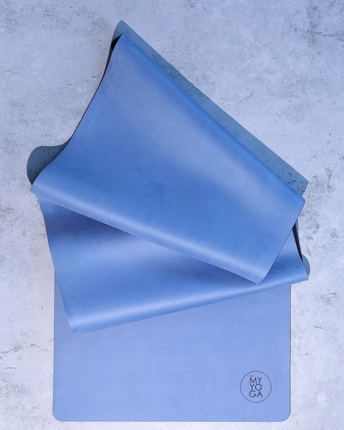 Our mats are made of natural rubber with a top layer of vegan suede. The suede’s layer of the yoga mat ice blue gives you a grip like a towel but not the “mess” from a towel, the more you sweat – the better the grip. The natural rubber provides the ultimate grip on the floor. Easy to clean with a soft cloth and water. Washable in cold water, mild detergent and no bleach.