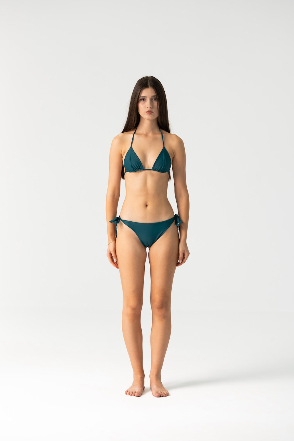 The bikini top features a classic triangle shape with thin straps that tie at the neck and back, offering an adjustable and timeless fit. The bottom comes with side ties for a customizable fit and a playful, feminine touch.