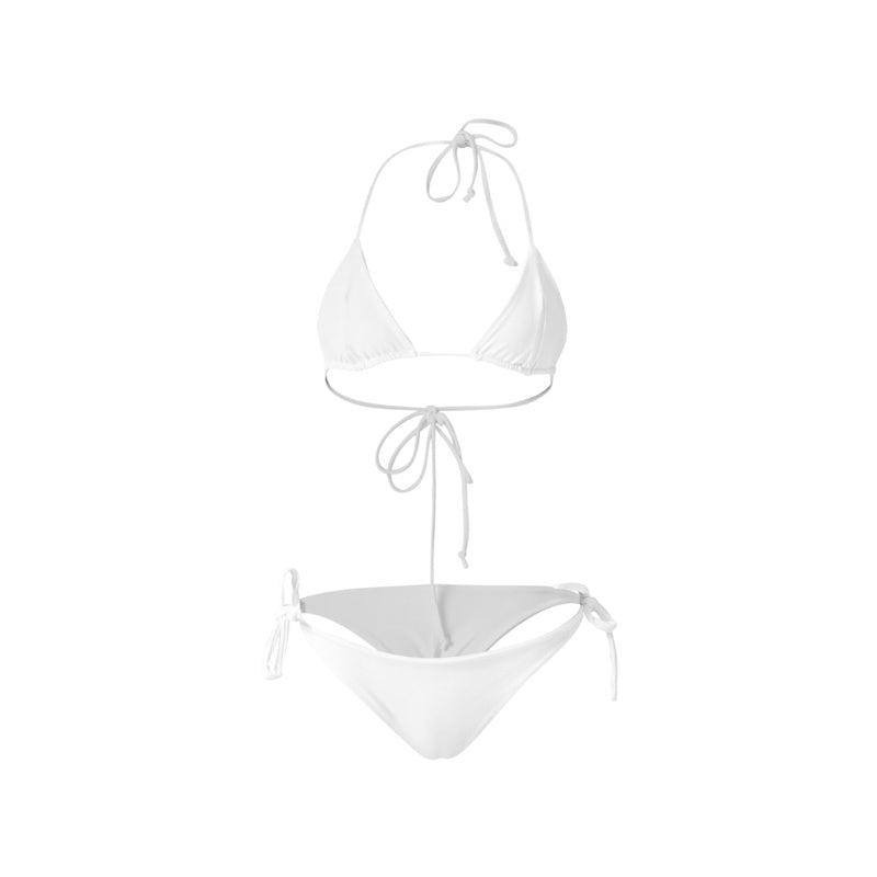 The bikini top features a classic triangle shape with thin straps that tie at the neck and back, offering an adjustable and timeless fit. The bottom comes with side ties for a customizable fit and a playful, feminine touch.